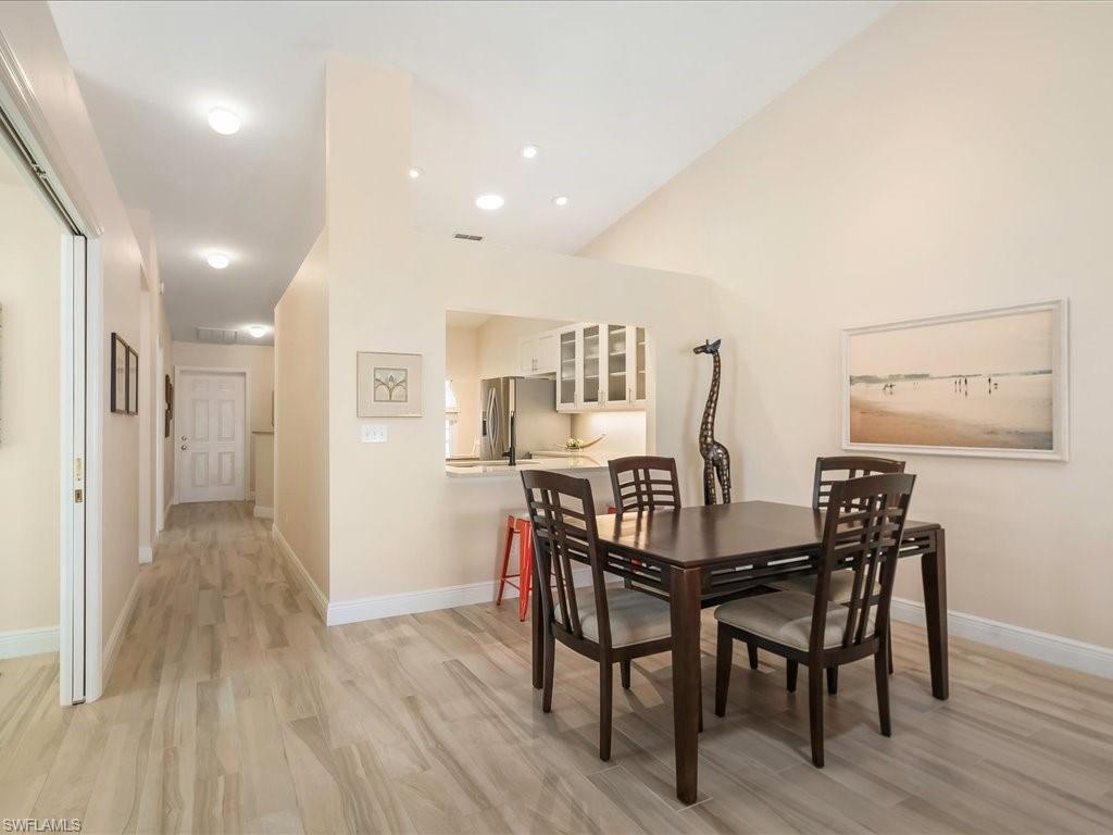 With over $125,000 in extensive improvements, this three-bedroom end unit villa has been totally renovated and lives like a single family home without all the maintenance. It is light, bright and move-in ready. Great room floor plan with soaring ceilings and a long list of extensive updates include newer TILE ROOF, HURRICANE IMPACT WINDOWS, HVAC, APPLIANCES, WATER HEATER, PLANK TILE FLOORING THROUGHOUT, FULLY RENOVATED KITCHEN, UPDATED BATHROOMS, PLUMBING LINES, HUNTER DOUGLAS WINDOW SHADES and the list would go on and on. Neutral color palate throughout. Split bedroom floor plan. The guest suite has direct access to a full bath and could be a second primary suite. Also, corner lot, private entrance, EXTENDED screened lanai with u201cno see umu201d screening and attached two car garage with hurricane impact rated door and extra storage in the garage attic. Prime North Naples West of 41 location close to beaches, golf, dining, shopping, entertainment, gulf access, and more. Great location with the complex just a short stroll from the heated pool and across from the Tarpon Cove Yacht & Racquet Club (optional membership) with clubhouse, pool, tiki bar, fitness center, tennis courts, wellness classes and water taxi beach shuttle. The low association fee includes insurance on the building, roofs, exterior paint, landscaping, irrigation, reserve, professional management and Summit fiber optic (cable TV and internet.) There are also boat slips for sale or lease offering direct gulf access. This is a very quality, impeccable residence with absolute pride of ownership. According to the Seller, this property has never flooded in their 15 years of ownership.