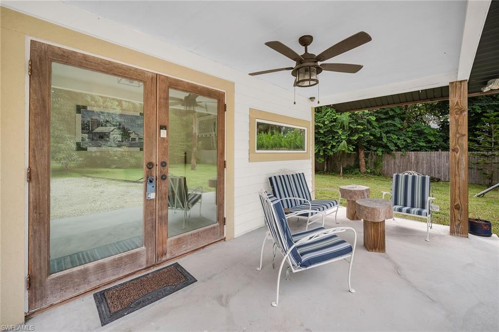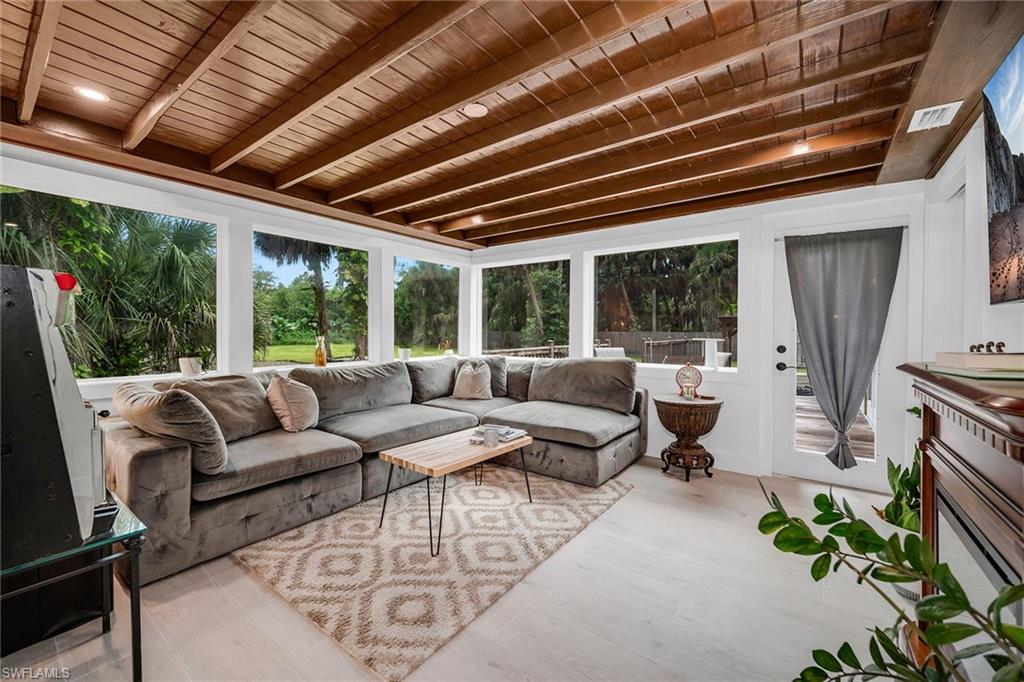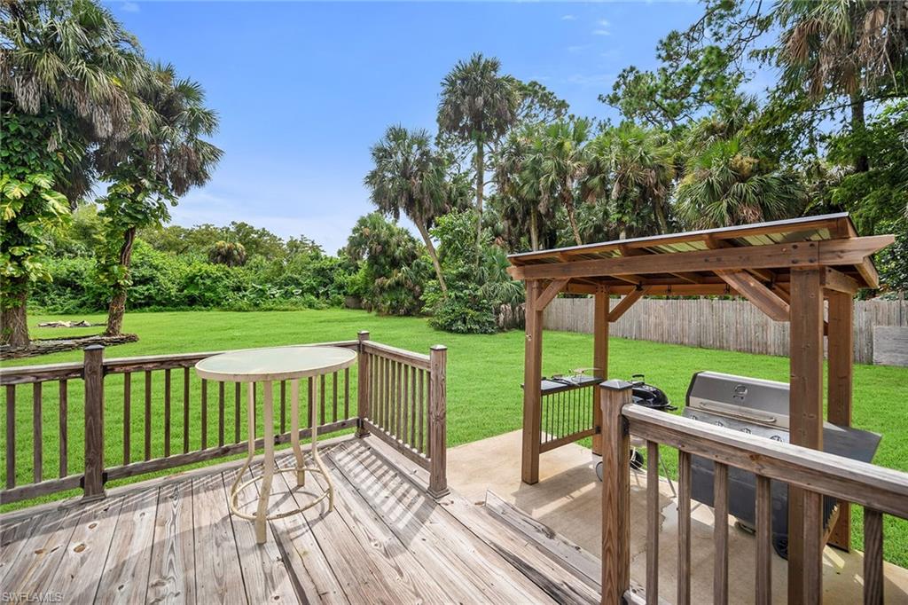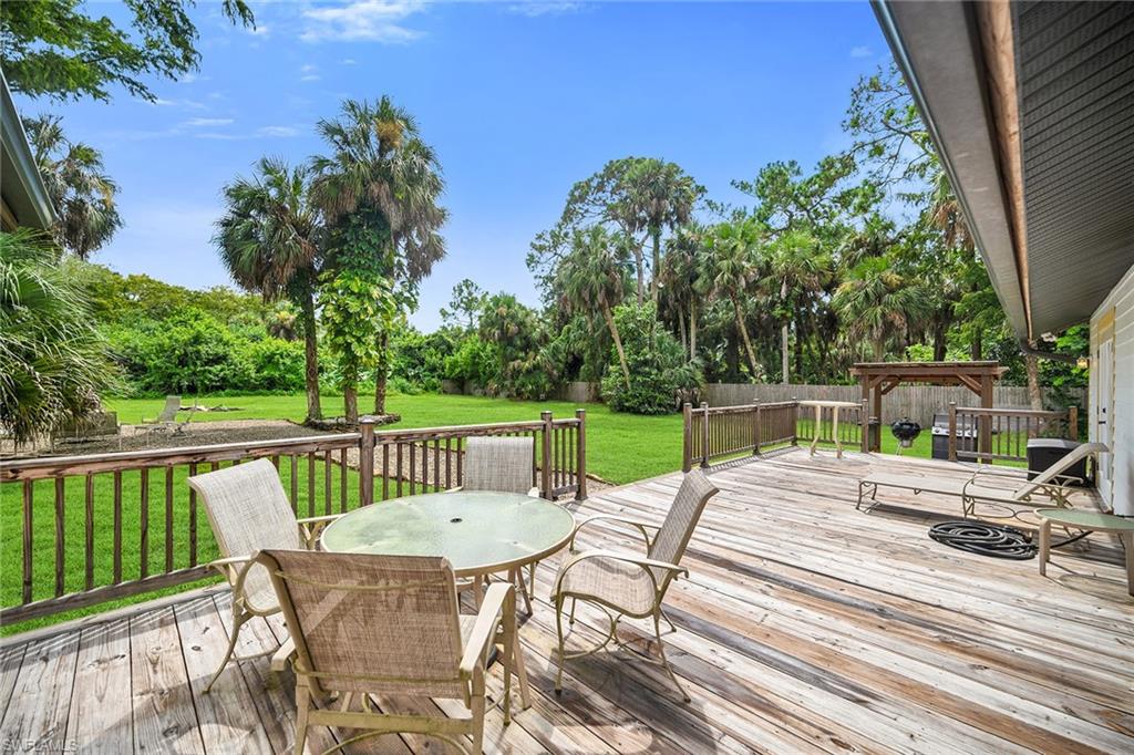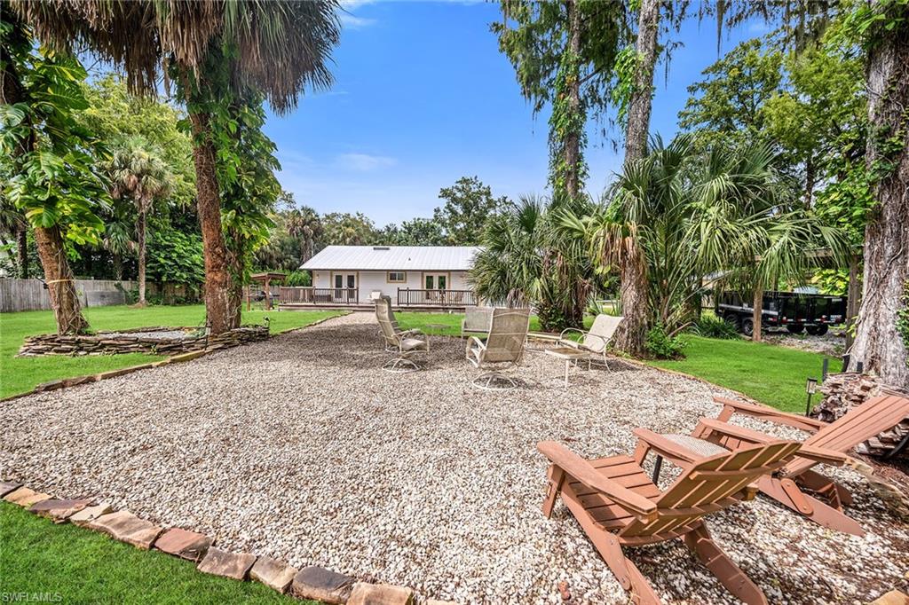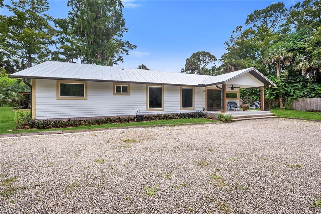 Check out this home in paradise! You wonu2019t want to miss the opportunity to own this beautifully remodeled and updated residence, tucked away on 1.25 acres of private, lushly landscaped grounds in Golden Gate Estates. Positioned just two miles from Immokalee Road and Collier Boulevard, this property offers privacy and convenience, with Publix, CVS, Walgreens, NCH hospital, restaurants and shopping just minutes away. Designed for those who love nature and outdoor living, the home features an expansive new deck, outdoor patio with fire pit, covered barbecue area and fruit trees, creating a serene retreat where every room enjoys garden views. This spacious three-bedroom plus den, three-bath home offers approximately 1,800 square feet under air with a flowing open concept floor plan, abundant natural light, and large windows framing peaceful greenery. Completely renovated with new wood-look tile flooring and a new waterproof subfloor, upgraded baseboards, and a new reverse osmosis system, the home blends modern updates with a relaxed, farmhouse-inspired charm. The den, set up as a family room, boasts a wood-plank ceiling, walls of windows, and direct access to the deck and backyard, and is conveniently served by a full bath with a walk-in shower, making it a flexible living space or private guest retreat. The upgraded kitchen is a showstopper, featuring crisp white cabinetry, quartz countertops, a tile backsplash, recessed lighting, pantry, island with bar seating, and new KitchenAid stainless steel appliances including electric cooktop, built-in wall oven, microwave, dishwasher, and refrigerator with icemaker. French doors in the adjacent dining area open seamlessly to the deck for easy indoor-outdoor entertaining. The owneru2019s suite provides a private sanctuary with direct deck access, a walk-in closet with built-ins and bonus storage room, and a spa-like en-suite bath with dual quartz vanities, a walk-in shower with bench, multiple shower heads and frameless glass. Two guest bedrooms share a beautifully updated bath with dual sinks and a tub-shower combo. A dedicated laundry room adds convenience with newer Maytag washer and dryer, a utility sink and overhead cabinets for extra storage. Exterior features include a new metal roof, a covered concrete front porch with ceiling fan overlooking the gardens, a covered outdoor sitting area, pole barn-style shed plus extra storage shed, and ample space to add a pool. Horses are welcome, and the property provides plenty of room to spread out and enjoy the natural surroundings. This property has been thoughtfully updated with countless improvements inside and out, offering the ideal blend of modern comfort and natural beauty, a retreat surrounded by nature yet close to everything Naples has to offer.