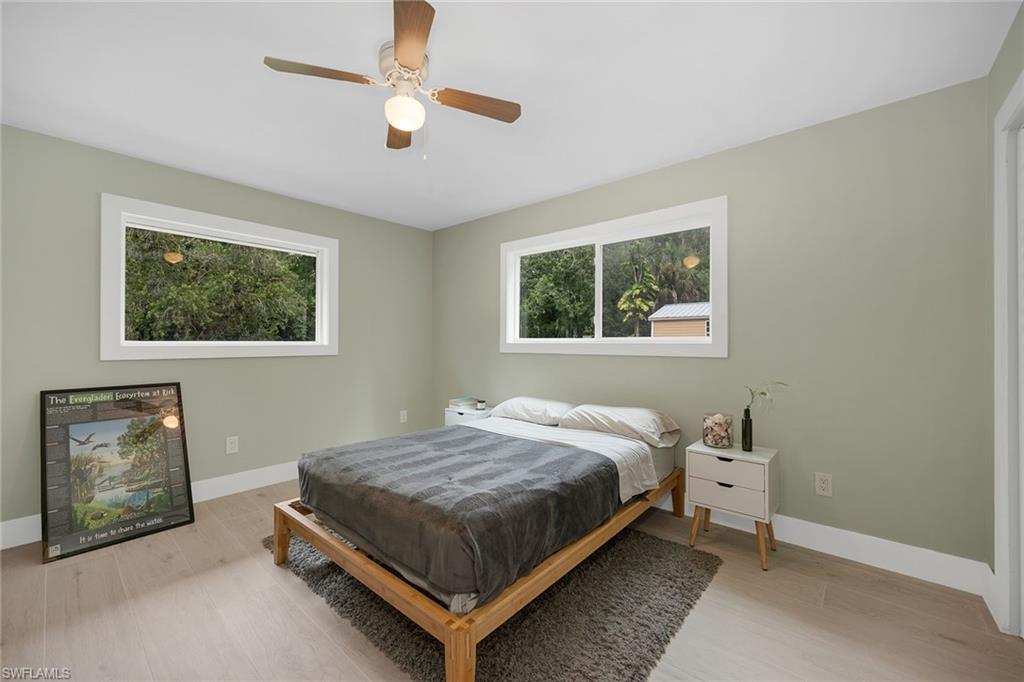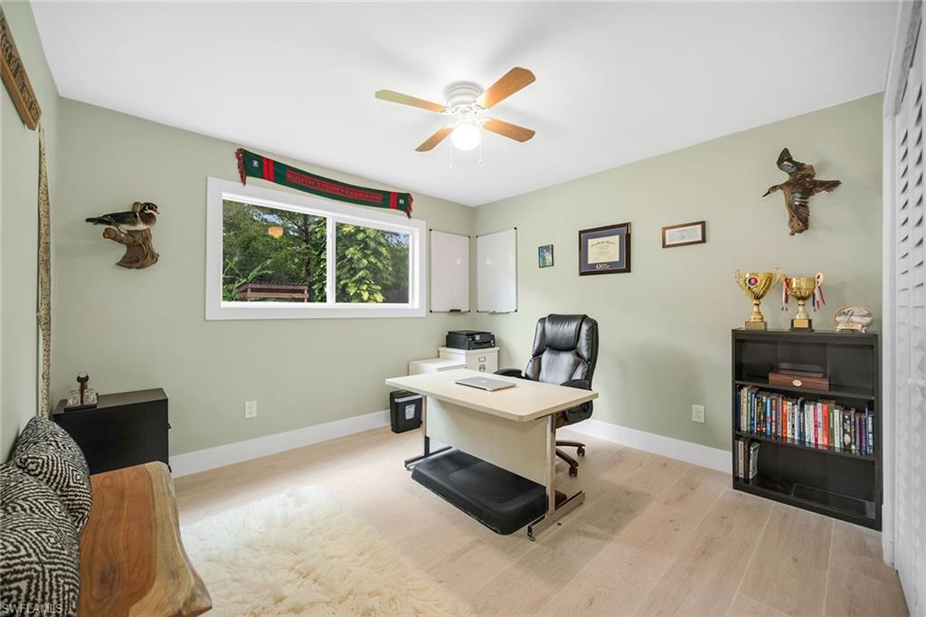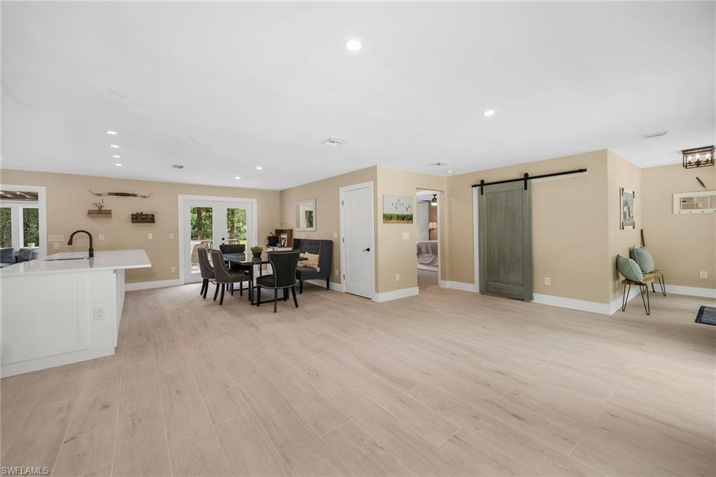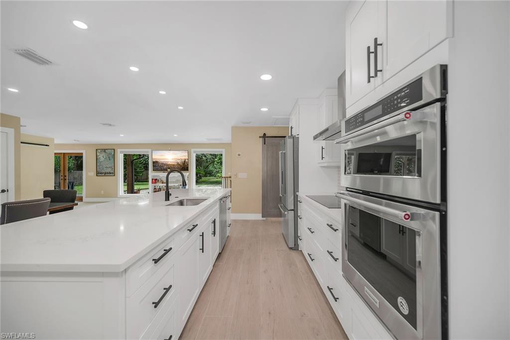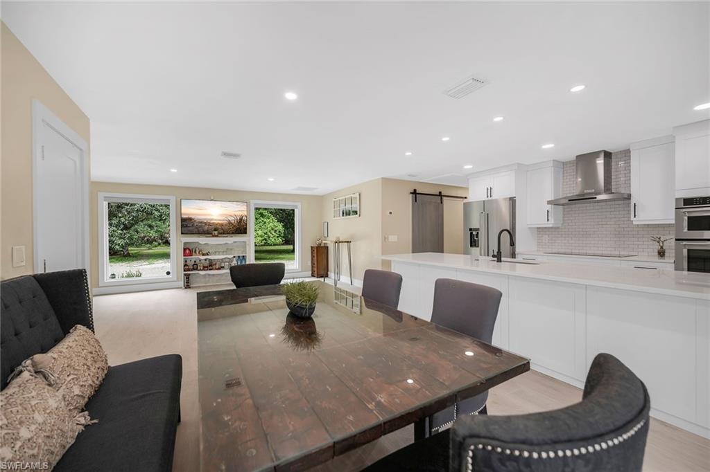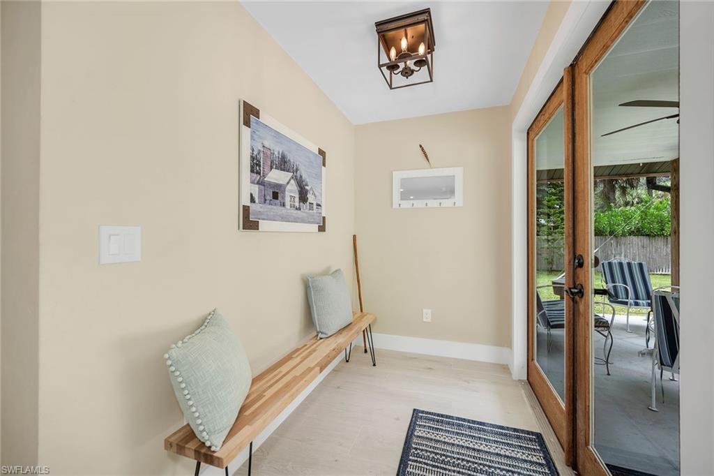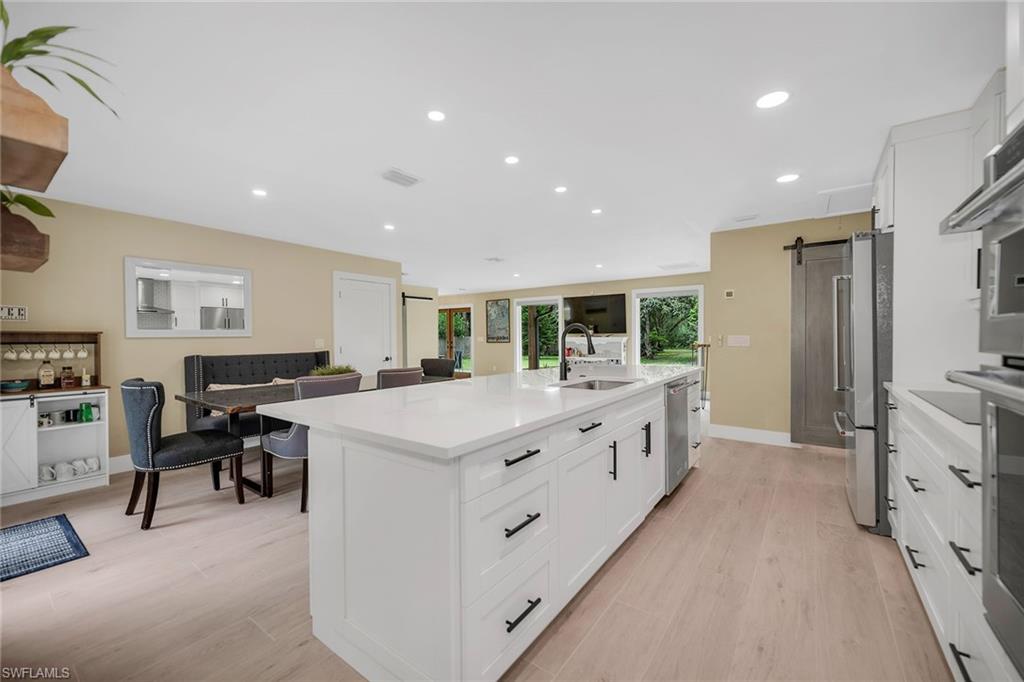 Check out this home in paradise! You wonu2019t want to miss the opportunity to own this beautifully remodeled and updated residence, tucked away on 1.25 acres of private, lushly landscaped grounds in Golden Gate Estates. Positioned just two miles from Immokalee Road and Collier Boulevard, this property offers privacy and convenience, with Publix, CVS, Walgreens, NCH hospital, restaurants and shopping just minutes away. Designed for those who love nature and outdoor living, the home features an expansive new deck, outdoor patio with fire pit, covered barbecue area and fruit trees, creating a serene retreat where every room enjoys garden views. This spacious three-bedroom plus den, three-bath home offers approximately 1,800 square feet under air with a flowing open concept floor plan, abundant natural light, and large windows framing peaceful greenery. Completely renovated with new wood-look tile flooring and a new waterproof subfloor, upgraded baseboards, and a new reverse osmosis system, the home blends modern updates with a relaxed, farmhouse-inspired charm. The den, set up as a family room, boasts a wood-plank ceiling, walls of windows, and direct access to the deck and backyard, and is conveniently served by a full bath with a walk-in shower, making it a flexible living space or private guest retreat. The upgraded kitchen is a showstopper, featuring crisp white cabinetry, quartz countertops, a tile backsplash, recessed lighting, pantry, island with bar seating, and new KitchenAid stainless steel appliances including electric cooktop, built-in wall oven, microwave, dishwasher, and refrigerator with icemaker. French doors in the adjacent dining area open seamlessly to the deck for easy indoor-outdoor entertaining. The owneru2019s suite provides a private sanctuary with direct deck access, a walk-in closet with built-ins and bonus storage room, and a spa-like en-suite bath with dual quartz vanities, a walk-in shower with bench, multiple shower heads and frameless glass. Two guest bedrooms share a beautifully updated bath with dual sinks and a tub-shower combo. A dedicated laundry room adds convenience with newer Maytag washer and dryer, a utility sink and overhead cabinets for extra storage. Exterior features include a new metal roof, a covered concrete front porch with ceiling fan overlooking the gardens, a covered outdoor sitting area, pole barn-style shed plus extra storage shed, and ample space to add a pool. Horses are welcome, and the property provides plenty of room to spread out and enjoy the natural surroundings. This property has been thoughtfully updated with countless improvements inside and out, offering the ideal blend of modern comfort and natural beauty, a retreat surrounded by nature yet close to everything Naples has to offer.