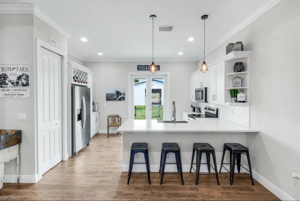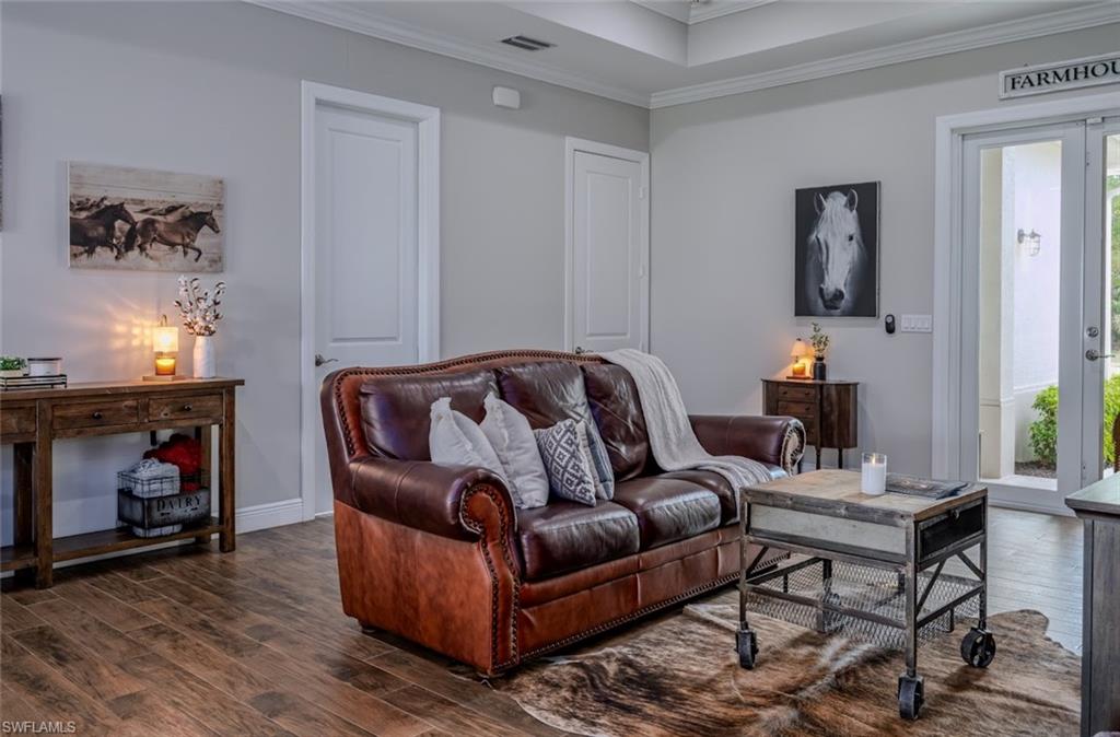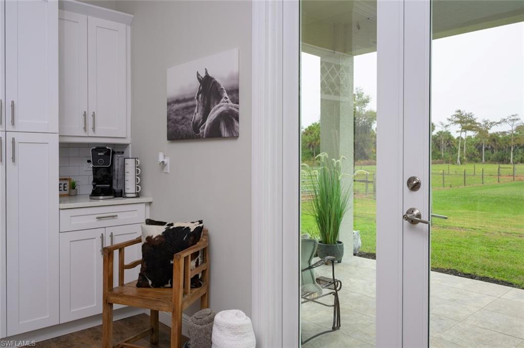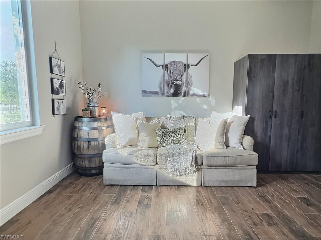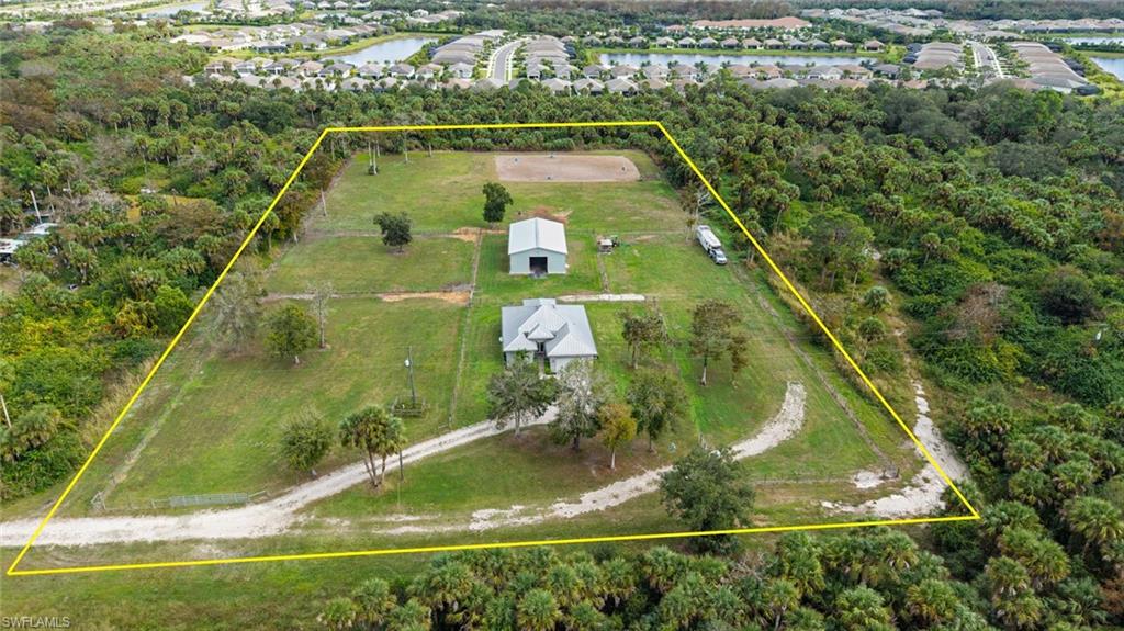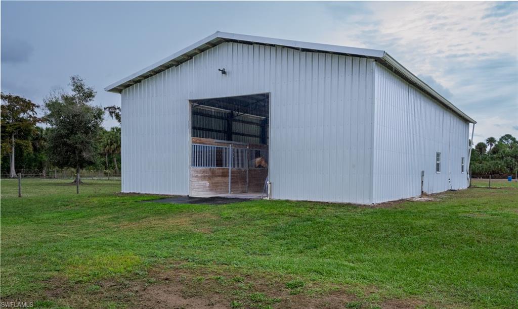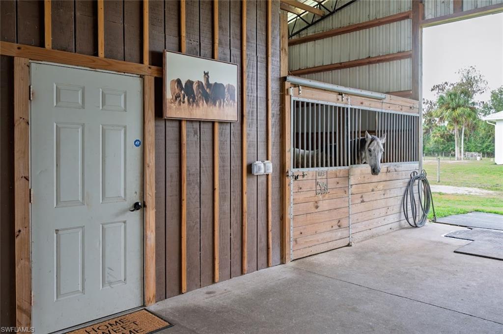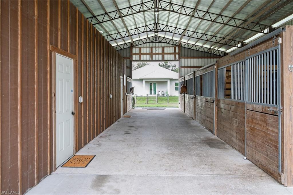 NORTH NAPLES, nearly **5 ACRES** IN TOWN!! PROPERTIES WITH THIS TOTAL PRIVACY **IN TOWN** DO NOT EXIST IN NAPLES ANYMORE, and there is NOTHING ELSE LIKE IT BEING OFFERED IN NORTH NAPLES. GORGEOUS TURNKEY FURNISHED HOME and HUGE 48x60 SHOP/BARN/OUTBUILDING. Live in total privacy with **NO NEIGHBORS IN SIGHT** yet have all the luxuries of town surrounding you? You've found it, and you won't find it anywhere else in this town. Behind you is a preserve separating you from the resort gated community of Valencia Trails, and in front of you is COUNTY PRESERVE that will never be touched. The result? Privacy that Naples can no longer offer. HOME is end of 2018 built, Concrete Block, ALL IMPACT GLASS DOORS AND WINDOWS, and LIFETIME STANDING SEAM METAL ROOF!!! This is a custom home - high ceilings with trays, minimum 10 foot and higher, custom crown molding/baseboards, wood plank tile flooring throughout, quartz countertops, farm sink, subway tile backsplash, shaker/soft close cabinets in kitchen, and river rock showers in spa-like bathrooms bring farmhouse style luxury and comfort. Enjoy serene views from your back French Doors, looking out to your barn and horse pastures. The property has in total 4 BEDROOMS PLUS DEN, 3 FULL BATHS, 2 CAR GARAGE. The Bonus Guest Apartment located in the barn is included in this count, having 1 bedroom, 1 bathroom, and its own kitchen and living area- perfect for In-laws, adult children, or guests. 48x60 BARN with concrete center aisle was built extra tall in case a future owner would want to convert it to RV storage or a shop! Horse stalls can easily be converted to parking space for someone that owns a business and needs to park machinery or trucks. In addition to the Barn Apartment for guests, in the barn there are 5 horse stalls, a storage room for Horse Feed or Tools, and a wash bay. There are 4 Separate Horse pastures, and a riding arena with groomed dirt. Property is Cleared, fenced, barn is gated and offers a separate driveway for your large equipment, horse trailers, trucks- no limitations to what you can store, park, and turn around here. Business owners, this is you! Live here and park your equipment here! BRAND NEW Water Softener System installed December 2025.