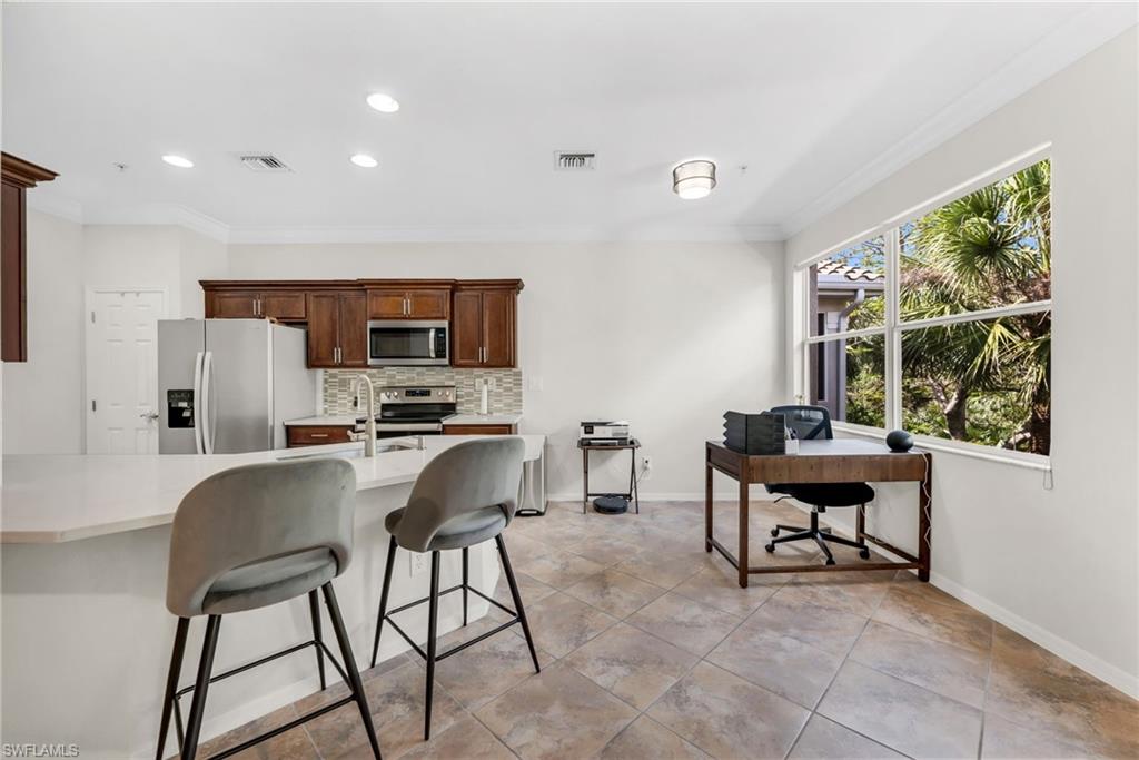 CLICK ON 3D TOUR!!! Step into this sun-drenched beautifully updated top floor home, located in Aviano, one of Naples' most desirable neighborhoods. Prepare to be impressed with what luxury resort living can be! This 2418 sq ft home features 3 Bed, 2 full baths, 1 car attached garage, oversized lanai with gorgeous preserve views. Spacious open white quartz kitchen has pantry, breakfast bar and separate breakfast area. Formal dining room and open living room are designed for entertainment and family gatherings. Kitchen and great room seamlessly connect to the expansive lanai. Largest owner's suite has a sitting area, massive walk-in closet. Spa like Master Bathroom features large tub and separate shower. Spacious 2nd and 3rd bedrooms have good closet space. Top tier amenities include community pool, hot tub, clubhouse with gym and party room, boardwalk, all steps from this house. Coveted gated neighborhood of Aviano provides a luxury secure maintenance free lifestyle in a wooded setting with mature Oak and Royal Palm trees, 10 min driving to sandy gulfshore beaches and 5th Ave, A+ rated North Naples schools, great shopping and dining, the best of Naples at your fingertips. Strictly no pets. Long-term lease only. Furnished. Rent includes Xfinity cable and Internet, water, trash removal. Tenants pay only electrical bill. Don't just take it from us: watch the video and experience this lifestyle for yourself