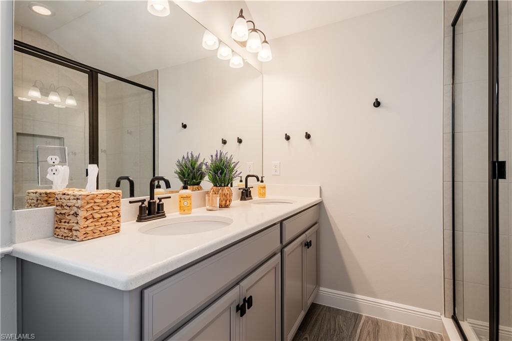 Rare Opportunity! Final Home in Naples Community Built in 2023! This stunning and spacious 4,651 sq. ft. residence is the LAST homeconstructed after neighborhood completion in this sought-after Naples community. 5 BED + Den 4 FULL Baths and 2 Half Baths. Home boasts over $350,000 in PREMIUM UPGRADESthroughout. Designed with LEVEL 5 TOP-GRADE FINISHES including wide plank tile flooring throughout and elegant 3` QUARTZ countertops inkitchen and bathrooms. Large walk-in closets with CUSTOM SHELVING SYSTEMS in all bedrooms. All high-end modern sophistication hardwareand plumbing fixtures throughout. MASSIVE 3,456 sq. ft. of living area is located on the first floor alone, featuring wide open living spaces anda luxurious first-floor primary suite and a total of 4 bedrooms on main flooru2014a highly desirable layout including a GAME ROOM and PRIVATEADDITIONAL ENSUITE upstairs. 3 total ensuite bedrooms, 2 jack and jill, and a visitor u00bd bath on each floor. Additional den has been completelyopened up for use as a spacious FORMAL LIVING ROOM. Set on a UNIQUE DOUBLE LOT backing up to a serene wooded preserve, this homeoffers both PRIVACY and SPACE. Upgraded EXTENDED LANAI with coral stone pavers inside FULLY FENCED YARD. Additional highlights: Highimpact, 3-panel sliding doors that bring the outdoors in. EXTRA-LARGE LOT, perfect for a future pool while still maintaining a generous yard.Extended long and wide driveway, ideal for guest parking. NO FLOOD ZONE! No flood insurance required. Donu2019t miss this rare opportunity toown the final newer construction home in this beautiful community!