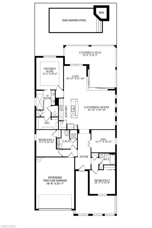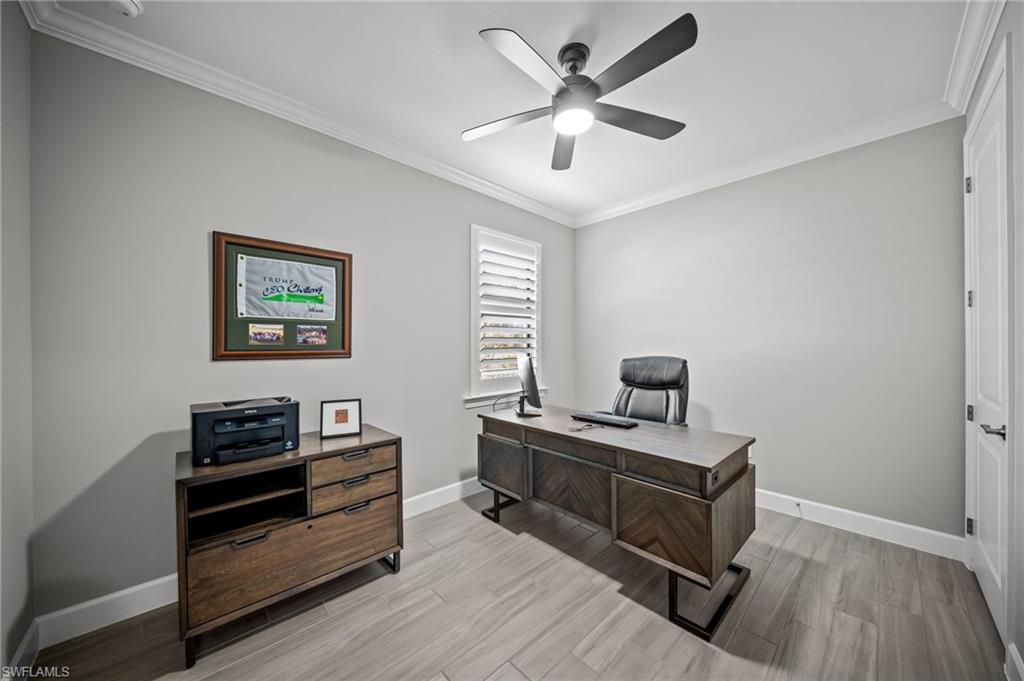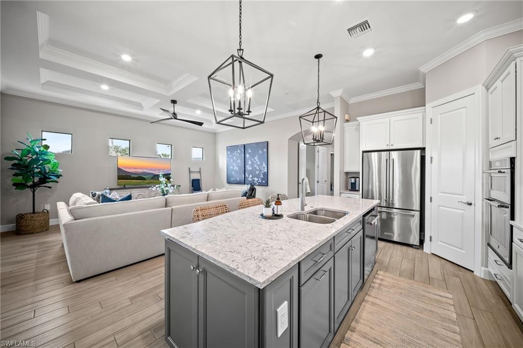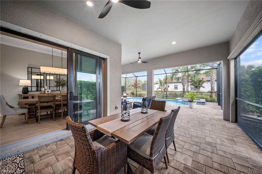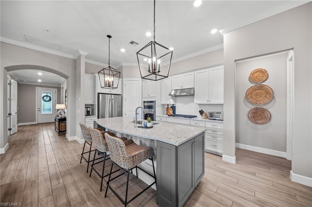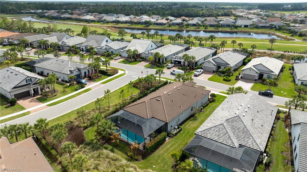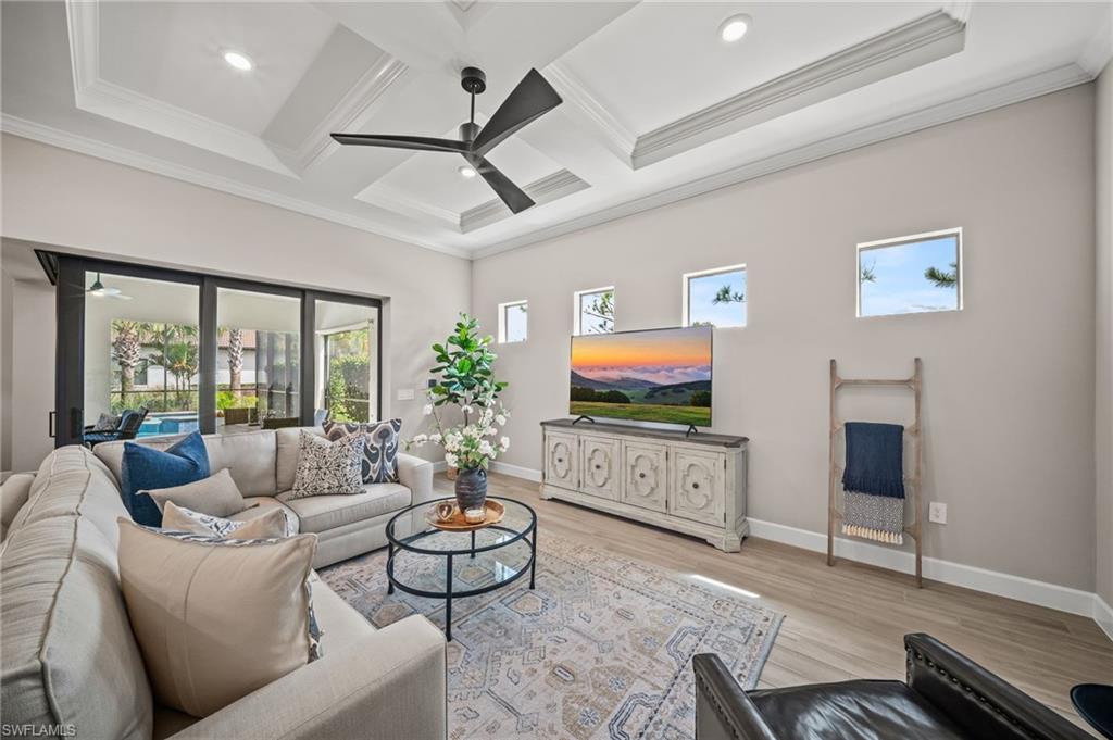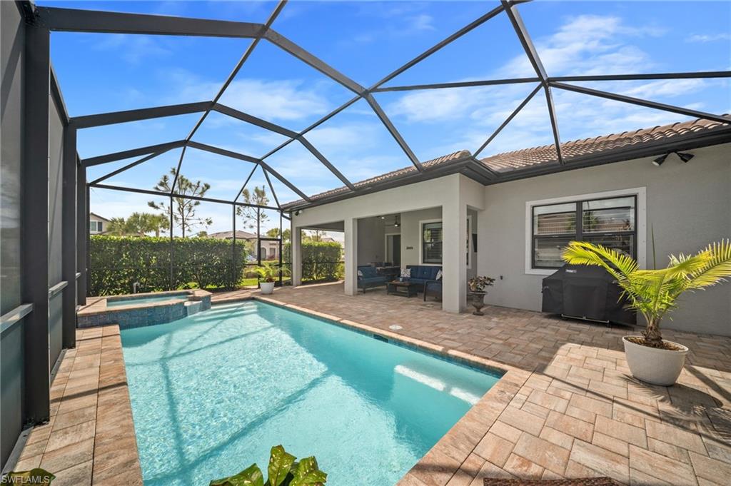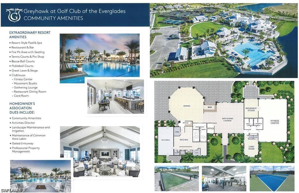 Built in 2022, this light-filled `Summerwood` floorplan home (3+Den/2BA/Extended 2 Car) is ideally situated on a spacious corner lot in the highly sought-after, gated community of Greyhawk at Golf Club of the Everglades in North Naples. The open great room design, featuring soaring 11u2019 ceilings, creates a welcoming and spacious ambiance from the moment you step inside. The gourmet kitchen is a chefu2019s dream with shaker cabinets, upgraded hardware, elegant quartz countertops, and tile backsplash. Premium KitchenAid appliances, including wall ovens and GAS cooktop, complete the space. Zero-corner, pocketing sliding glass doors open to the expansive covered lanai, where you can enjoy the custom GAS-heated pool with raised spau2014perfect for relaxing while enjoying the Florida sunshine. Notable upgrades include: wood look tile plant flooring throughout the entire home (no carpet anywhere); upgraded bathrooms featuring quartz countertops and square bath sinks; built-in closet organizer in the primary bedroom; hurricane impact glass front door; Great Room coffered ceiling adding architectural elegance; plantation shutters throughout; laundry room cabinets & sink for added convenience; upgraded lights & fans for a stylish touch; outdoor kitchen pre plumb (water & gas); extended two car garage with finished epoxy floor; spacious covered front porch; upgraded front elevation upgrade with stone accents; and more! Greyhawk at Golf Club of the Everglades offers an impressive range of community amenities, including two clubhouses with social halls, restaurants, bars, a fitness center, tennis, bocce, pickleball, a resort pool, a tiki bar, and a social director. The community is just 20 minutes from the beach, Mercato, and 15 minutes from I-75, offering the best of Naples living. As a homeowner in Greyhawk, you are a social member of the Golf Club of the Everglades, with optional golf memberships available. Annual fees of $9,300 cover landscaping, all community amenities, and social membership to the club. Donu2019t miss your opportunity to own this exquisite home in one of Naplesu2019 most desirable communities!