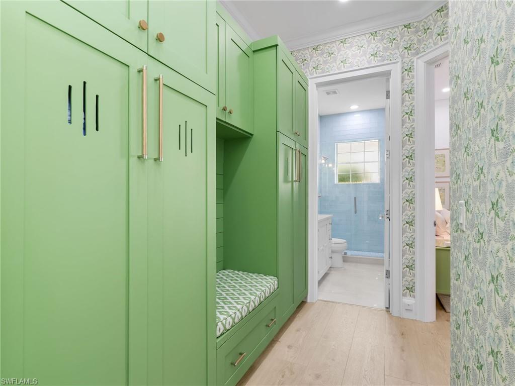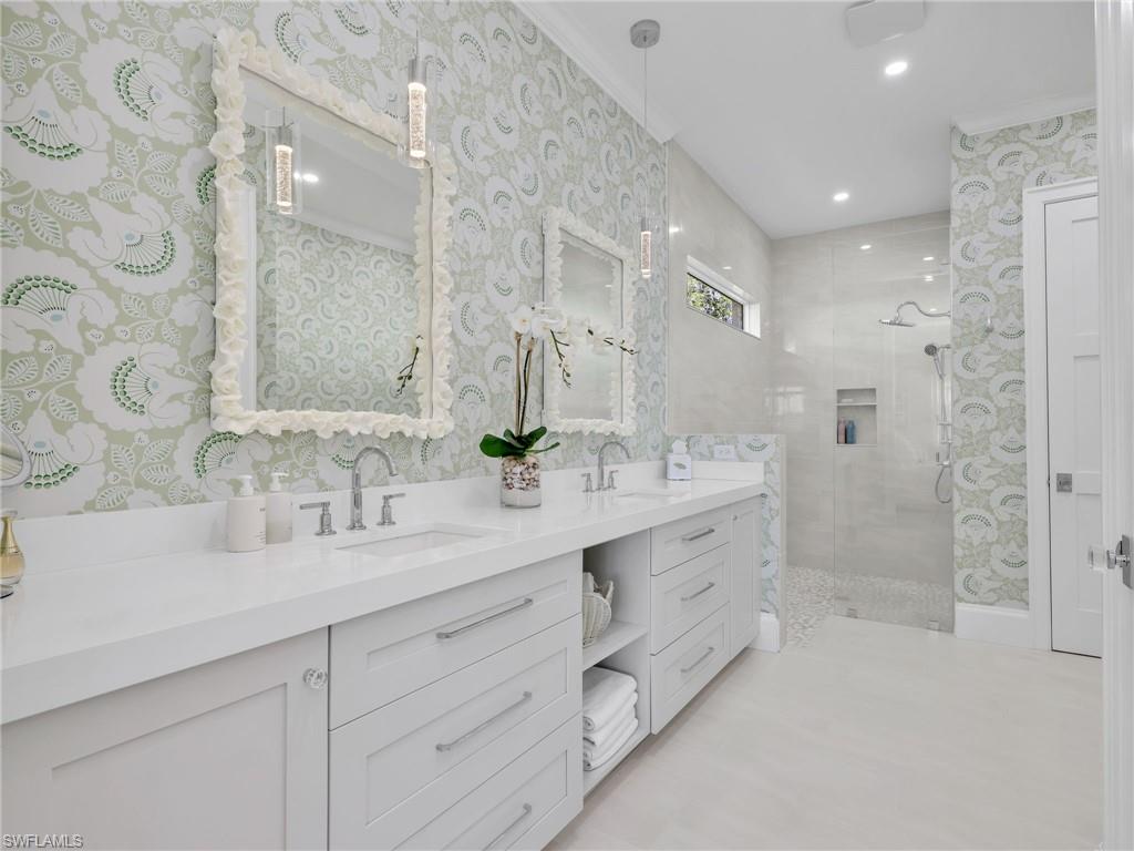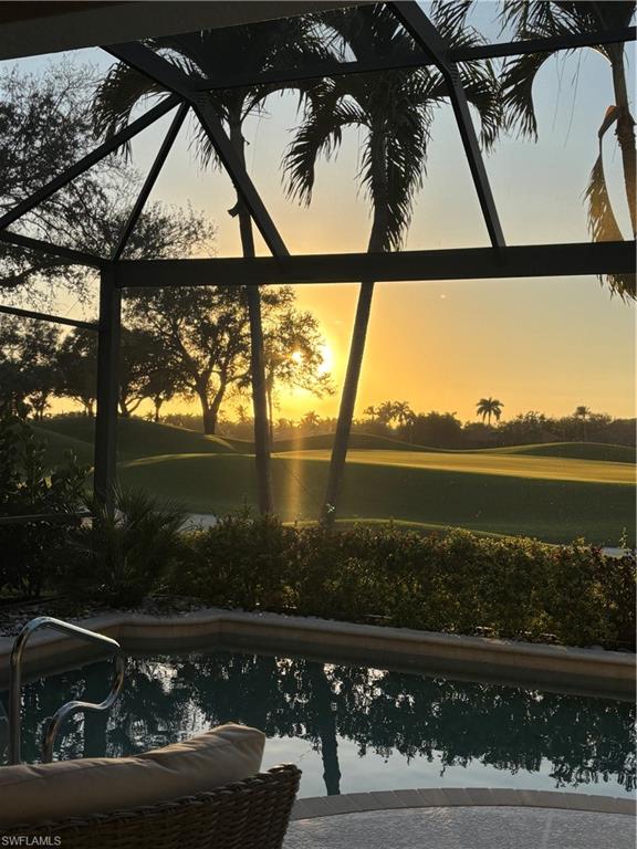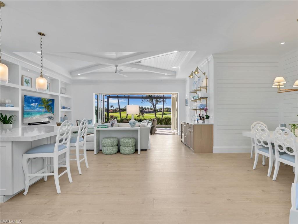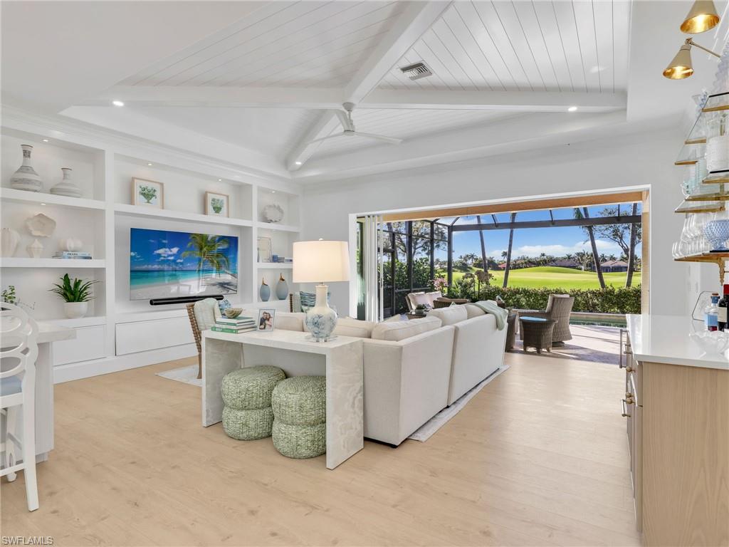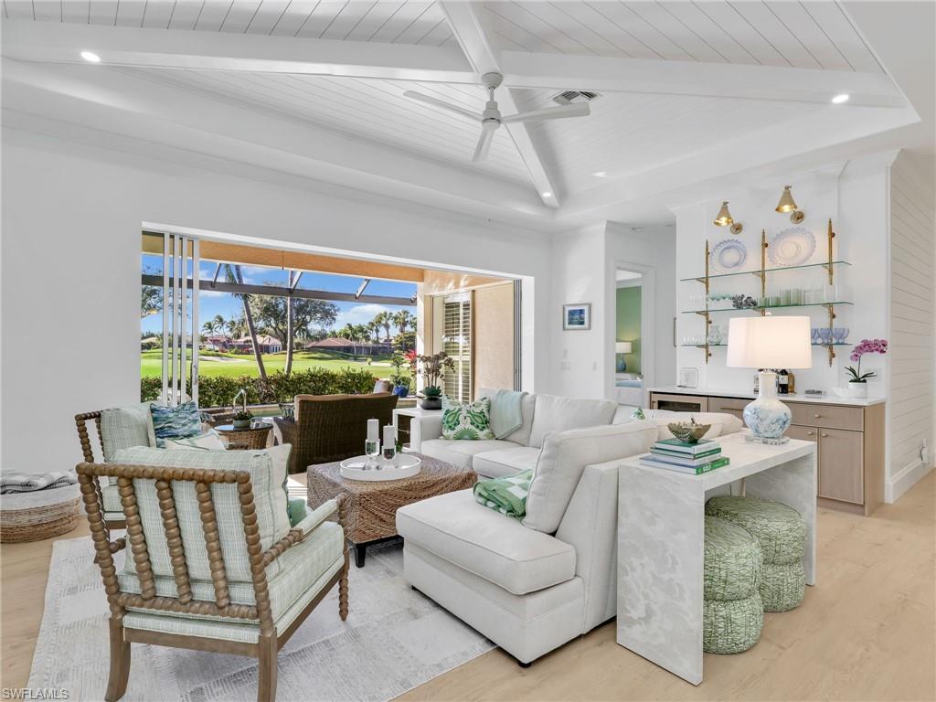 Fully renovated Interior and thoughtfully reimagined, this coastal contemporary, Western Exposure residence with Spectacular Sunsets evokes a luxurious beach house retreatu2014sun-drenched, serene, and impeccably curated. Sand-colored wood flooring flows throughout, creating a warm, inviting foundation, while architectural u201cfifth wallu201d detailsu2014coffered ceilings, shiplap accents, tongue-and-groove finishesu2014and layered textures add depth and visual interest at every turn. Pocketing sliders dissolve the boundary between indoors and out, filling the home with natural light and framing sweeping golf course views. Designer lighting throughout further enhances each space, highlighting the homeu2019s refined finishes. The kitchen is both striking and functional, showcasing two refrigerator drawers, custom ceiling-height cabinetry, stylish backsplash that extends seamlessly up the wall, and finishes that feel elevated yet welcoming. Every room shines as its own piece of living art, thoughtfully designed with a surfside-inspired motif and cohesive coastal color palette. A custom built-in mudroom blends beauty with everyday practicality, while the den offers added flexibility with a Queen Murphy bedu2014ideal for guests or multi-use living. The primary suite is a tranquil retreat, accented by a grass-cloth feature wall and complemented by an elegant ensuite bath. Outdoor living is a true highlight, featuring a lagoon-style pool that creates a resort-like atmosphere and a picture-frame screen enclosure preserving uninterrupted views of the greens. With custom cabinetry, designer finishes throughout, and a floor plan completely reimagined for modern living, this remarkable residence embodies quiet luxuryu2014timeless, welcoming, and straight out of the pages of a design magazine.