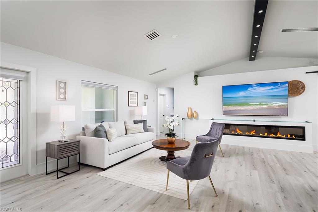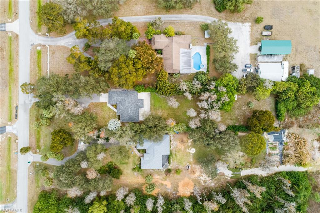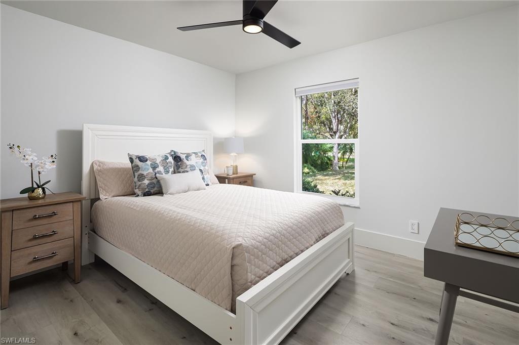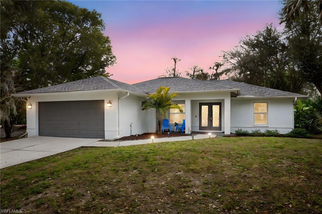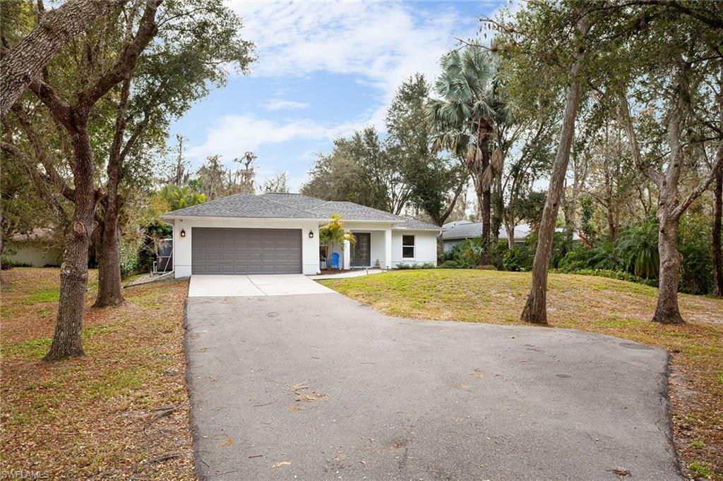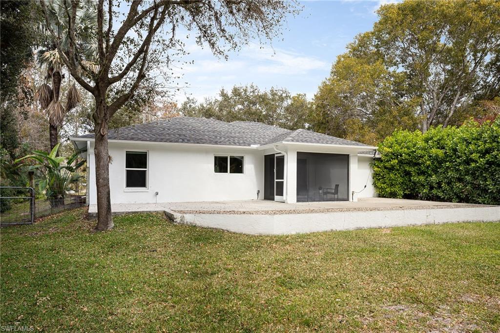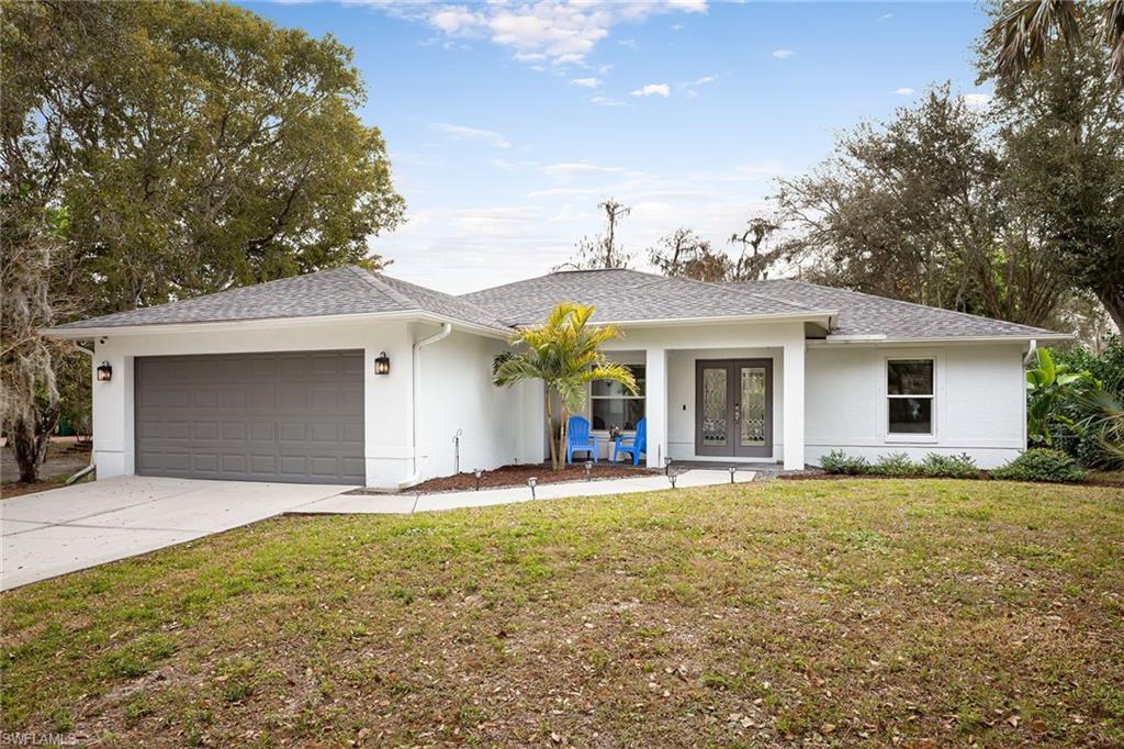Logan Woods. Beautifully updated in a clean modern style with high-end designer finishes and smart systems on approximately 1.14-acre lot with storage shed. High elevation, new roof and new windows in 2022, updates to septic and whole-house reverse osmosis in 2023 and now freshly painted interior walls. Large open great room and kitchen with soaring vaulted ceilings and split bedroom floor plan for ultimate privacy. Exceptional features include stunning large remote-controlled fireplace, 85-inch Sony flatscreen, kitchen island, quartz countertops, white and gold tile, and Samsung smart stainless appliances. In-house stackable washer/dryer. Primary suite with Moen smart shower system, double sinks, walk-in closet. Two guest bedrooms sized for queen or twins/bunks share a hallway bath with glass enclosed shower. Kitchen sliders open to a screened lanai and unscreened patio with ample room for grilling, outdoor dining, fire pit or hot tub. Enjoy the view of an expansive backyard surrounded by mature trees and lush hedges. Additional smart home features include Nest thermostat, smoke/CO alarms, Ring doorbell, Yale door lock, home alarm and security camera system. Conveniently between two shopping plazas. In Vineyards Elementary, Oakridge Middle and Naples High School districts, and 15 minutes to the beach, making this house your dream home or an exciting investment property.