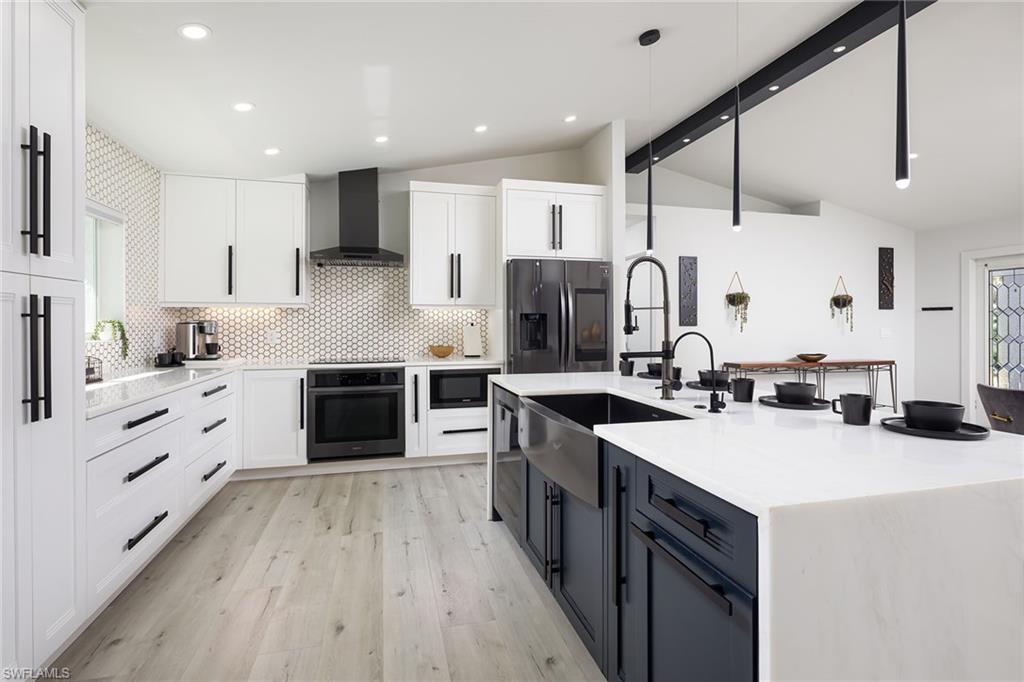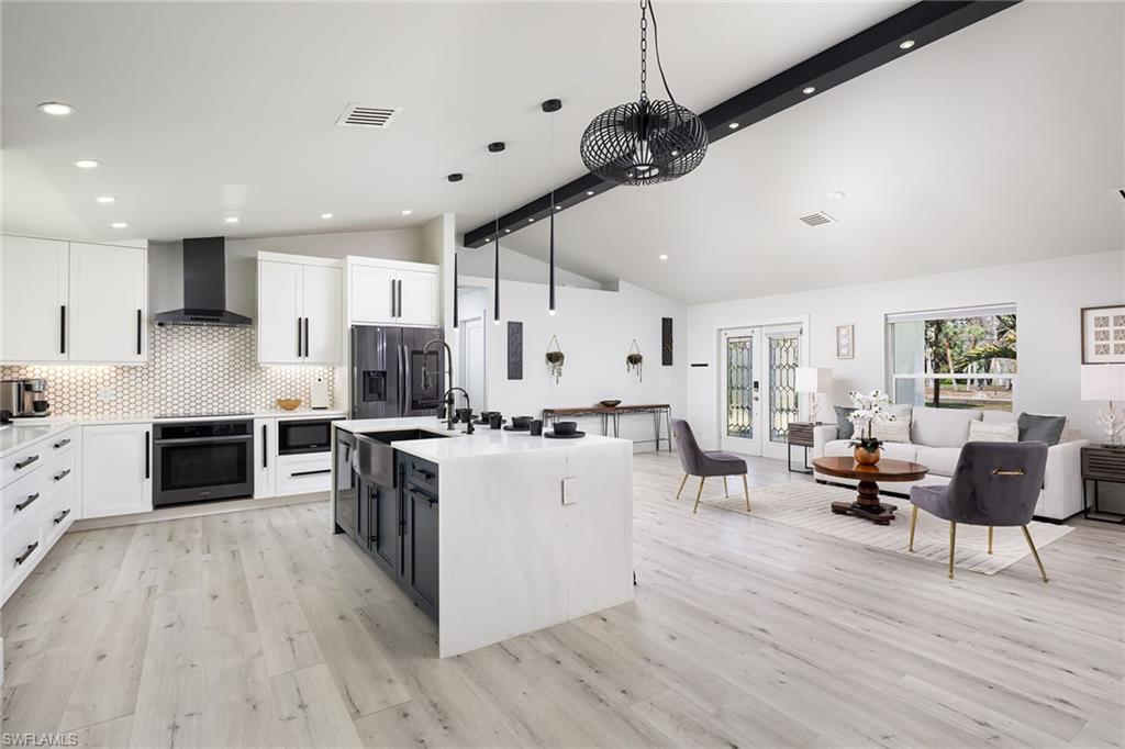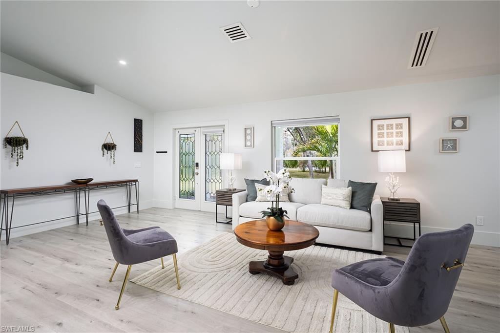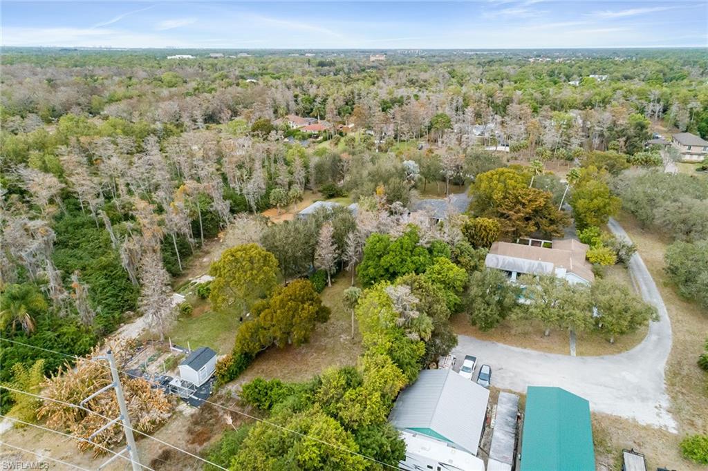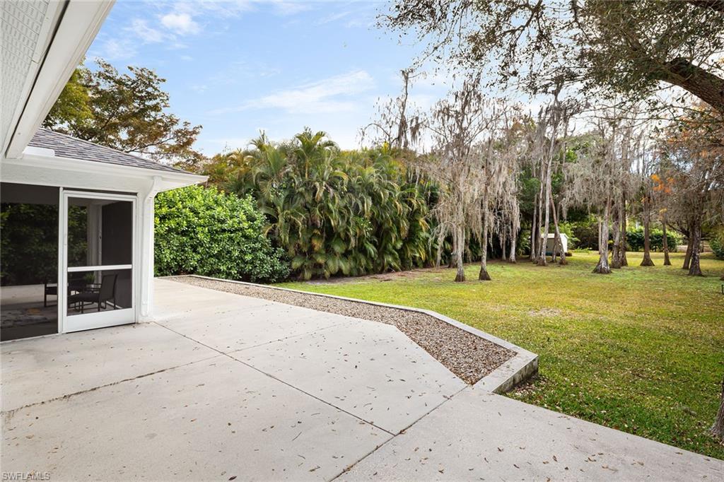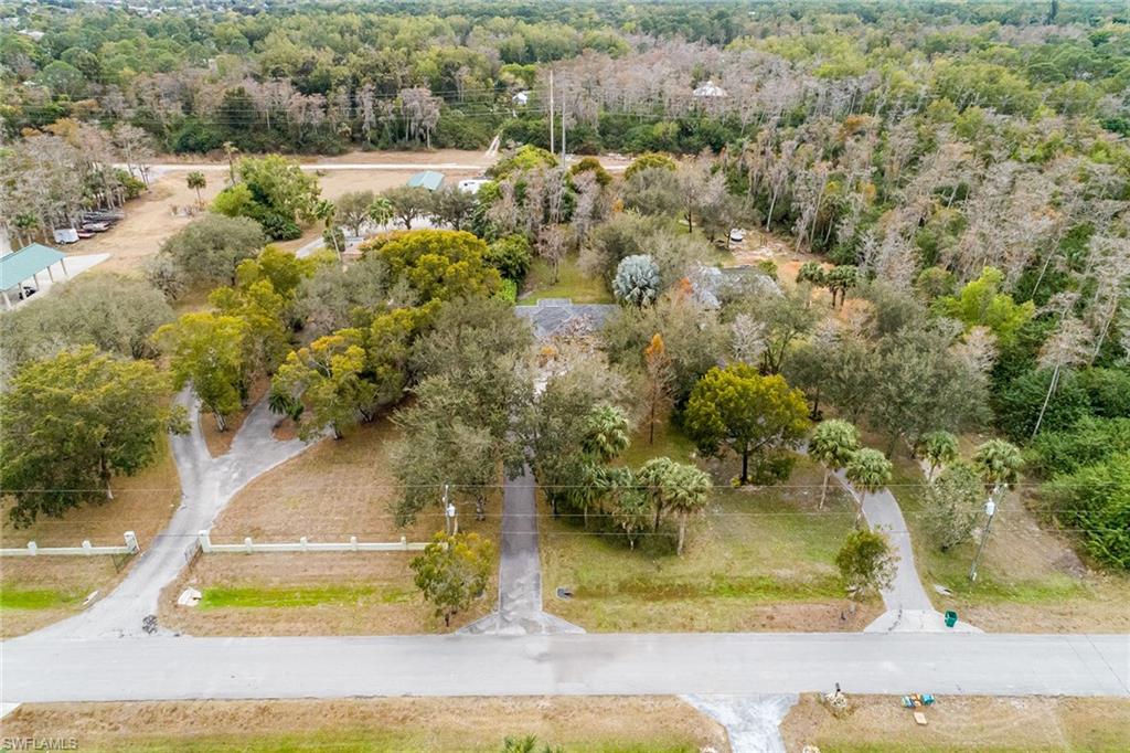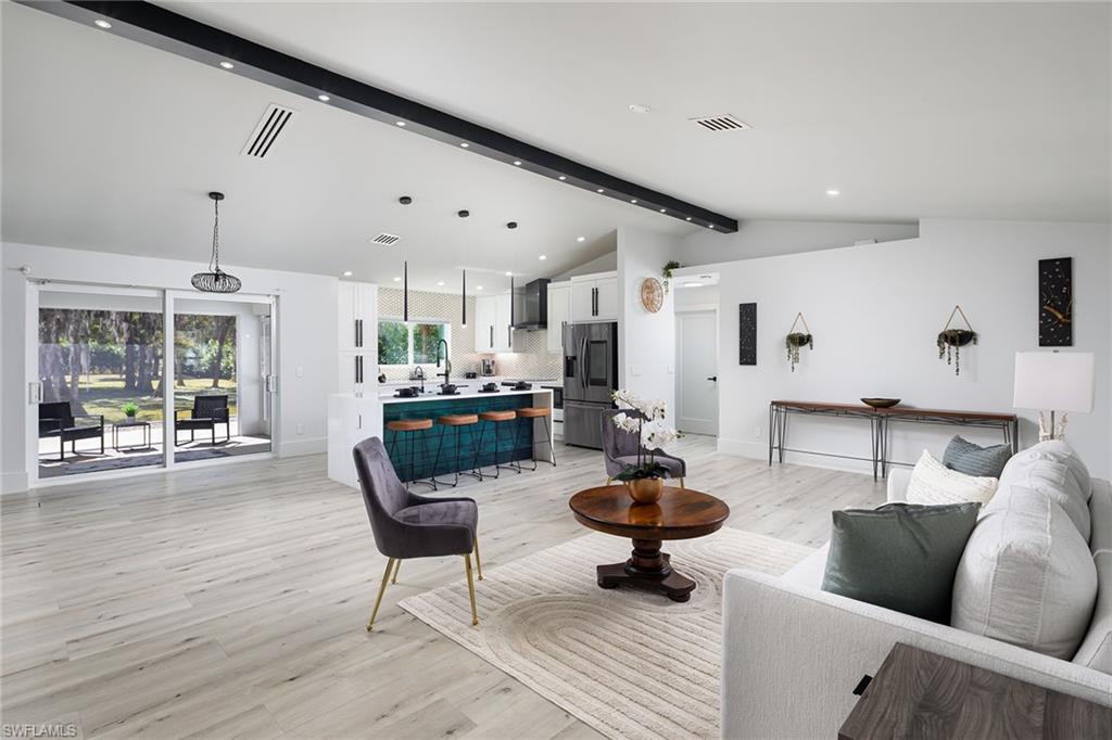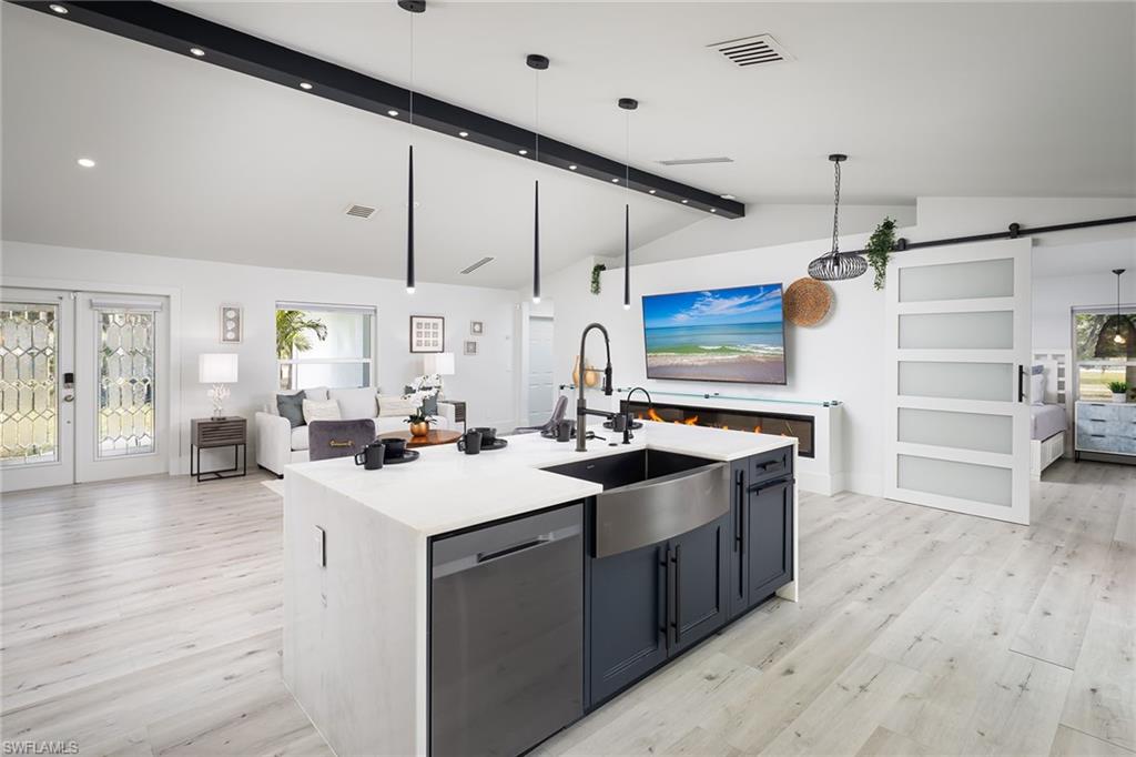 Logan Woods. Beautifully updated in a clean modern style with high-end designer finishes and smart systems on approximately 1.14-acre lot with storage shed. High elevation, new roof and new windows in 2022, updates to septic and whole-house reverse osmosis in 2023 and now freshly painted interior walls. Large open great room and kitchen with soaring vaulted ceilings and split bedroom floor plan for ultimate privacy. Exceptional features include stunning large remote-controlled fireplace, 85-inch Sony flatscreen, kitchen island, quartz countertops, white and gold tile, and Samsung smart stainless appliances. In-house stackable washer/dryer. Primary suite with Moen smart shower system, double sinks, walk-in closet. Two guest bedrooms sized for queen or twins/bunks share a hallway bath with glass enclosed shower. Kitchen sliders open to a screened lanai and unscreened patio with ample room for grilling, outdoor dining, fire pit or hot tub. Enjoy the view of an expansive backyard surrounded by mature trees and lush hedges. Additional smart home features include Nest thermostat, smoke/CO alarms, Ring doorbell, Yale door lock, home alarm and security camera system. Conveniently between two shopping plazas. In Vineyards Elementary, Oakridge Middle and Naples High School districts, and 15 minutes to the beach, making this house your dream home or an exciting investment property.