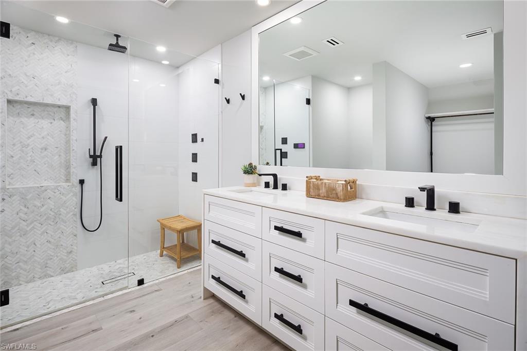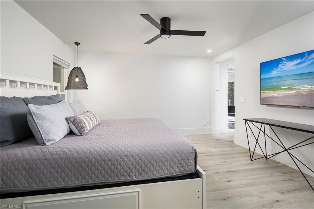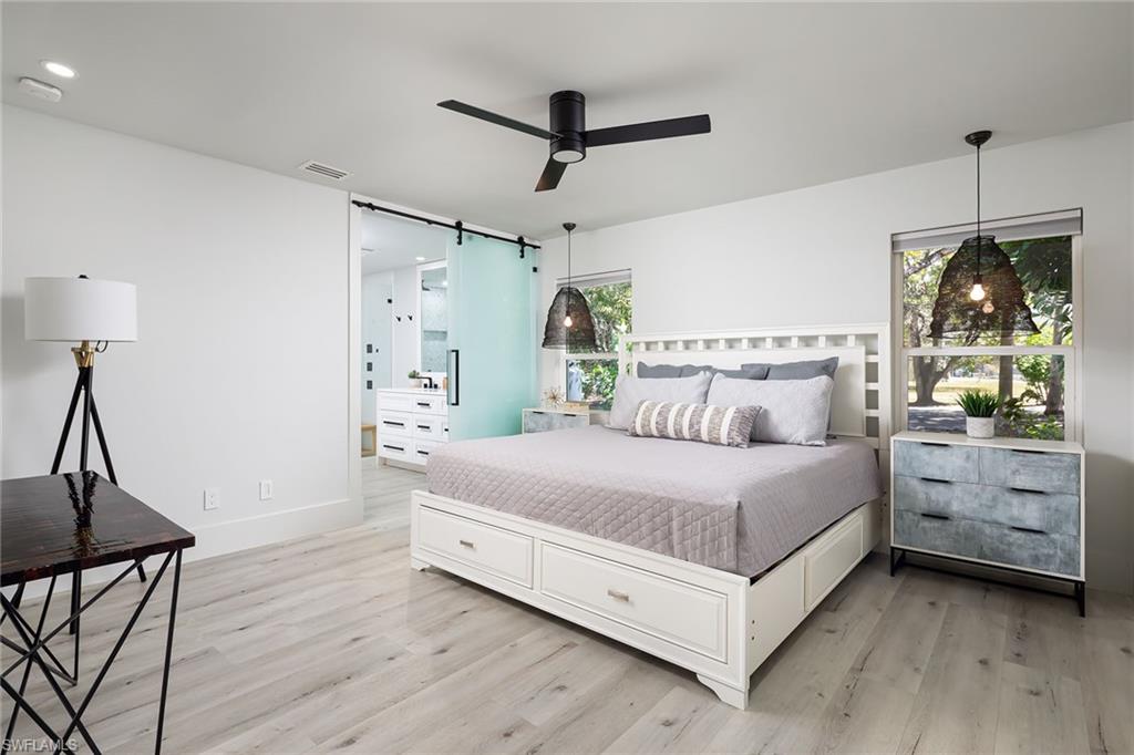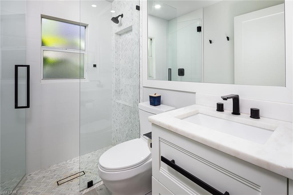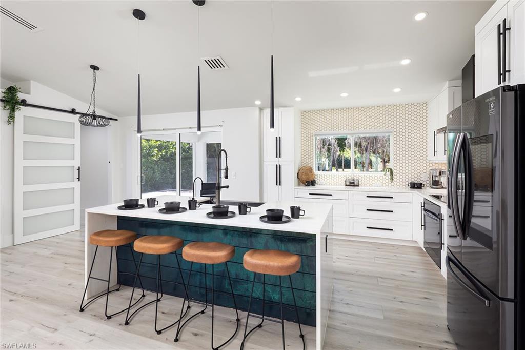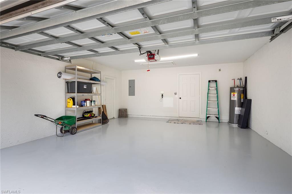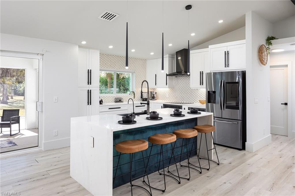 Logan Woods. Beautifully updated in a clean modern style with high-end designer finishes and smart systems on approximately 1.14-acre lot with storage shed. High elevation, new roof and new windows in 2022, updates to septic and whole-house reverse osmosis in 2023 and now freshly painted interior walls. Large open great room and kitchen with soaring vaulted ceilings and split bedroom floor plan for ultimate privacy. Exceptional features include stunning large remote-controlled fireplace, 85-inch Sony flatscreen, kitchen island, quartz countertops, white and gold tile, and Samsung smart stainless appliances. In-house stackable washer/dryer. Primary suite with Moen smart shower system, double sinks, walk-in closet. Two guest bedrooms sized for queen or twins/bunks share a hallway bath with glass enclosed shower. Kitchen sliders open to a screened lanai and unscreened patio with ample room for grilling, outdoor dining, fire pit or hot tub. Enjoy the view of an expansive backyard surrounded by mature trees and lush hedges. Additional smart home features include Nest thermostat, smoke/CO alarms, Ring doorbell, Yale door lock, home alarm and security camera system. Conveniently between two shopping plazas. In Vineyards Elementary, Oakridge Middle and Naples High School districts, and 15 minutes to the beach, making this house your dream home or an exciting investment property.