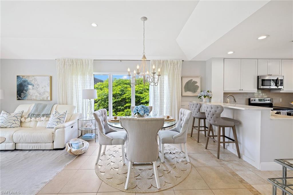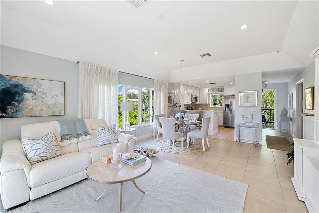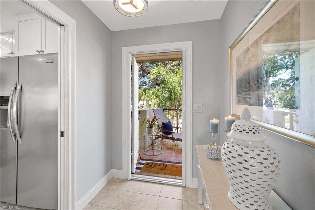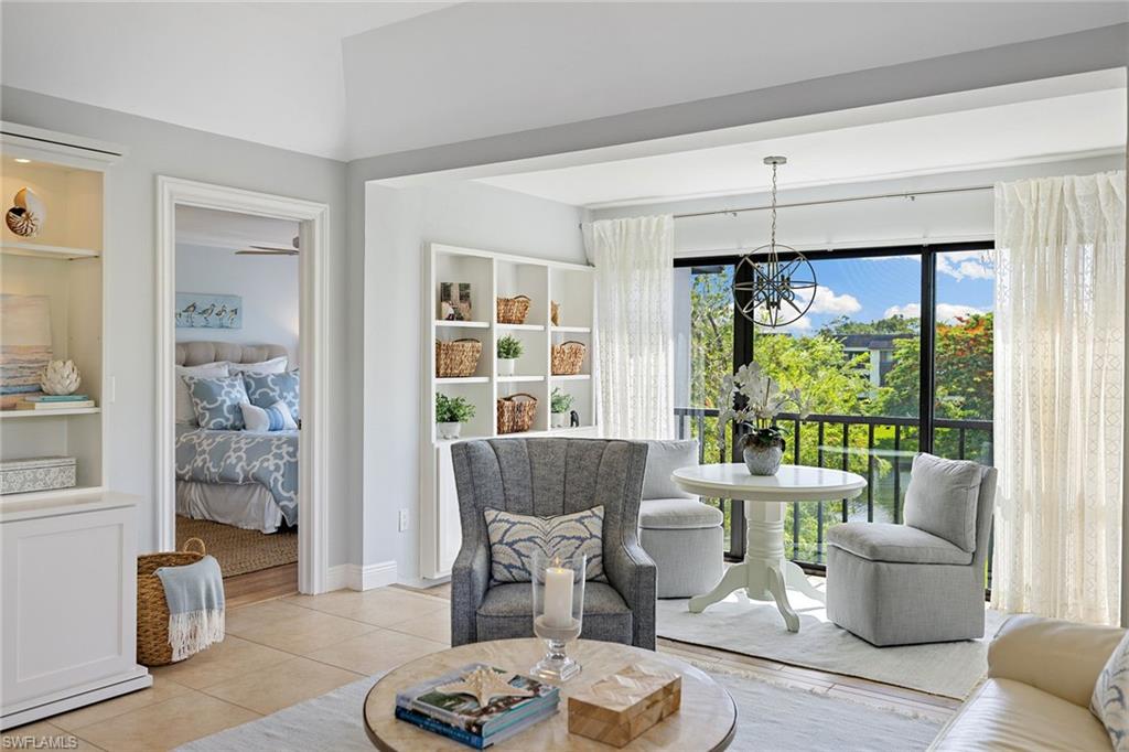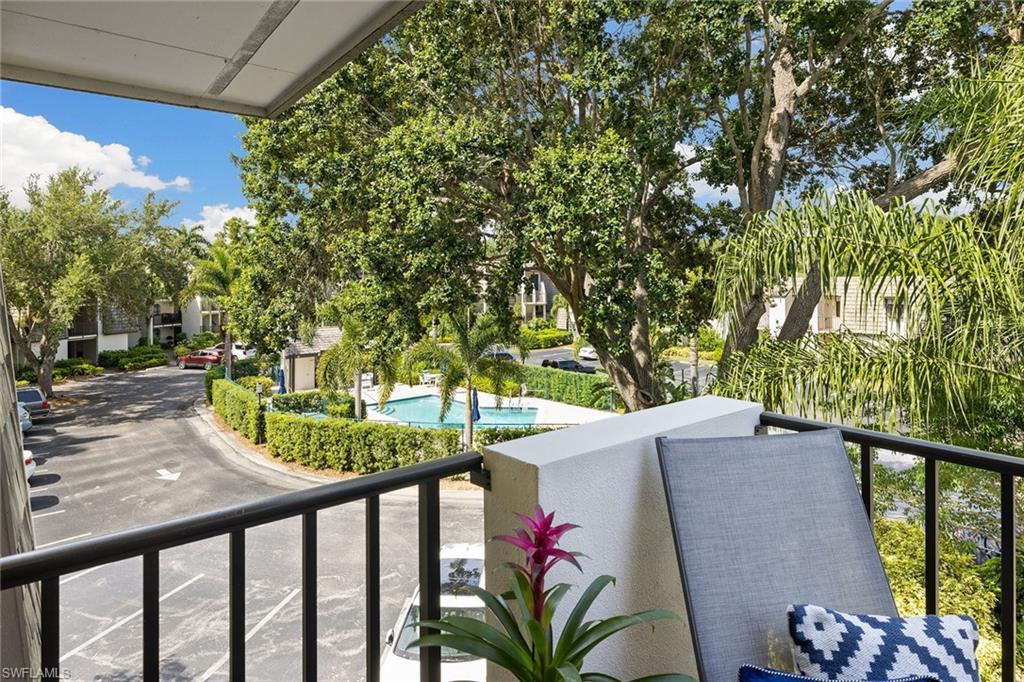 View the pool through the breeze in the trees from this beautifully renovated bright, top-floor end condominium. This central home features a south-facing wall of windows and 9-foot-high ceiling with open-concept design that delivers a bright and peaceful lifestyle. East/west orientation with a large front porch. The redesigned kitchen and baths offer soft-close cabinets with quartzite counters, recessed lighting, crown molding in bedrooms, new doors, baseboards, ceiling fans, light fixtures, updated primary walk-in closet, custom built-ins with grass cloth and front retractable screen door. The heated pool and spa are a quick walk from the updated elevator. The community pedestrian gate allows for walking to shopping and dining from this quiet community. Four miles from the sugar white sands of the Gulf. Naples Bath and Tennis Club is home to the Sanchez Casal Tennis Academy, which offers hourly tennis and paddle court rentals. Pet friendly! Partially furnished per inventory.