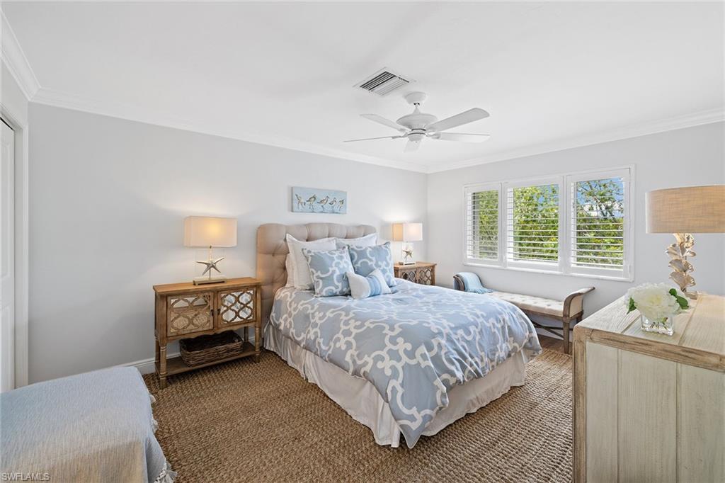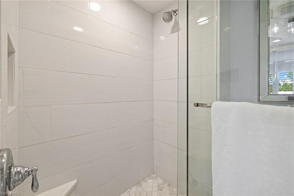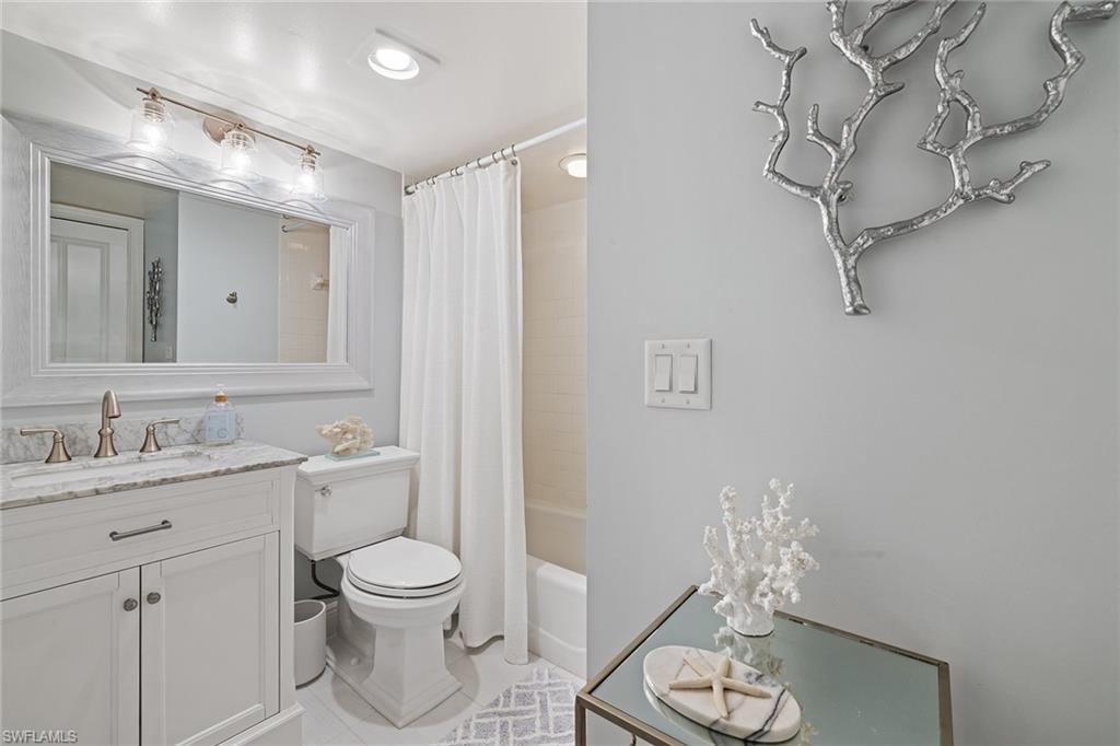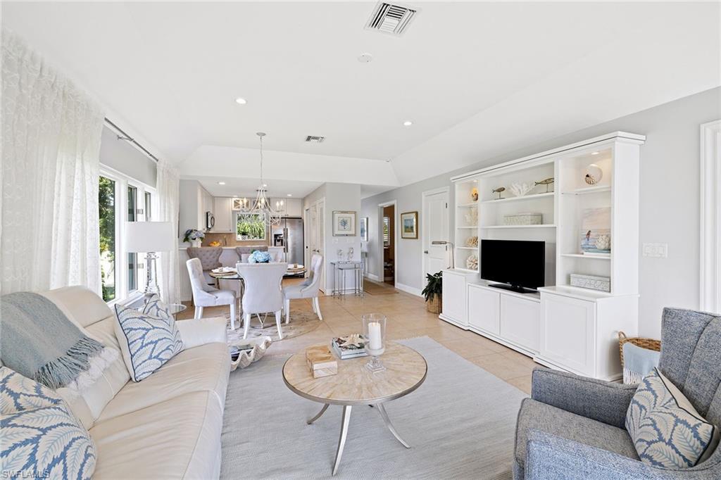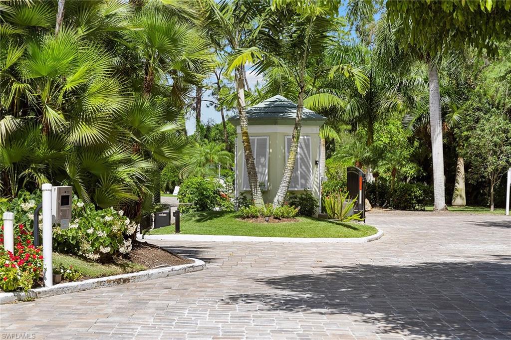 View the pool through the breeze in the trees from this beautifully renovated bright, top-floor end condominium. This central home features a south-facing wall of windows and 9-foot-high ceiling with open-concept design that delivers a bright and peaceful lifestyle. East/west orientation with a large front porch. The redesigned kitchen and baths offer soft-close cabinets with quartzite counters, recessed lighting, crown molding in bedrooms, new doors, baseboards, ceiling fans, light fixtures, updated primary walk-in closet, custom built-ins with grass cloth and front retractable screen door. The heated pool and spa are a quick walk from the updated elevator. The community pedestrian gate allows for walking to shopping and dining from this quiet community. Four miles from the sugar white sands of the Gulf. Naples Bath and Tennis Club is home to the Sanchez Casal Tennis Academy, which offers hourly tennis and paddle court rentals. Pet friendly! Partially furnished per inventory.