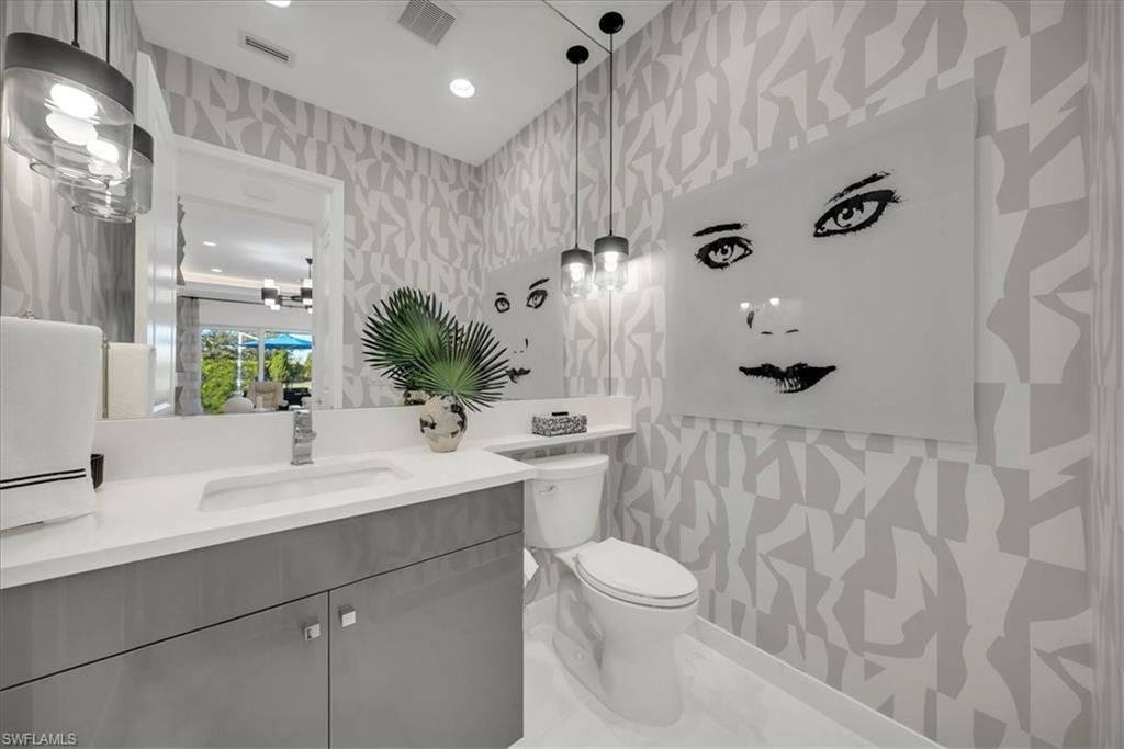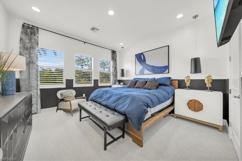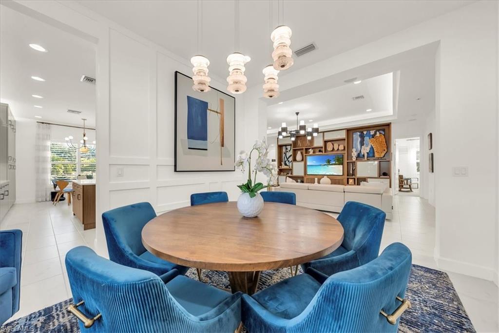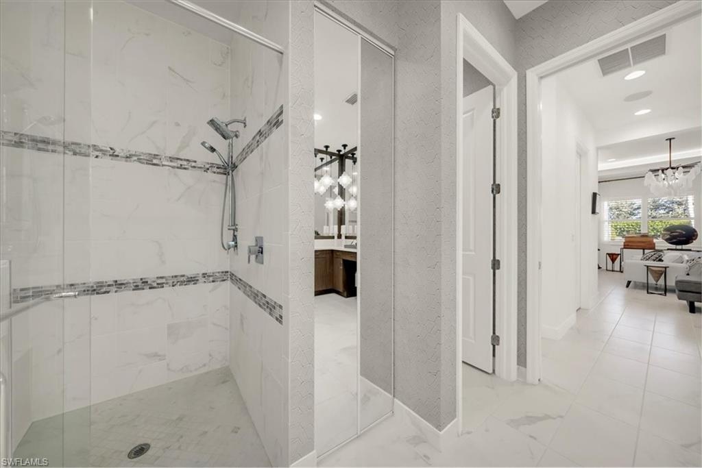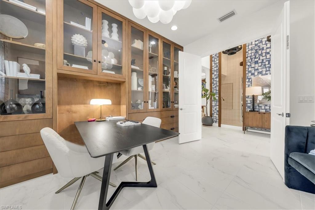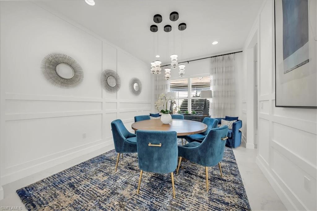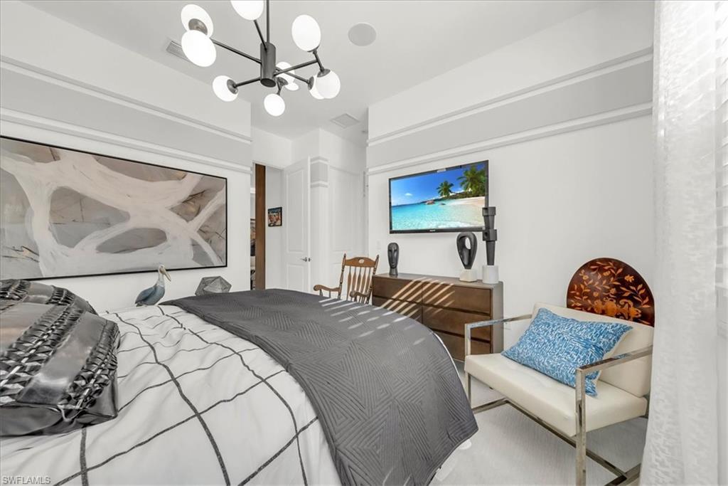 Welcome to refined resort-style living in this stunning showcase residence, offering a 3-bedroom en-suite split floor plan, a powder room and dedicated office/den/study. Perfectly positioned at the end of a quiet cul-de-sac on a private lot, this exceptional home is located within the highly sought-after Valencia Trails community. Thoughtfully designed and richly appointed with high-end designer upgrades, custom built-ins, and exquisite finishes, this residence delivers effortless elegance and comfort throughout.The open-concept design is enhanced by tray ceilings with curved crown molding, custom lighting, plantation shutters, curated wallpaper, and striking architectural details that elevate every space. The gourmet kitchen features custom upgraded cabinetry and designer lighting, seamlessly flowing into the living and dining areasu2014ideal for entertaining. A custom wainscoted dining room, built-in living room cabinetry, and a beautifully appointed office with custom cabinetry add both sophistication and function.The primary suite is a true retreat, highlighted by tray ceilings, custom wall detailing, upgraded lighting, and a private lanai door leading to the outdoor oasis. All bathrooms are finished with upgraded lighting and elegant, refined details.Step outside to your private, fenced backyard, featuring a custom two-tier pool and spa, screened lanai, outdoor kitchen, sealed pavers, and lush professional landscapingu2014perfect for year-round relaxation or entertaining. Enjoy peace of mind with a whole-house and pool generator, along with whole-home surround sound, including the outdoor lanai and pool area.The garage is a standout feature, offering climate control, custom flooring, wall systems, shelving, enhanced lighting, a refrigerator, and built-in entertainment capabilitiesu2014ideal for hobbies, storage, or showcasing the perfect Naples sports car.Located in Valencia Trails, a premier 55+ amenity-rich community, residents enjoy a luxury clubhouse, resort-style pool, on-site restaurant, pickleball, tennis, bocce ball, walking trails, and a dog parku2014all just minutes from Naplesu2019 world-class dining, shopping, and beaches.This is a rare opportunity to own a meticulously upgraded, move-in-ready luxury residence in one of Naplesu2019 most desirable communities.