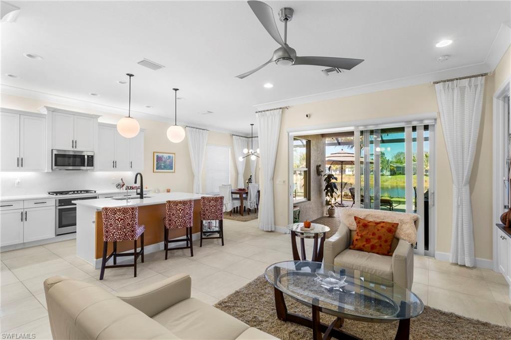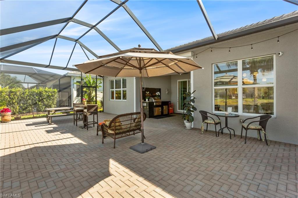 Enter the secured gates of Valencia Trails, a 55+ community, and step into this meticulously maintained, young home with incredible upgrades and impact windows throughout. This layout features two bedrooms plus a den and is offered furnished with some exclusions.The heart of the home is magnificent: a center-island kitchen featuring quartz countertops and backsplash, upgraded cabinetry, built-in lighting, new appliances, and gas cooking.Enjoy the lovely extended lanai with a built-in summer kitchen and a panoramic screened cageu2014perfect for relaxing or entertainingu2014along with beautiful lake views.Both bedrooms feature porcelain wood-look floors and custom, spacious closets. The primary bath includes dual sinks and ample counter space. Epoxy flooring in the two-car garage provides extra durability.Live the resort lifestyle in the 42,000 sq. ft. clubhouse with amenities including a restaurant, poolside bar, four resort pools, pickleball, tennis, and bocce ball courts, gym, spa, shows, classes, nature walking trails, dog park, and more. Hurry!