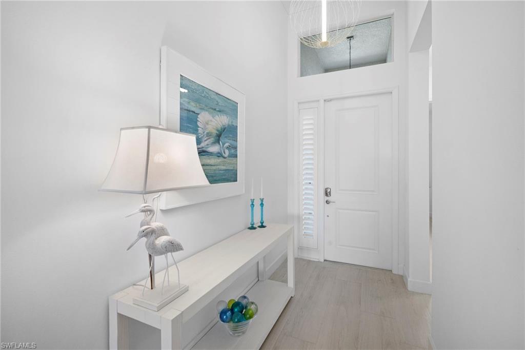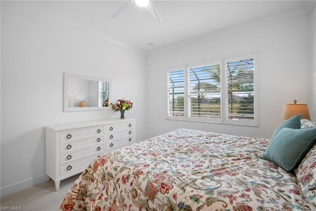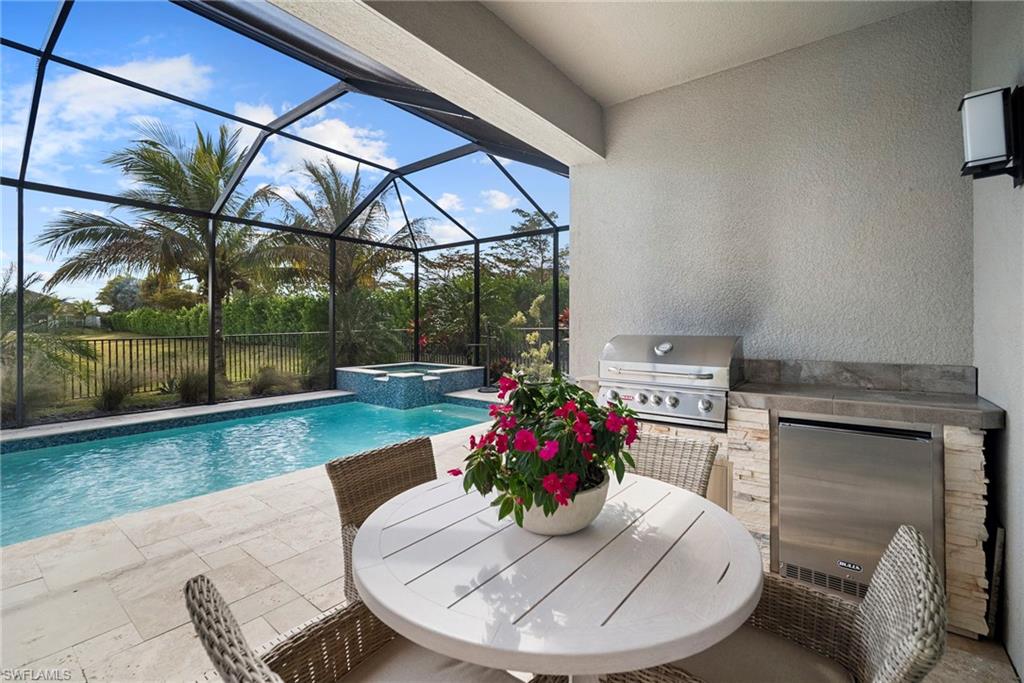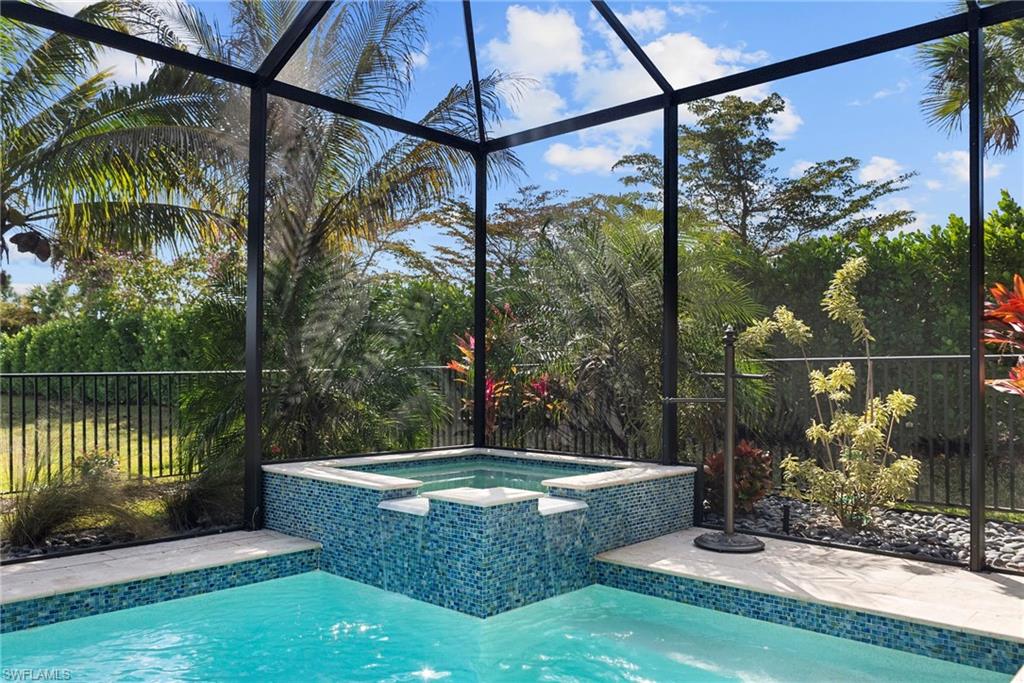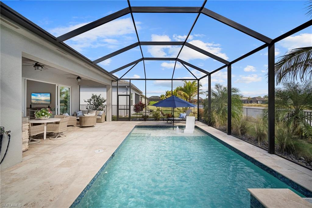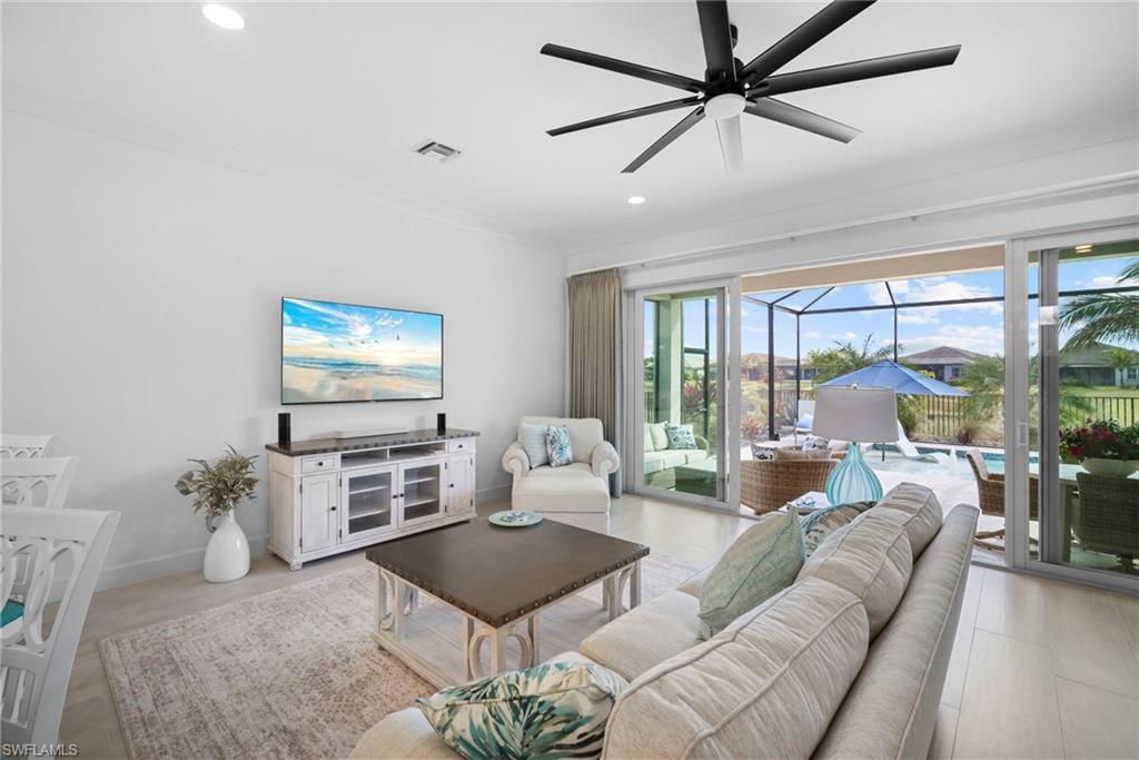 Welcome to this beautifully upgraded Flamingo floorplan in Valencia Trails, Naplesu2019 premier natural gas community. Situated on a desirable corner lot, this 2-bedroom plus den, 2-bath residence offers a bright, open layout designed for both everyday comfort and effortless entertaining. The home features new tile flooring throughout, enhancing the clean coastal aesthetic and providing durability with easy maintenance. The spacious great room flows seamlessly into the chefu2019s kitchen, complete with natural gas cooking, quartz countertops, abundant cabinetry, and an oversized island ideal for gathering with family and friends. The versatile den provides the perfect space for a home office, media room, or additional guest accommodations. The primary suite is a private retreat with custom closets and a well-appointed bath, while plantation shutters throughout add both style and functionality. Step outside to your private resort-style lanai featuring a gas-heated pool and spa and a fully equipped outdoor kitchen, creating the ultimate space for year-round indoor-outdoor living. Valencia Trails is a natural gas community located just minutes away from shopping and dining and provides a new standard of 55 plus living by offering an exciting vacation-inspired lifestyle that rivals the finest resorts. The opulent 42,000 sq. ft. Clubhouse and Lifestyle Complex offers hundreds of exciting events including Broadway style shows, matinees, cocktail parties and galas. A full-time, on-site lifestyle staff ensures that there is something for everyone to enjoy.