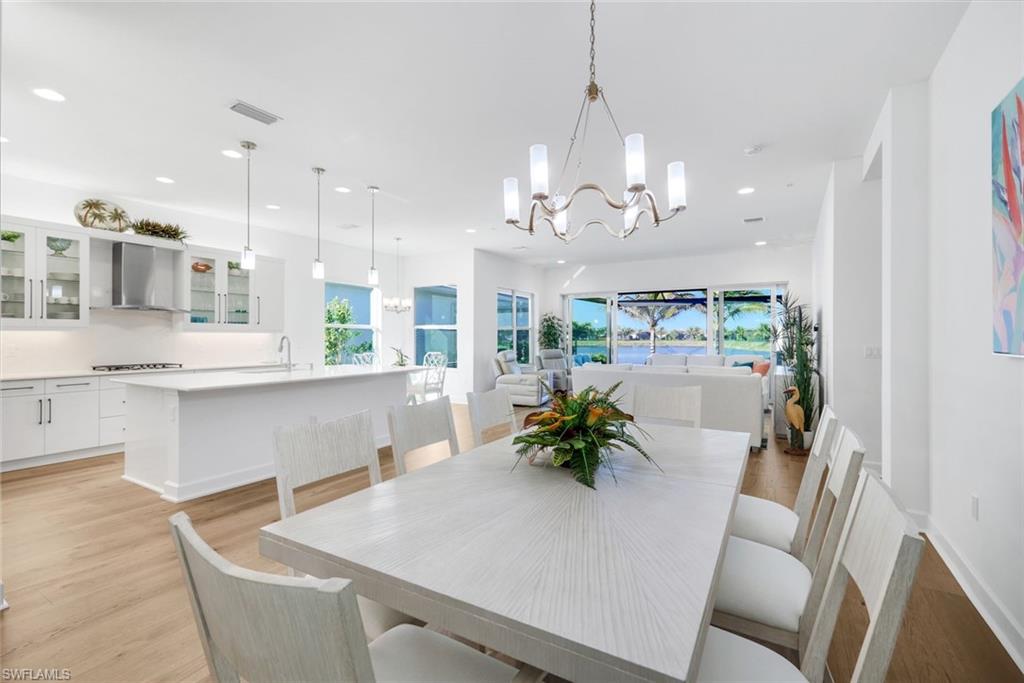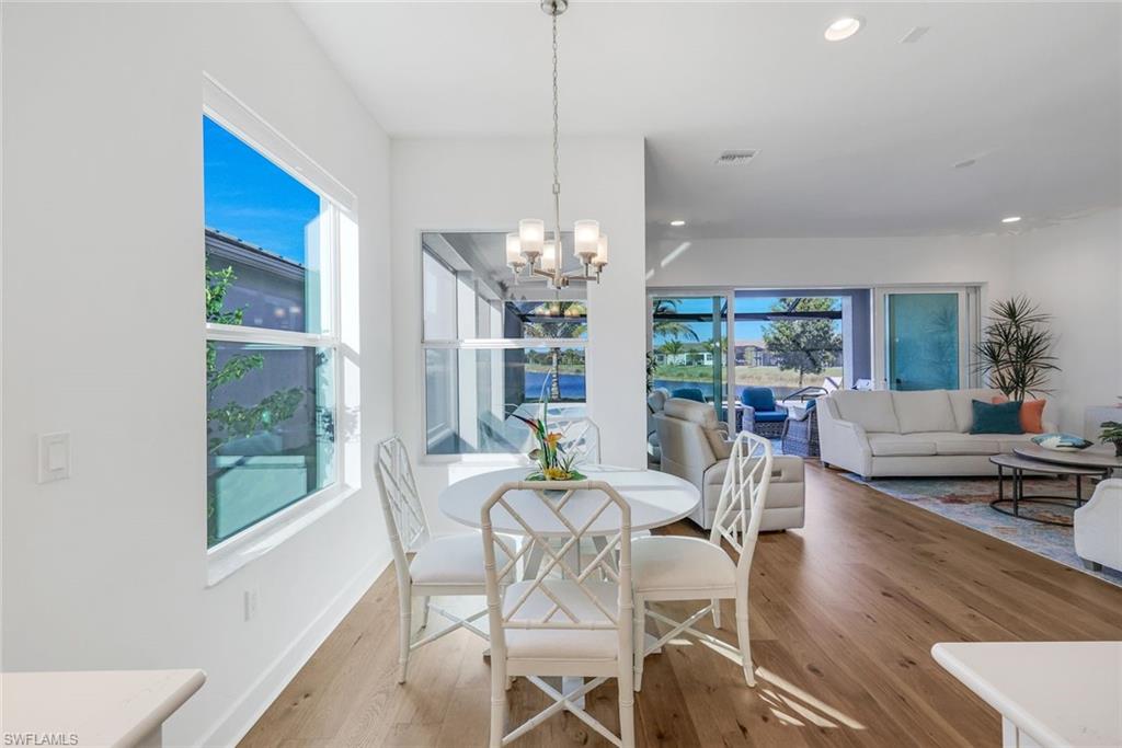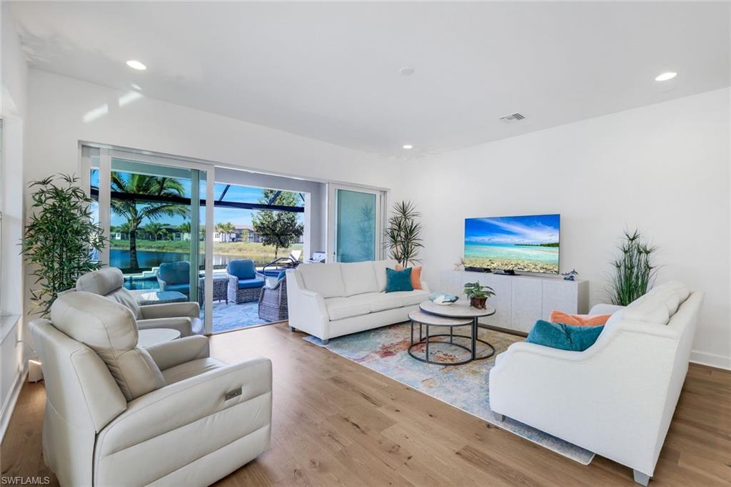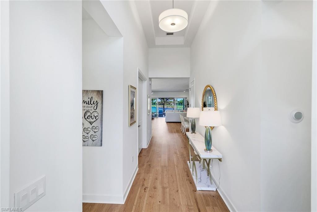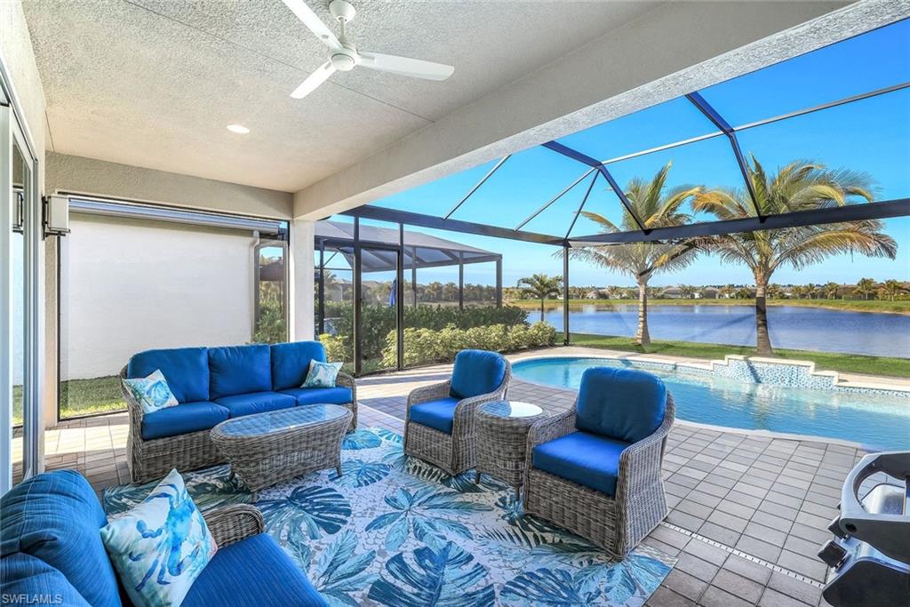 AN IMPRESSIVE ENTRANCE. A BREATHTAKING VIEW. AN EXCEPTIONAL HOME.From the moment you step inside, you are welcomed by a stunning, wide lake view, instantly setting a tone of elegance and serenity in this impeccably designed residence located just a short walk from the award-winning Valencia Trails clubhouse and amenities.This refined home showcases #1 grade hardwood flooring throughout the main living areas and a sophisticated modern aesthetic defined by clean lines, abundant natural light, and a seamless open-concept design created for elevated everyday living and gracious entertaining.The designer kitchen is both striking and functional, featuring crisp white cabinetry, luxurious quartz countertops, premium appliances, and an expansive center islandu2014an ideal gathering space for intimate evenings or stylish entertaining. The great room flows effortlessly through expansive sliding glass doors to a covered lanai overlooking a private pool with picture-window screening, offering a tranquil setting framed by shimmering lake views.The primary suite is a private sanctuary, thoughtfully positioned to maximize privacy and comfort, complete with a spa-inspired bath and generous walk-in closets. Two additional guest suites, each with a dedicated en-suite bath, provide hotel-level comfort for visitors. A versatile den offers the perfect space for a home office, media lounge, or private retreat. Select furnishings are negotiable, presenting an exceptional opportunity for an effortless, move-in-ready transition with refined style already in place.As a resident of Valencia Trails, enjoy access to a grand clubhouse, resort and lap pools, pickleball and tennis courts, a state-of-the-art fitness center, scenic walking trails, and a dynamic social calendaru2014all within one of Naplesu2019 most prestigious active adult communities.This is not simply a homeu2014it is a statement of refined Naples living.A rare offering where luxury, design, and an extraordinary lakefront setting converge.