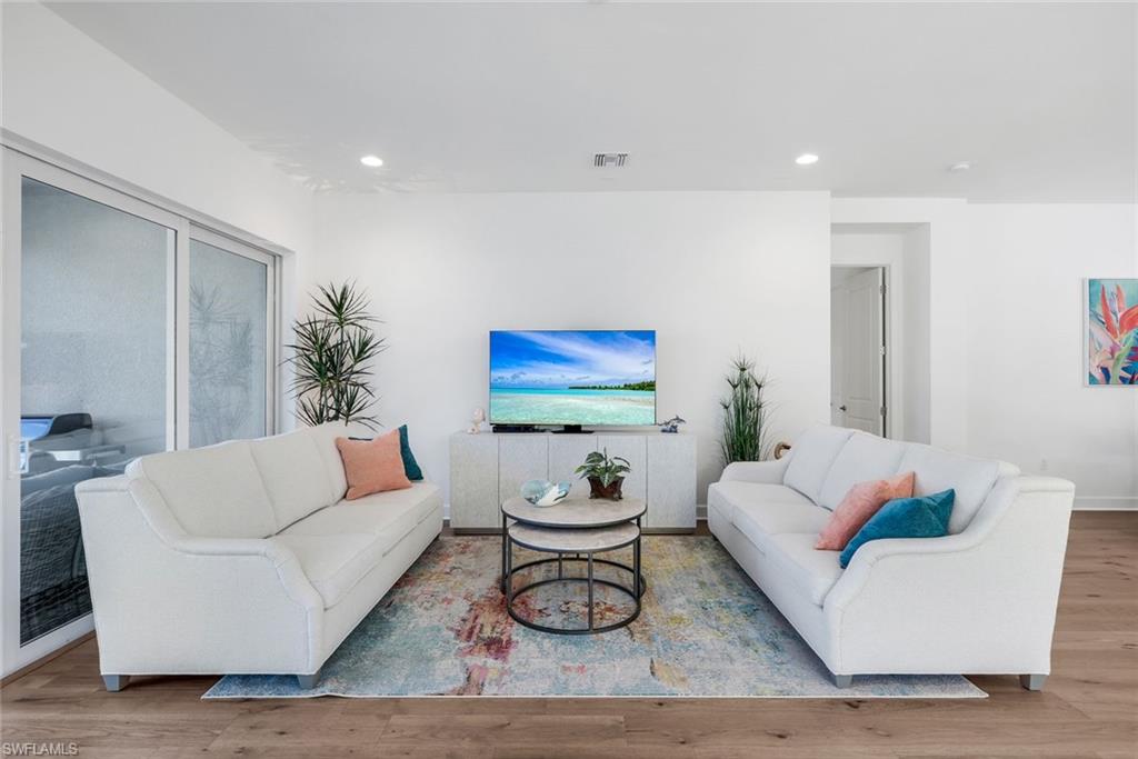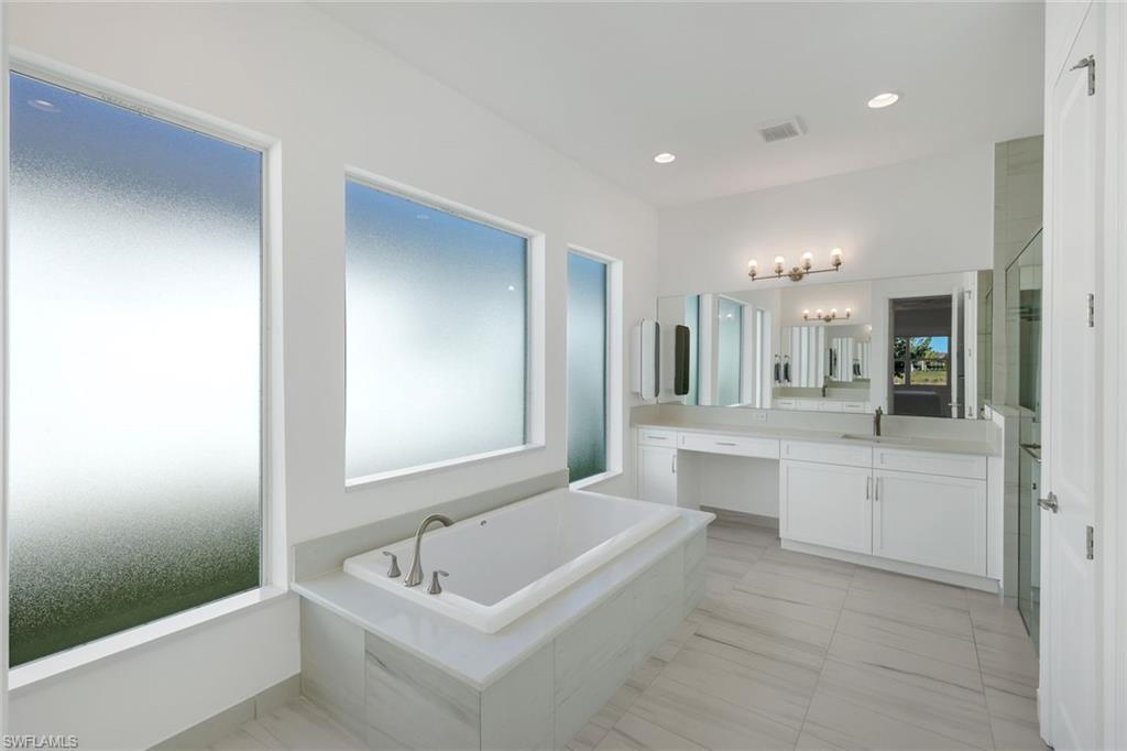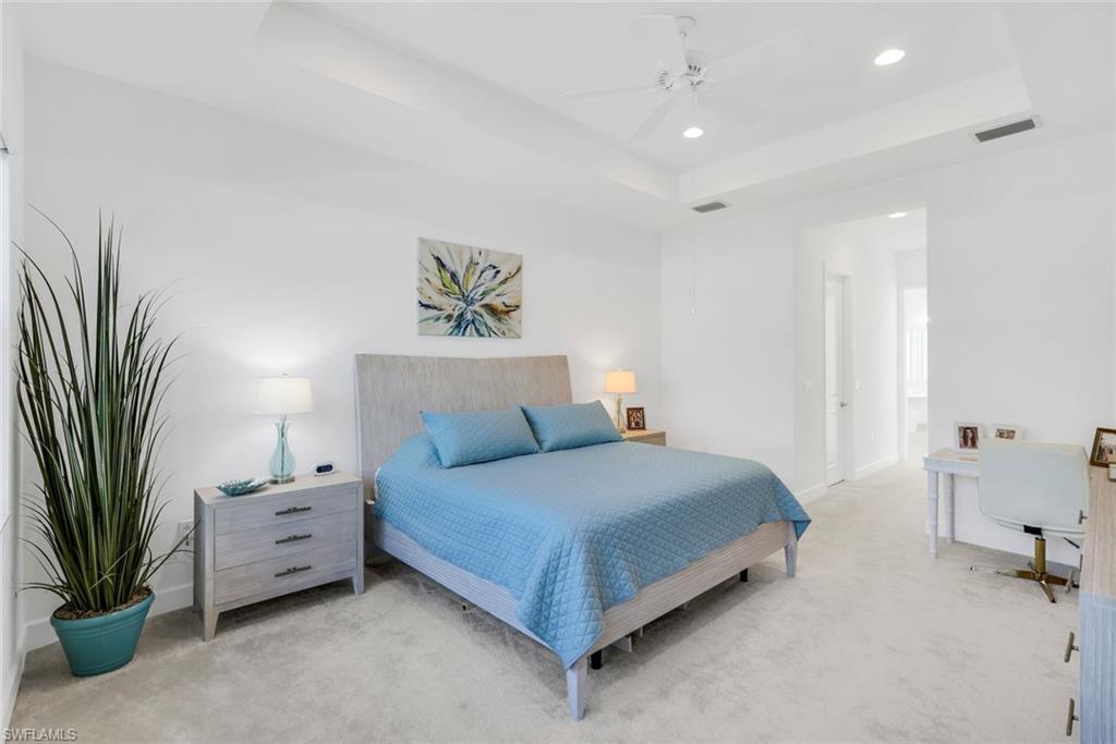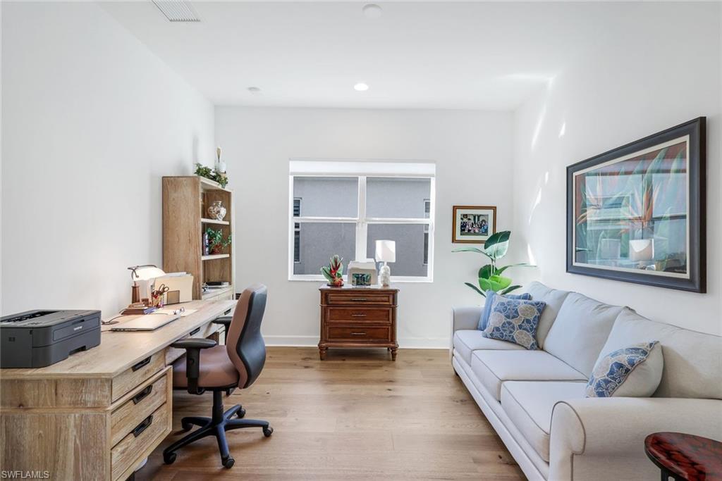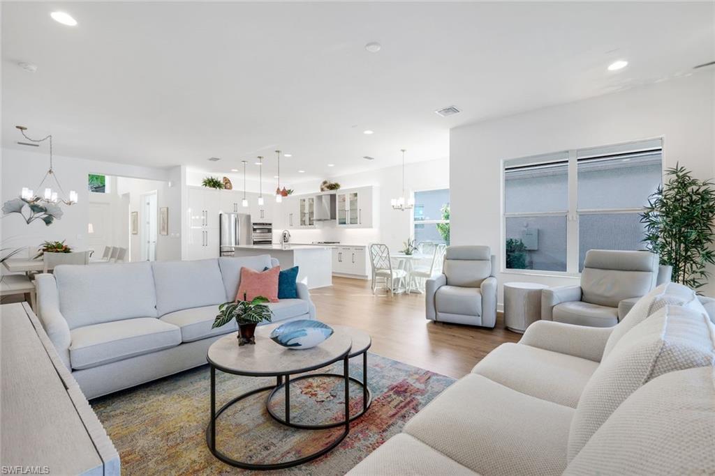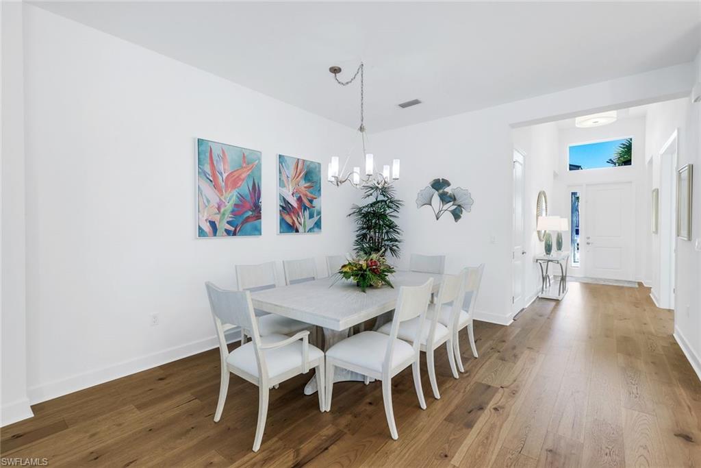 AN IMPRESSIVE ENTRANCE. A BREATHTAKING VIEW. AN EXCEPTIONAL HOME.From the moment you step inside, you are welcomed by a stunning, wide lake view, instantly setting a tone of elegance and serenity in this impeccably designed residence located just a short walk from the award-winning Valencia Trails clubhouse and amenities.This refined home showcases #1 grade hardwood flooring throughout the main living areas and a sophisticated modern aesthetic defined by clean lines, abundant natural light, and a seamless open-concept design created for elevated everyday living and gracious entertaining.The designer kitchen is both striking and functional, featuring crisp white cabinetry, luxurious quartz countertops, premium appliances, and an expansive center islandu2014an ideal gathering space for intimate evenings or stylish entertaining. The great room flows effortlessly through expansive sliding glass doors to a covered lanai overlooking a private pool with picture-window screening, offering a tranquil setting framed by shimmering lake views.The primary suite is a private sanctuary, thoughtfully positioned to maximize privacy and comfort, complete with a spa-inspired bath and generous walk-in closets. Two additional guest suites, each with a dedicated en-suite bath, provide hotel-level comfort for visitors. A versatile den offers the perfect space for a home office, media lounge, or private retreat. Select furnishings are negotiable, presenting an exceptional opportunity for an effortless, move-in-ready transition with refined style already in place.As a resident of Valencia Trails, enjoy access to a grand clubhouse, resort and lap pools, pickleball and tennis courts, a state-of-the-art fitness center, scenic walking trails, and a dynamic social calendaru2014all within one of Naplesu2019 most prestigious active adult communities.This is not simply a homeu2014it is a statement of refined Naples living.A rare offering where luxury, design, and an extraordinary lakefront setting converge.