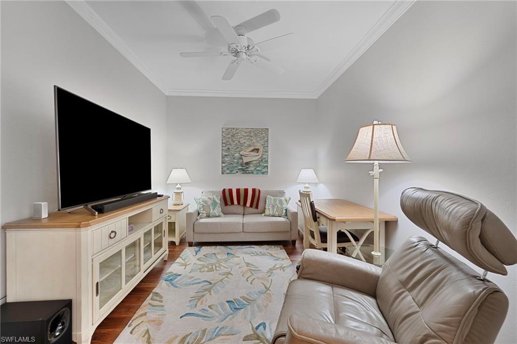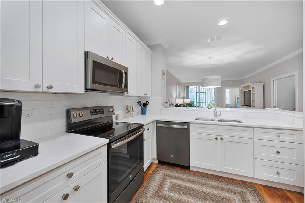 Enjoy this lovely, move-in ready Aston condo located on the green of the 11th hole with golf course and lake views. The unit is beautifully renovated with quartz countertops, stainless-steel appliances and higher cabinets in the kitchen. There are granite countertops in the bathrooms. The wood flooring, plantation shutters and crown molding bring a touch of comfortable elegance to the condo. Residents benefit from a range of amenities, including bundled golf with immediate playing access, three satellite pools, a state-of-the-art fitness center featuring optional classes, massage services, physical therapy, and Har-Tru tennis courts which also accommodate pickleball. Outdoor and poolside dining is available at the Terrace Cafu00e9, as well as casual and fine dining options at the clubhouse. The main pool area and activities complex have been rebuilt, opening in 2025, and features a new resort-style pool, spa, updated restrooms, and bocce courts. Vanderbilt Country Club fosters an active social atmosphere with numerous organized events and golf groups.