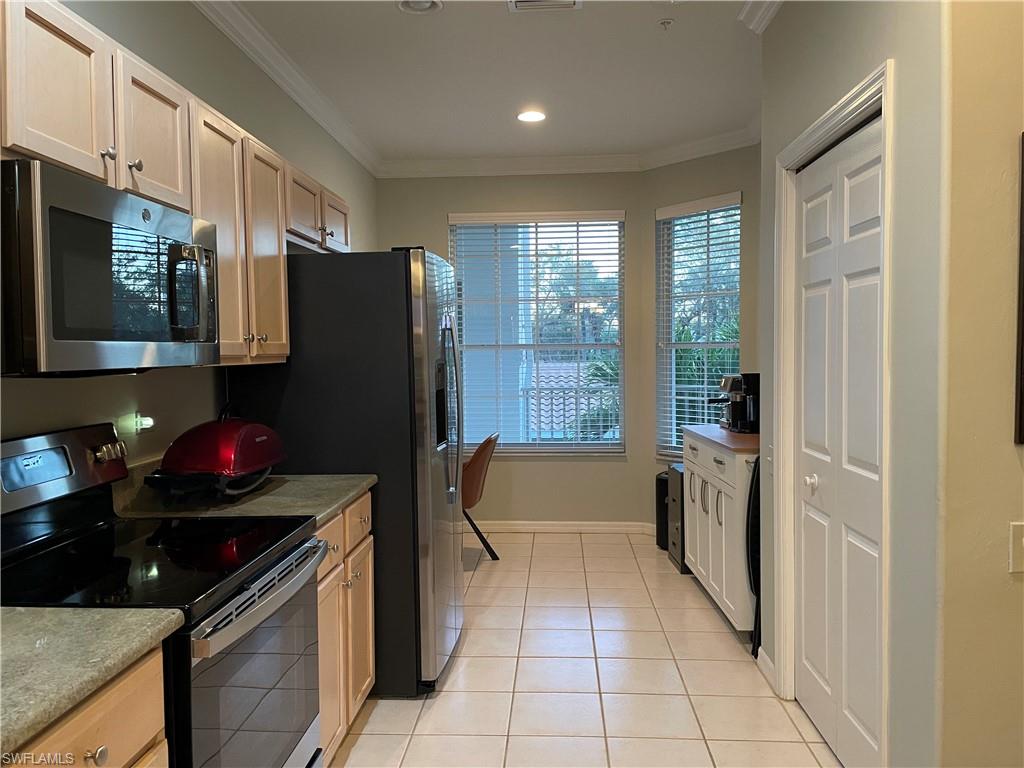 If a TOP RATED BUNDLED GOLF country club along with one of the BEST CONDO VIEWS of WATER POND, FOUNTAIN and 11th TEE are important to you then look no further! If your wish list includes NUMEROUS UPGRADES this 2 bedroom, 2 bath condo with open floor plan and split bedrooms features: 2 YEAR NEW AC & WATER HEATER offering peace of mind; renovated bathrooms with new toilets and fixtures; modernized kitchen with stainless steel appliances, new disposal, kitchen faucets, and a movable kitchen island; neutral, textured carpet in both bedrooms; vertical blinds in all rooms with the living room blinds to match decorator wall color; new contemporary dining light fixture and coordinating ceiling fan in living room; and for your ease a new Schlage keyless front entry door lock. Yes, this condo has it all with neutral ceramic tile in all rooms except the bedrooms, carpet in bedrooms as required by the condo rules, crown molding, granite countertops, full size washer and dryer, with ceiling fans in bedrooms, living room, lanai, and tiled floor in lanai. NO OLD FURNITURE in this condo but rather BRAND NEW that shows like a model and available for purchase. Large storage closet directly across from the condo entry, ONE CARPORT included with plenty of guest parking. This condo is located in an elevator building. Besides golf, tennis, pickle ball and bocce, the club offers a spectacular new resort style main pool besides satellite pools, state of the art fitness center, two restaurants/bars and fantastic social activities. Make this your year round, seasonal or investment home. This condo is for the discerning buyer who wants the very best!