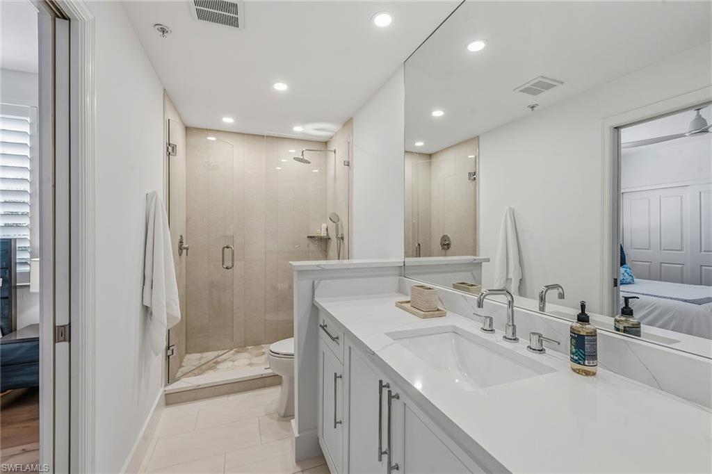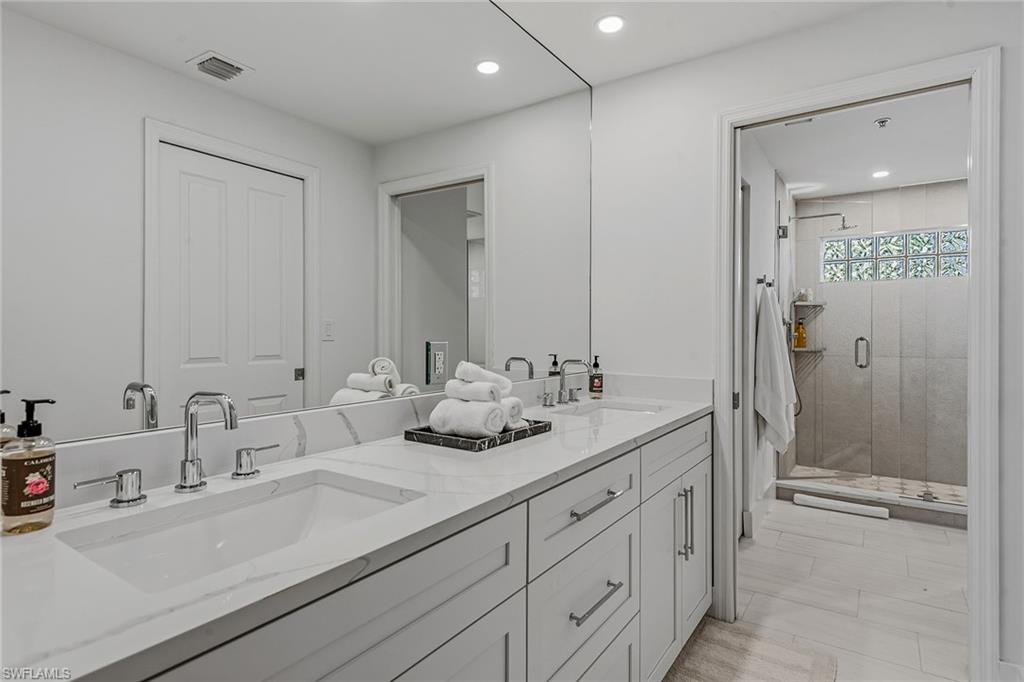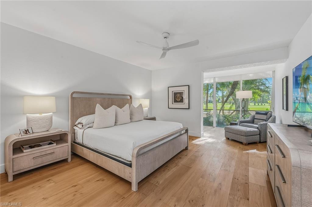 Experience elevated living in this stunning designer-remodeled and fully furnished three-bedroom, three-bath first-floor residence in the sought-after Eagle Creek Golf & Country Club. Thoughtfully reimagined from top to bottom, this end-unit home blends modern luxury with serene golf course living. Enter inside to discover premium white-oak engineered wood flooring, fresh contemporary paint throughout, and a beautifully updated kitchen featuring white wood cabinetry, quartz countertops, and top-tier appliances. The expansive floor plan offers both comfort and sophistication, highlighted by a welcoming living room and an impressive great room. Floor-to-ceiling sliding glass doors frame sweeping panoramic views of the golf course, inviting the outdoors into your daily living experience. The primary suite is a private sanctuary overlooking the greens, offering a generous walk-in closet and a luxuriously remodeled spa-like bath with designer finishes. A charming nook within the suite provides a space for an at-home office, complete with tranquil views. Guests will enjoy exceptional privacy thanks to the split-bedroom layout. Each of the two guest bedrooms is spacious, elegantly furnished and paired with its fully remodeled en-suite bath. Additional features include a detached one-car garage, an assigned parking space and convenient guest parking nearby. Near your door, Stonegate residents enjoy exclusive access to a private pool and spa, ideal for relaxation and sun-drenched afternoons. Beyond, the newly renovated Eagle Creek clubhouse offers championship golf, elevated dining and a dynamic year-round social scene. The nearby Crystal Lake clubhouse enhances the lifestyle with outdoor dining, a state-of-the-art fitness center, tennis and pickleball courts, and a resort-style pool surrounded by lush tropical landscaping. This exceptional residence is more than a home, it is an invitation to embrace the desired Naples lifestyle, defined by luxury, leisure and unmatched community amenities. Membership required.