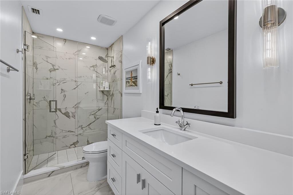 In the lush enclave of Eagle Creek Golf and Country Club, this exquisitely renovated villa redefines contemporary golf course living. Every element of this furnished three-bedroom, two-bath residence has been elevated with an emphasis on comfort, craftsmanship and connection to nature. New impact-resistant windows and doors frame the tranquil golf course and preserve views, bringing the outdoors in with a sense of calm sophistication. Inside, soaring vaulted ceilings with architectural skylights and two screened atriums flood the open layout with natural light, illuminating refined details such as imported Italian tile, updated interior doors and moldings, custom window coverings, and luxurious furnishings. At the heart of the home, the beautiful kitchen blends form and function. Striking quartz countertops with a waterfall island anchor the space, complemented by premium appliances and thoughtful design that invites daily living and effortless entertaining. In addition to the incredible living spaces, one will also find spacious and well-appointed bedrooms, two luxury baths, custom closet-built-ins and convenience of a one-and-a-half-car garage. Just a short distance away, the newly renovated clubhouse offers championship golf, refined dining and a vibrant social atmosphere. For those seeking leisure and wellness, the nearby Crystal Lake clubhouse presents outdoor dining, poolside relaxation, a fitness facility, pickleball, tennis and more. This one-of-a-kind residence invites you to experience the art of living beautifully in one of Southwest Floridau2019s intimate golf communities. Membership required.