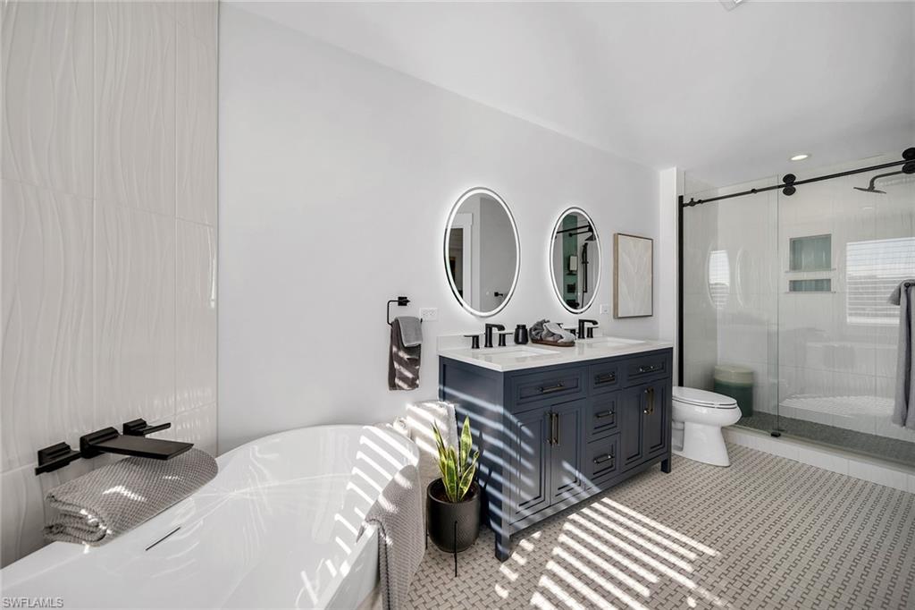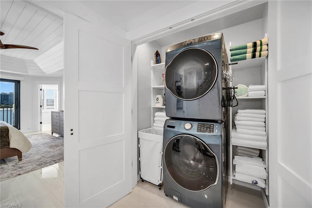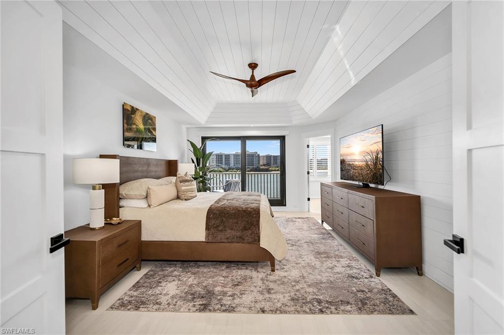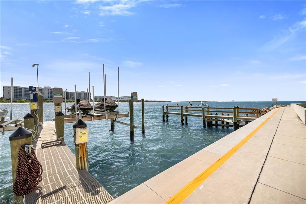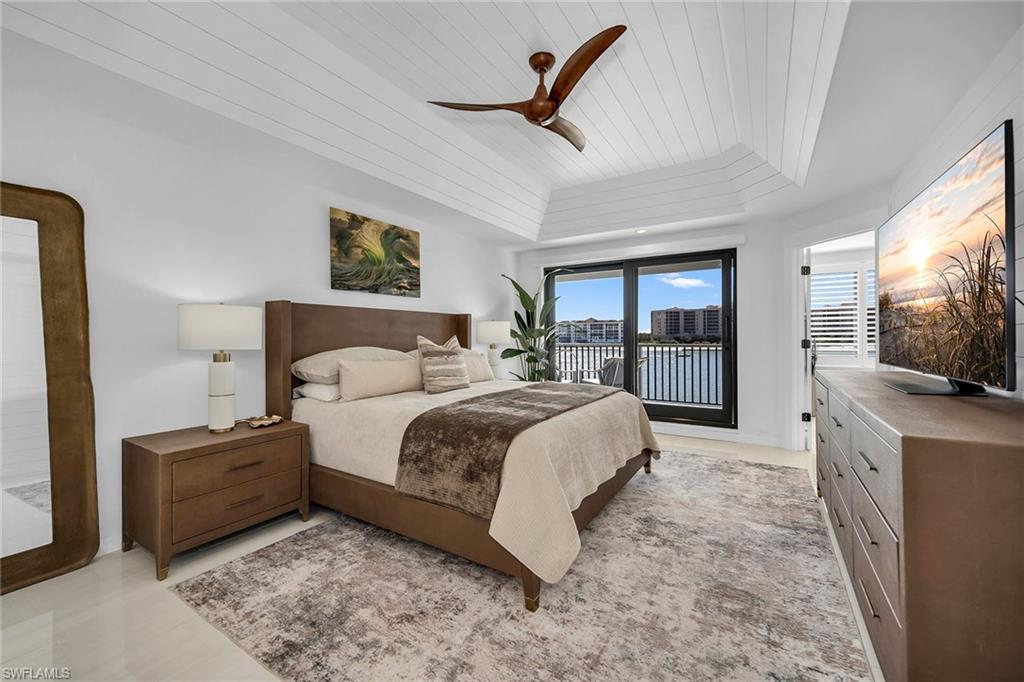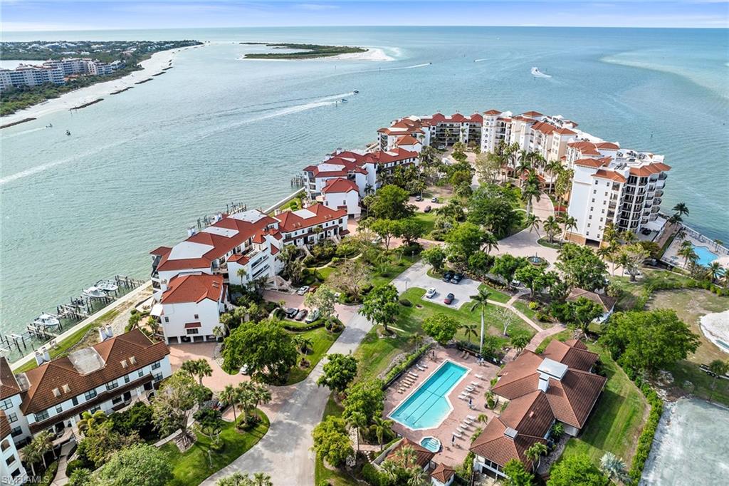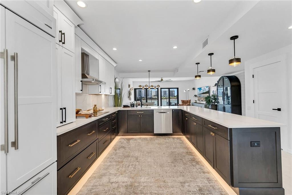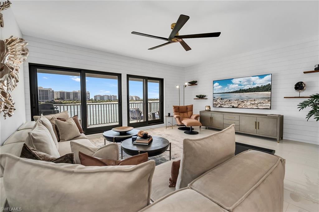 Experience mesmerizing southwest exposure and breathtaking, ever-changing water views from this fully reimagined luxury residence in the prestigious waterfront community of La Peninsula. Positioned to capture sweeping vistas where the Marco River meets the Gulf, this sophisticated third-floor retreat offers front-row views of dolphins, manatees, stingrays and passing boats, all enjoyed from the covered lanai with impact sliders and windows that provide year-round peace of mind. Nearly 1,800 square feet of inspired living space showcases an open-concept design by LivingStyles Interiors, blending coastal elegance with contemporary refinement throughout its spacious two-bedroom, 2.5-bath floor plan with a dedicated garage space. Inside, high-gloss polished porcelain tile flooring, shiplap accents on walls and ceilings, recessed lighting and modern fixtures set an elevated tone. A transformative 2023 remodel opened the main living areas, creating a seamless flow that highlights panoramic water views from every angle. Expansive glass invites natural light to illuminate beautifully curated furnishings and custom enhancements, including built-in shelving, upgraded doors and trim, and thoughtful storage solutions. The gourmet kitchen impresses with solid wood cabinetry, striking quartz countertops, under-cabinet and toe-kick lighting, and premium appliances including a Sub-Zero refrigerator, Wolf induction cooktop and speed oven, and an ultra-quiet Bosch dishwasher. A commercial-grade disposal and water filtration system add everyday convenience, while modern upgrades extend throughout the home with fully redesigned baths featuring basket-weave tile flooring, marble-topped vanities, and a spa-inspired primary suite boasting an expanded shower and freestanding soaking tub placed to capture the tranquil views. The primary suite also offers an oversized custom-designed closet for exceptional organization. Additional enhancements include a new Trane furnace and air conditioner, a Rheem water heater, upgraded electrical throughout, and the convenience of a dedicated garage parking space, along with private storage locker. Storm protection with impact windows and doors ensures comfort and security. Outdoors, a private dock with two lifts provides the ultimate amenity for boating or quiet waterfront leisure. Residents of La Peninsula enjoy a beautifully refreshed clubhouse with a library, game room and fitness center, along with a tropical waterfront pool and active social scene. Upcoming plans for a new sports complex, including pickleball, tennis and bocce courts, further elevate the coastal lifestyle. Milestone/structural inspection has been completed and passed with no assessments.