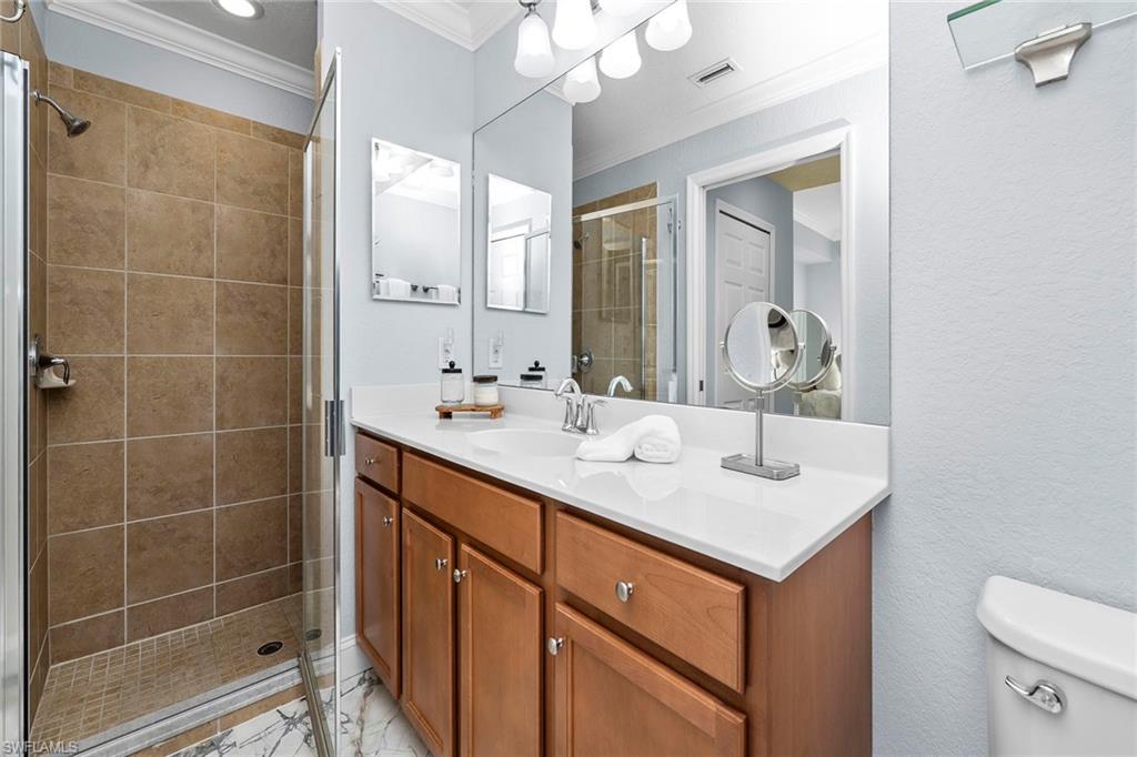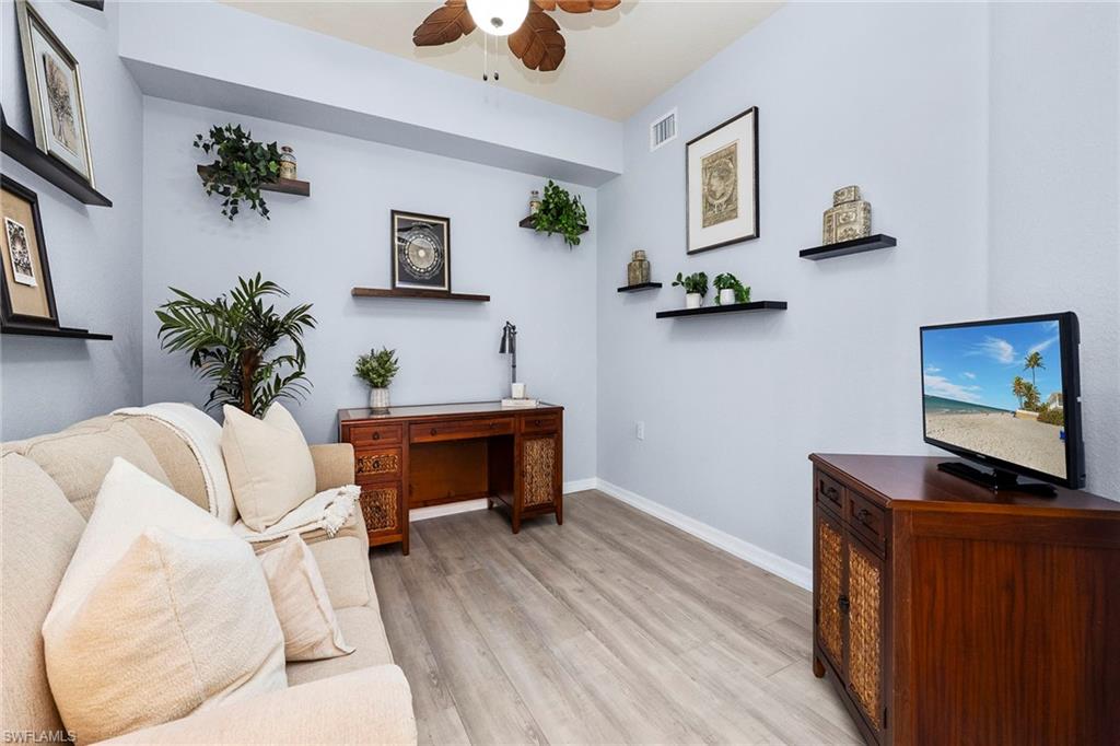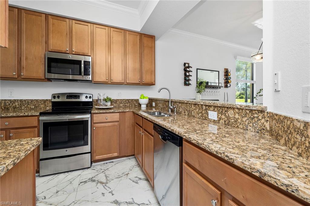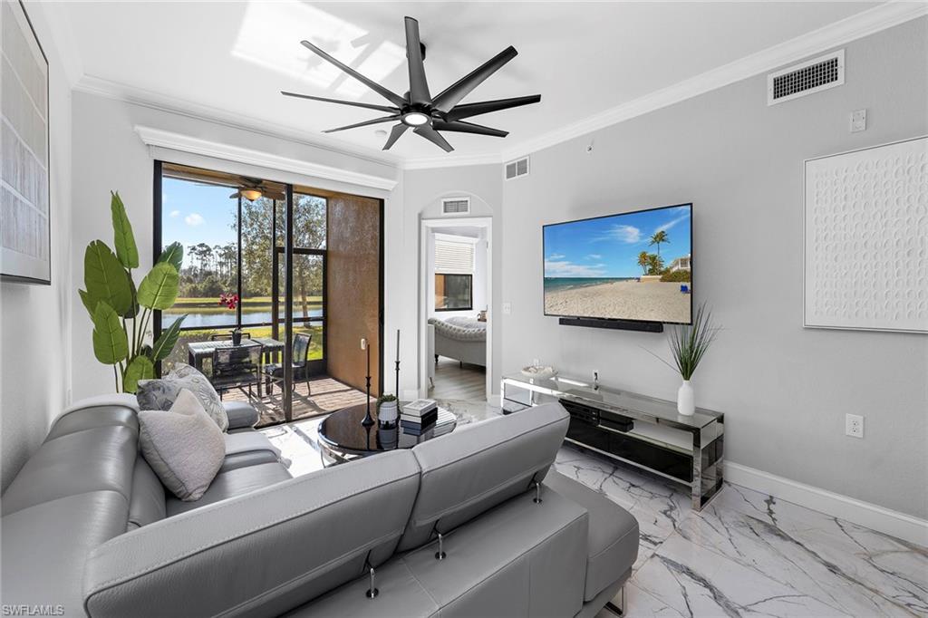 Own a full TPC golf membership with access to Treviso Bayu2019s renowned 18-hole Arthur Hillsu2013designed championship golf course in this first-floor end unit condominium, in one of Naples desirable golf communities. This sought-after two-bedroom plus den, two-bath residence is in the Acqua subdivision of Treviso Bay and offers effortless, stair-free living with an open, light-filled layout. Recent updates include new flooring in the bedrooms. The open-concept kitchen flows seamlessly into the living and dining areas and is highlighted by a clean white backsplash, stainless steel appliances, and ample cabinetry, while marble flooring enhances the main living spaces. The flexible den is ideal for a home office or guest space. Enjoy peaceful lake and preserve views from the private screened lanai, ideal for relaxing mornings or evenings. Treviso Bay offers a resort-style lifestyle with the Villa Rilassare clubhouse, fitness center with classes, full-service spa and salon, resort-style pool with waterfall and tiki bar, tennis, pickleball, bocce, basketball, on-site dining and more, all within a 24-hour guard-gated community conveniently minutes from downtown Naples, Fifth Avenue South, shopping, dining and world-famous beaches.