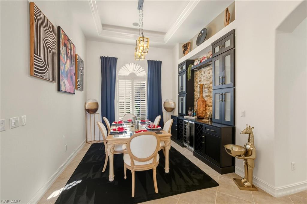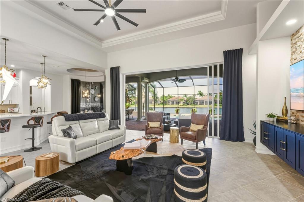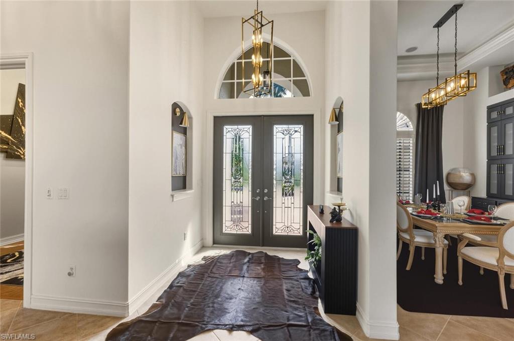 Welcome to this exceptionally updated 4-bedroom + den lakefront home in the prestigious Majors at Lely Resort, ideally situated on a quiet cul-de-sac within a double-gated community and offered with a deeded Players Club & Spa membershipu2014NO waitlist. This fully furnished residence showcases a one-of-a-kind interior, thoughtfully redesigned with unique custom finishes, accent walls, and built-in features throughout.Enter through double glass front doors and immediately take in the wide, tranquil lake view that fills the home with natural light. Designed for seamless indoor-outdoor living, the great room opens to a huge covered lanai overlooking the water, complete with a heated pool and hot tub, outdoor fireplace, outdoor kitchen, and multiple seating and dining areasu2014perfect for entertaining or relaxing in total privacy.The updated white kitchen features stainless steel appliances, ample cabinetry, and flows effortlessly into the main living and dining spaces, enhanced by crown molding and recessed lighting. Throughout the home, youu2019ll find plantation shutters in every room, adding timeless elegance.The owneru2019s suite is a private retreat with his-and-her custom built-in closets, a convenient coffee bar, and a spa-inspired bathroom featuring a walk-in shower and freestanding soaking tub. One guest bedroom is brilliantly designed with a built-in desk and queen-size Murphy bed, making it ideal for a home office or flex space.Additional features include a private laundry room with utility sink and abundant storage, a 2021 roof, and power and manual storm shutters across the lanai for peace of mind.As a resident, enjoy full access to the Players Club & Spa, offering resort-style pools, fitness center, dining, tiki bar with entertainment, tennis, pickleball, bocce, and a vibrant social calendar for all ages.Luxury, lifestyle, and location converge in this beautifully updated lakefront homeu2014move-in ready and truly unique.