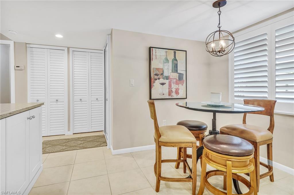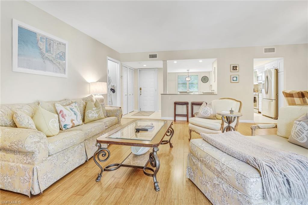 Beautifully decorated and finished with style and practicality and a split bedroom plan offering privacy for both owner and guests. The kitchen is open and bright with dining space and quality cabinetry, and the living/dining room opens to lanai with a view of the landscaped community gardens overlooking the pool. Newer AC is set up, including the lanai, so that you can have an open-air lanai or integrated as part of the living area. The kitchen features soft-close drawers, glass-front cabinets, built-in wood organizing pullout drawers, granite countertops and herringbone marble tile backsplash, reach-in pantry with pullout shelving and all Samsung stainless steel kitchen appliances. Other features include a full-size stackable washer/dryer with stainless interior, bamboo flooring in the main living area and carpet in bedrooms. The owneru2019s suite opens to the lanai and has a walk-in closet, second reach-in closet, marble vanity with dual sinks and retiled shower. The guest suite closes off with a pocket door, walk-in closet and bath. One assigned carport space and abundant guest parking. Pool, spa, BBQ area and chickee for gathering.Condo Applications require a minimum of 25 days for approvals.