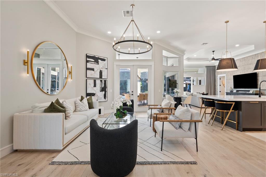 Perfectly positioned at the end of a quiet cul-de-sac, on a picturesque street within the highly sought after Mill Run community, this beautifully renovated single-family residence has been completely remodeled and offers exceptional style, comfort, and functionality. Featuring gorgeous wood flooring, elegant finishes, and a bright open layout, the home showcases soaring ceilings with stunning architectural details, soft neutral tones, and walls of windows that create light-filled living spaces throughout the day. The impressive floor plan offers multiple living areas ideal for both everyday living and entertaining, including two spacious living rooms. In addition to four private bedrooms thoughtfully separated for privacy, the home also features a dedicated office and a separate kids playroom/den, providing flexible spaces to suit a variety of needs. The main gathering room flows seamlessly into the kitchen, creating an ideal setting for everyday living and hosting. The kitchen is a true centerpiece, featuring custom cabinetry, a hidden pantry, and the rare convenience of two dishwashers, making it perfectly suited for both daily living and entertaining. Additional custom built-ins can be found throughout the home, enhancing both function and design, while the inclusion of two washers and two dryers provides exceptional convenience for modern living. The outdoor living experience truly sets this home apart. An impressive screened lanai creates a resort-style retreat complete with multiple seating areas, an outdoor kitchen, and a beautiful saltwater pool and spa. The expansive yard provides plenty of green space along with a fire pit area, perfect for entertaining or relaxing under the stars. Curb appeal is equally striking with a paver driveway, stone exterior accents, manicured landscaping, and a newer roof. Additional improvements including newer HVAC and water heater, whole-house replumbing, impact windows, and more. Mill Run is a popular, low-fee North Naples community known for its prime location, making this a rare opportunity to enjoy luxury living in one of the areau2019s most desirable neighborhoods.