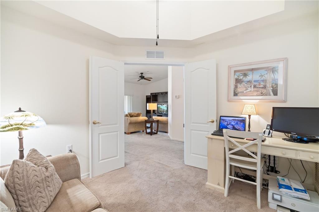 Enjoy easy Florida living in this 2-bedroom + den, 2-bath residence in the highly desirable Cypress Woods Golf & Country Club. This light-filled home features an open-concept floor plan, tile flooring in the main living areas, and a seamless flow from kitchen to dining and living spaces.The kitchen offers granite countertops, rich wood cabinetry, stainless appliances, and a breakfast bar, plus a cozy breakfast nook with peaceful water and golf course views. The primary suite provides a relaxing retreat with an ensuite bath and ample closet space, while the split-bedroom layout ensures privacy for guests. A versatile den is ideal for a home office or additional living space.Relax on the screened lanai overlooking tranquil water and manicured fairways. Additional highlights include a private garage, in-unit laundry, and well-maintained interiors.This unit is being sold turnkey with it's tasteful furniture included -- bring your golf clubs & a toothbrush and you can move right in!Located in Cypress Woods, a bundled golf community, residents enjoy full golf privileges, clubhouse dining, resort-style pool, fitness center, tennis, pickleball, and an active social calendaru2014all included. Conveniently close to Naples beaches, shopping, dining, and I-75.