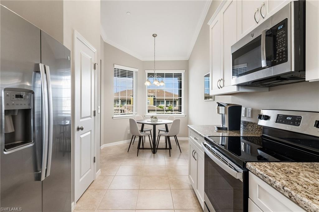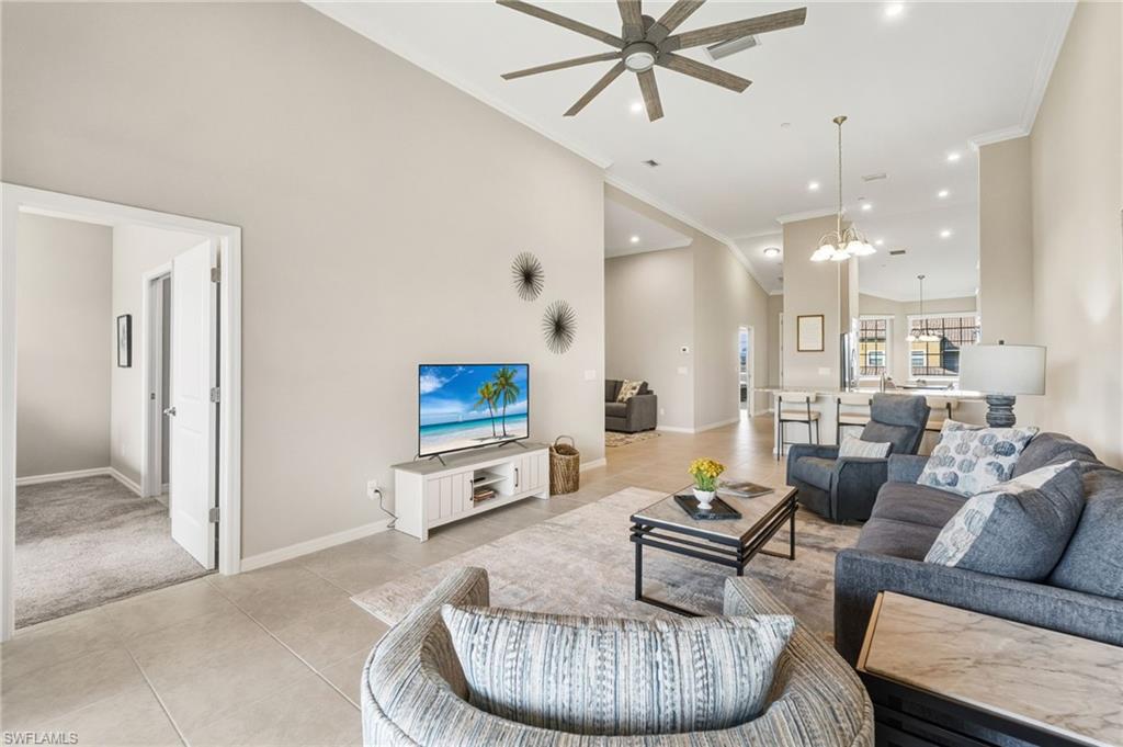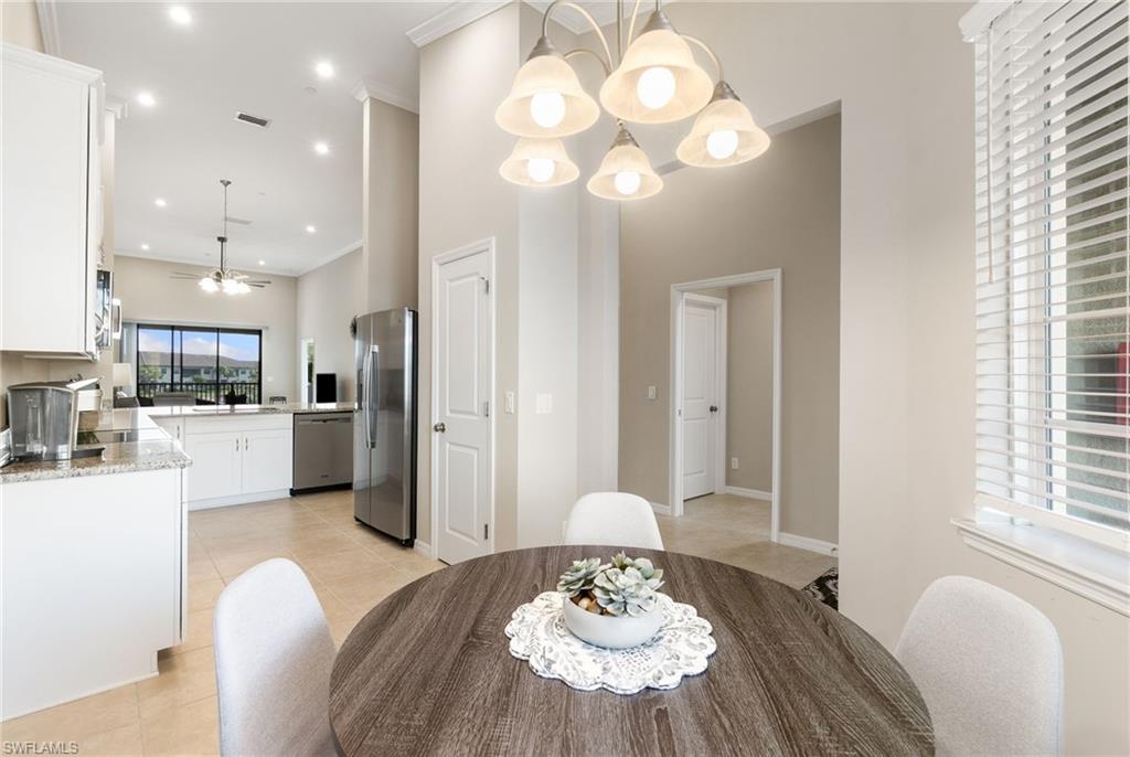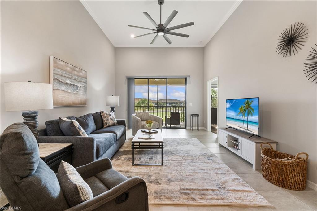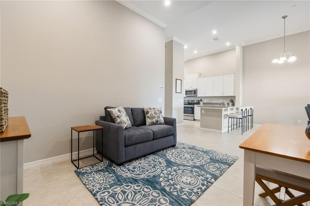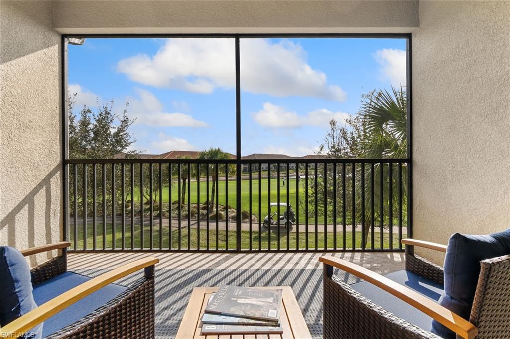 This beautifully appointed second-floor coach home condo at Esplanade Golf & Country Club in Naples is a must see with all new furniture throughout. Enjoy eastern facing golf course views as you relax on the screened lanai and take in all the action on the green. This newer construction condo has everything including in-demand open floor plan, 14u2019 ceilings, and a detached 1 car garage. This stylish, coastal home features 2 bedrooms plus oversized den, an eat-in kitchen and breakfast bar, granite countertops, and GE stainless steel appliances. The primary bedroom has golf course views and two walk-in closets along with large en-suite bath with dual vanities. This property comes with a SOCIAL/SPORTS MEMBERSHIP which offers full access to all of Esplanade G&CC amenities including limited golf. Esplanade Golf & Country Club is conveniently located in North Naples where resort-style living includes a spectacular new clubhouse, 18-hole golf course, 14 miles of walking trails, resort pools and cabanas, tennis, bocce, pickleball, dog park and state-of-the-art fitness center with luxurious Koquina Day Spa. The culinary center features three delectable restaurants ranging from casual to fine dining. Enjoy coffee and pastries in the cafe, refreshments and casual dining in the Barrel House Bistro and Tap or indulge at Dodici 951, all with indoor and alfresco dining options.