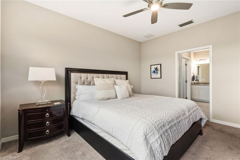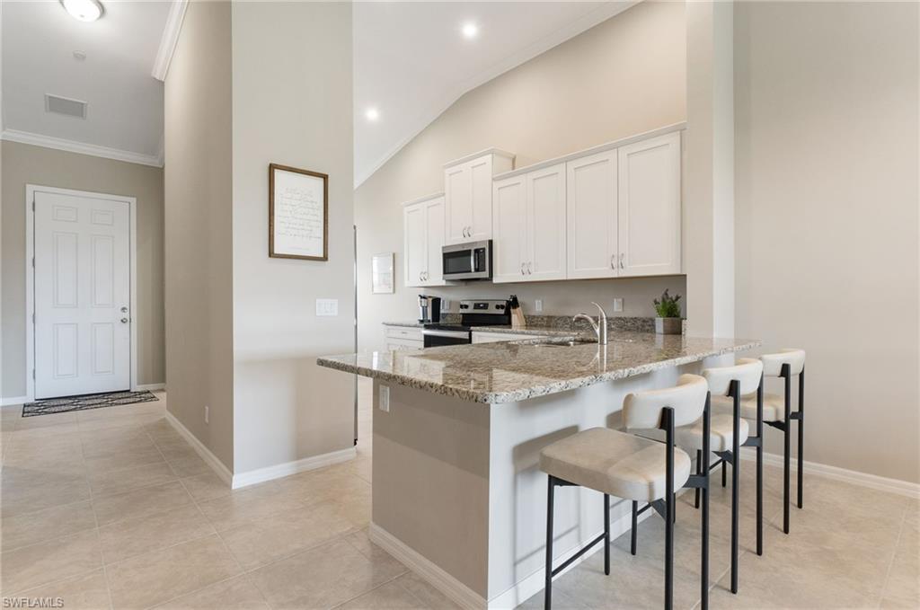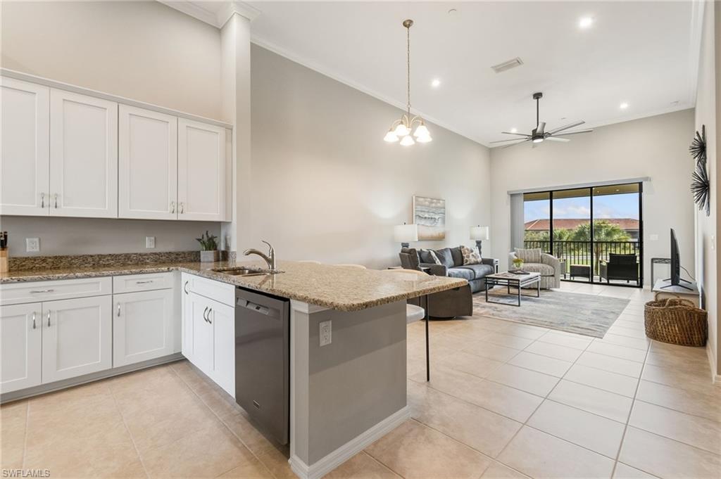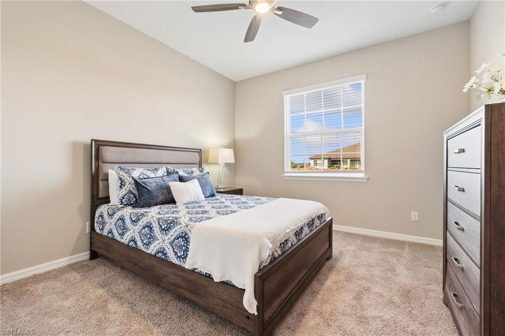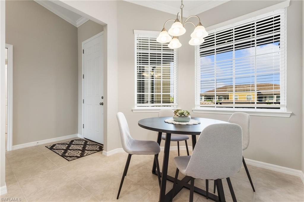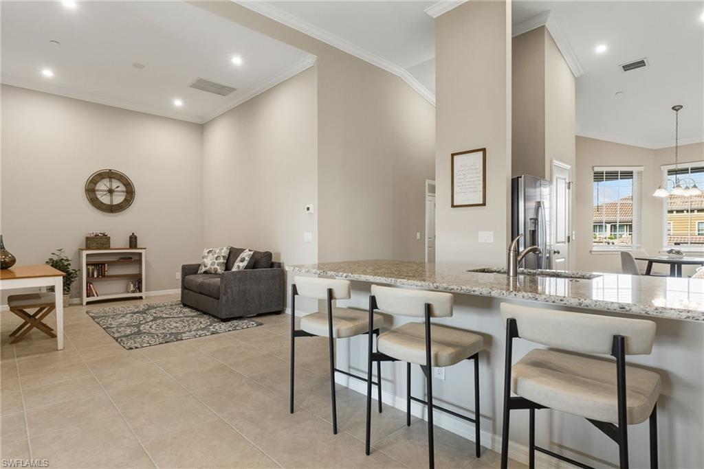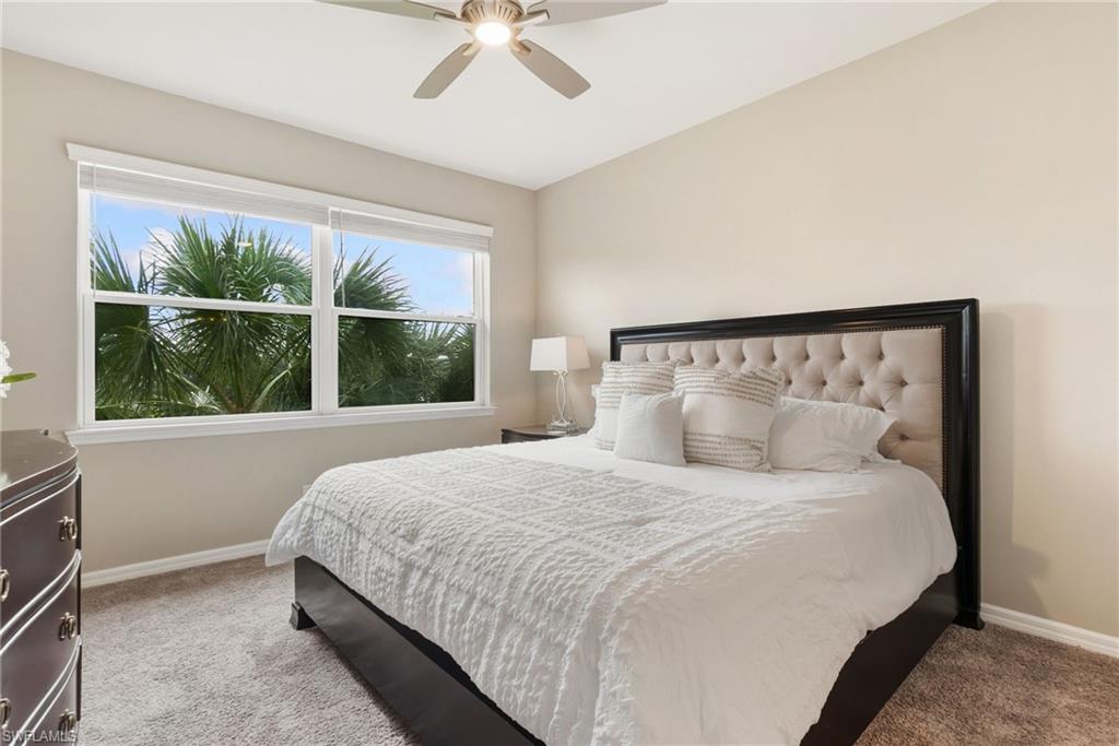 This beautifully appointed second-floor coach home condo at Esplanade Golf & Country Club in Naples is a must see with all new furniture throughout. Enjoy eastern facing golf course views as you relax on the screened lanai and take in all the action on the green. This newer construction condo has everything including in-demand open floor plan, 14u2019 ceilings, and a detached 1 car garage. This stylish, coastal home features 2 bedrooms plus oversized den, an eat-in kitchen and breakfast bar, granite countertops, and GE stainless steel appliances. The primary bedroom has golf course views and two walk-in closets along with large en-suite bath with dual vanities. This property comes with a SOCIAL/SPORTS MEMBERSHIP which offers full access to all of Esplanade G&CC amenities including limited golf. Esplanade Golf & Country Club is conveniently located in North Naples where resort-style living includes a spectacular new clubhouse, 18-hole golf course, 14 miles of walking trails, resort pools and cabanas, tennis, bocce, pickleball, dog park and state-of-the-art fitness center with luxurious Koquina Day Spa. The culinary center features three delectable restaurants ranging from casual to fine dining. Enjoy coffee and pastries in the cafe, refreshments and casual dining in the Barrel House Bistro and Tap or indulge at Dodici 951, all with indoor and alfresco dining options.