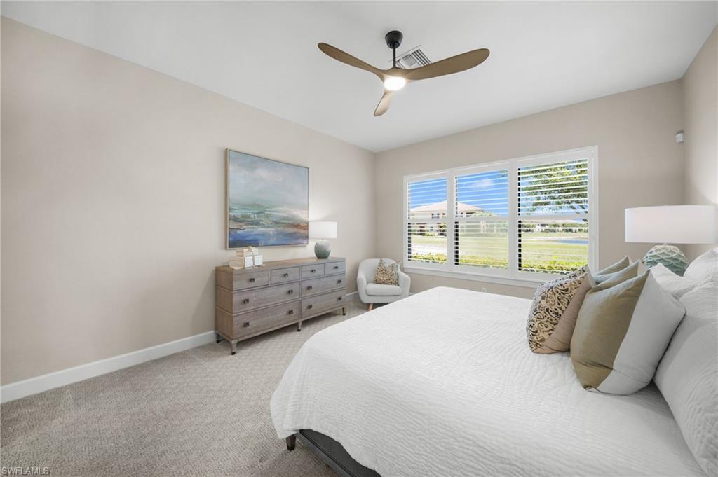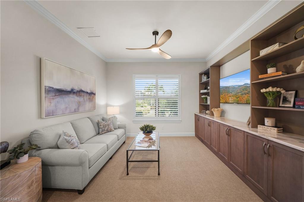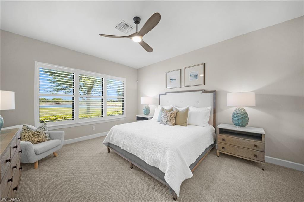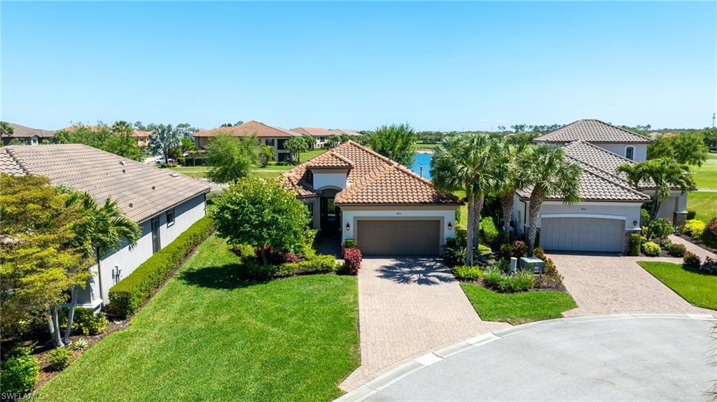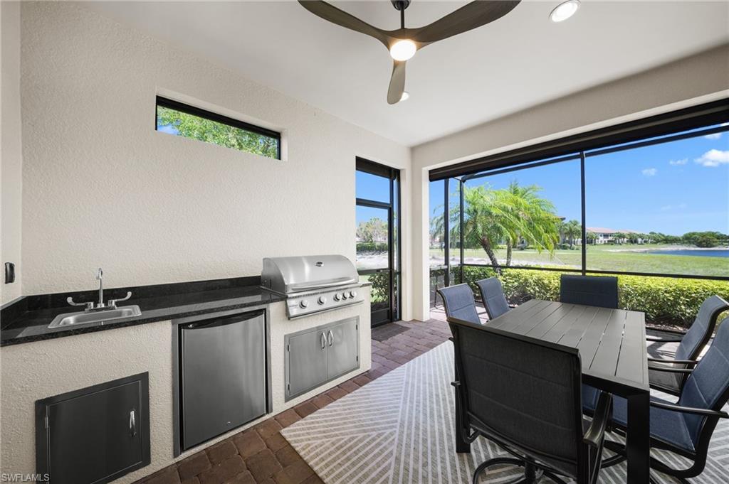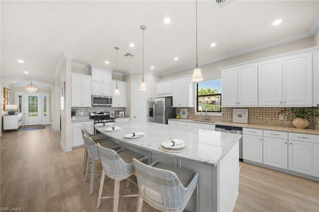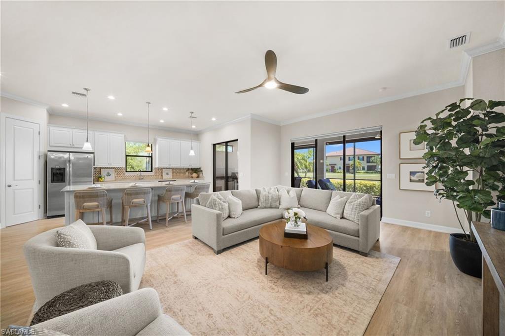 LIVE A VACATION LIFESTYLE IN ESPLANADE! FULL GOLF MEMBERSHIP INCLUDED! This immaculate and well appointed u201cLaziou201d is situated on an oversized cul-de-sac lot overlooking two lakes and the 7th green. Inside, you will find 3 bedrooms, den, 3 full baths, and just 2300 sq ft of open concept living space. From the moment you walk in the door, you are greeted with wood floors throughout the common areas and two sets of sliding glass doors to the extended lanai complete with outdoor kitchen and can be enclosed by motorized roll down hurricane screens. The kitchen is the heart of the home and features raised panel cabinetry, Cambria quartz countertops, and stainless steel appliances including a GAS range. Other fine appointments include: oversized tandem 3 car garage; freshly painted exterior; stone detail on the front of the home; new HVAC; crown molding & wainscoting details; brand new ceiling fans throughout; master bedroom closet built-ins; plantation shutters on all windows; walk-in showers in all baths; hurricane impact front door with matching sidelights; spacious Laundry Room with cabinetry; 8' doors/10' ceilings; and more!Esplanade Golf & Country Club of North Naples offers a true u201cLifestyle Communityu201d with world-class amenities, including a resort pool with cabanas and the popular u201cBahama Bar,u201d tennis, pickleball, bocce, a 14-mile network of bike/walking trails, and an 18-hole private golf course. The impressive 15,000 Sq Ft clubhouse features a restaurant, bar, wine-tasting room, wine lockers, and a Starbucks-style cafu00e9. Best of all, the propertyu2019s landscaping, irrigation, golf membership, and all community amenities are covered under a quarterly fee of just $3,743u2014no additional fees or memberships required! Don't miss your opportunity to own this exceptional home in one of Naplesu2019 most sought-after communities. Schedule your tour of this stunning home and Esplanade Golf & Country Club today! COMING SOON TO ESPLANADE (2026): Fully renovated and expanded poolside Bahama Bar; expanded outdoor bar at the Barrel House; expanded golf practice range; and an AIR CONDITIONED INDOOR PICKLEBALL COMPLEX with four indoor courts.