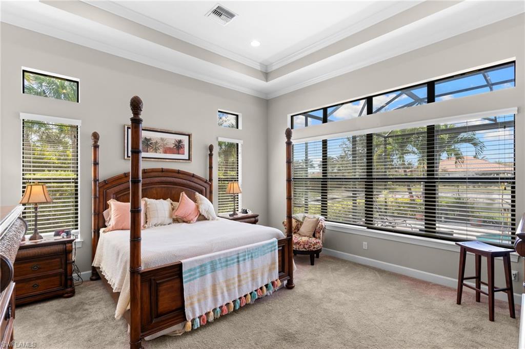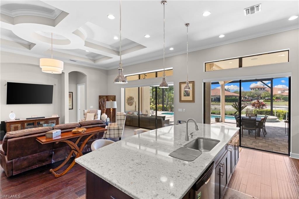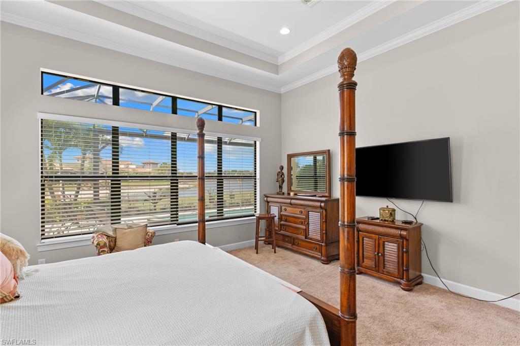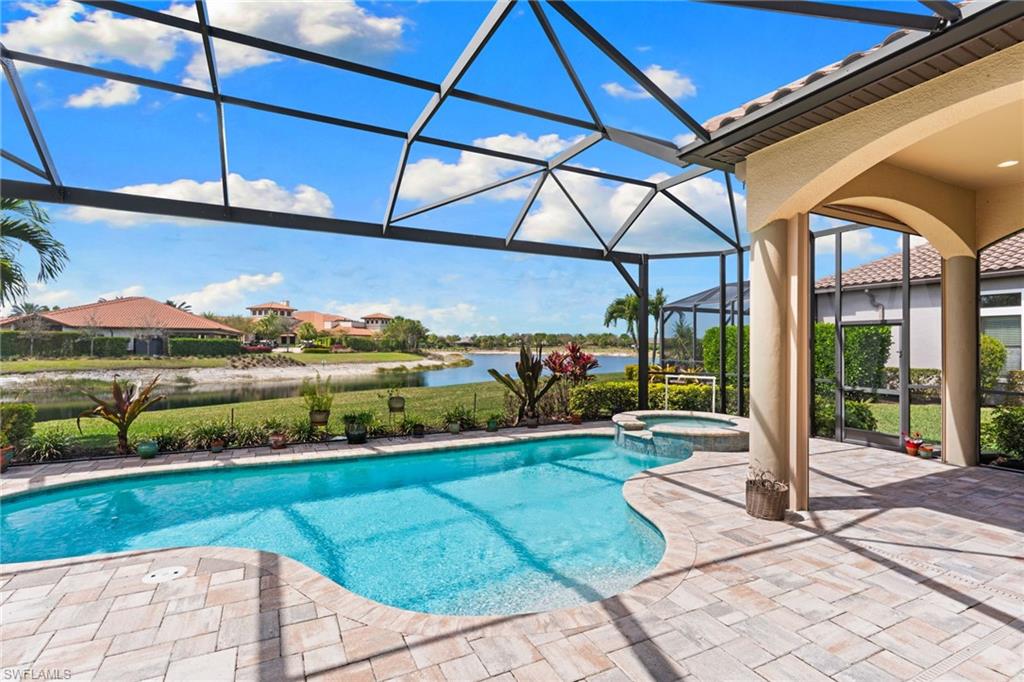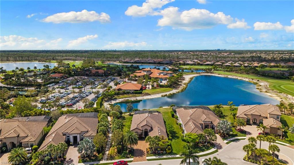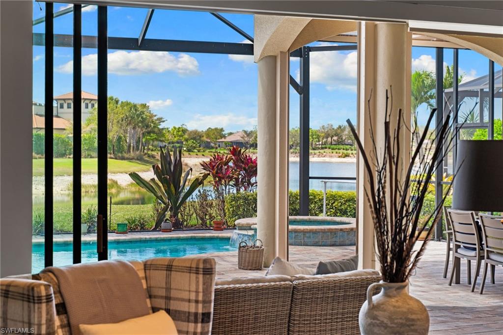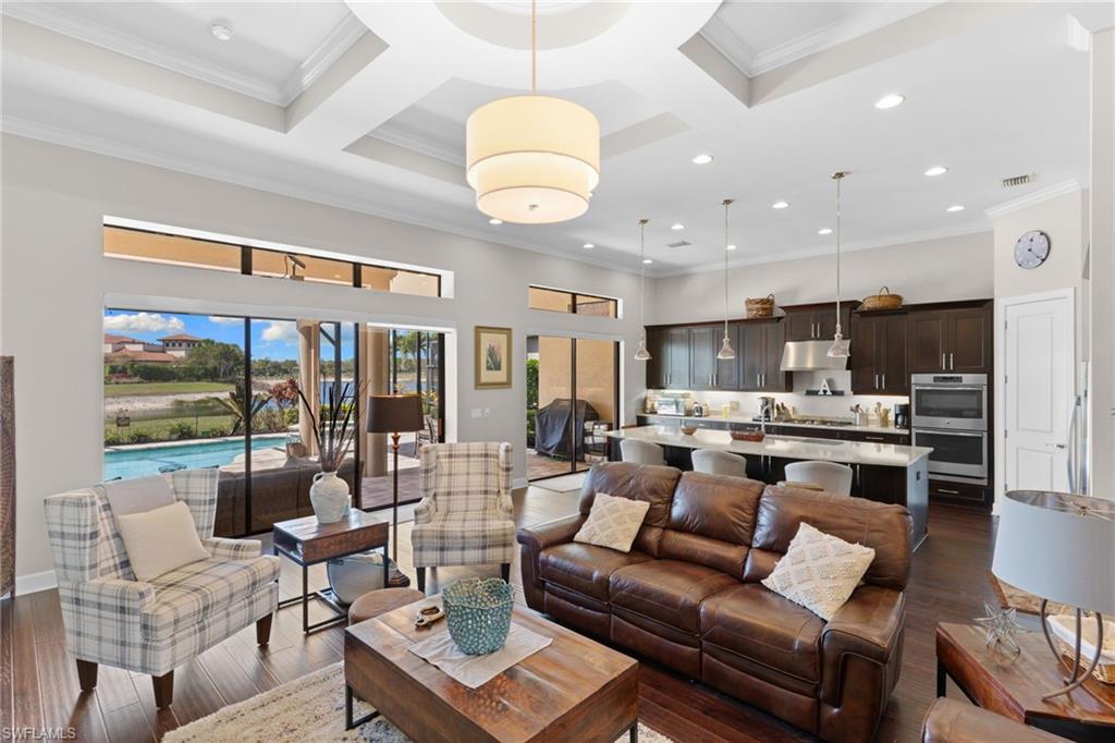 Discover unparalleled luxury and sophistication at 9012 Sorreno Ct, one of a kind home is nestled in the prestigious Esplanade Golf & Country Club of Naples. This Francesco floor plan sits on a premier, oversized lot with long water views, western exposure, and includes a FULL GOLF MEMBERSHIP. Located conveniently next to the club pathway, affording you privacy but quick access to all Esplanade has to offer. Inside the beautiful wood floors give way to a large open floor plan and up to soaring coffered ceilings. Waking up in the master suite is a treat - private, long lake views and warm sun flood the room through the large windows. For maximum privacy, your guest bedrooms are split to provide peace and tranquillity, each with private en-suite baths. The oversized pool and elevated spa sits under a modern, panoramic screen - allowing you to soak in every warm sunset over the lake. Open the pocketing sliding doors and let down your lanai hurricane screens to enjoy the true Florida indoor-outdoor lifestyle. Your 3-car-garage is ideal for car enthusiasts or for shop space - complete with elevated storage and workbench. Esplanade offers the ultimate Florida lifestyle, granting access to world-class amenities including an 18-hole private golf course, resort-style pool with cabanas and Bahama Bar, tennis, pickleball, bocce, Koquina Day Spa, fitness center, dog parks, 14 miles of biking and walking trails, and a 15,000-square-foot clubhouse with fine dining, bar, wine tasting room, wine lockers, and a coffee cafe u2014all covered under low quarterly dues with no additional fees. Don't miss this rare opportunity to own a slice of paradise; schedule your private showing today!