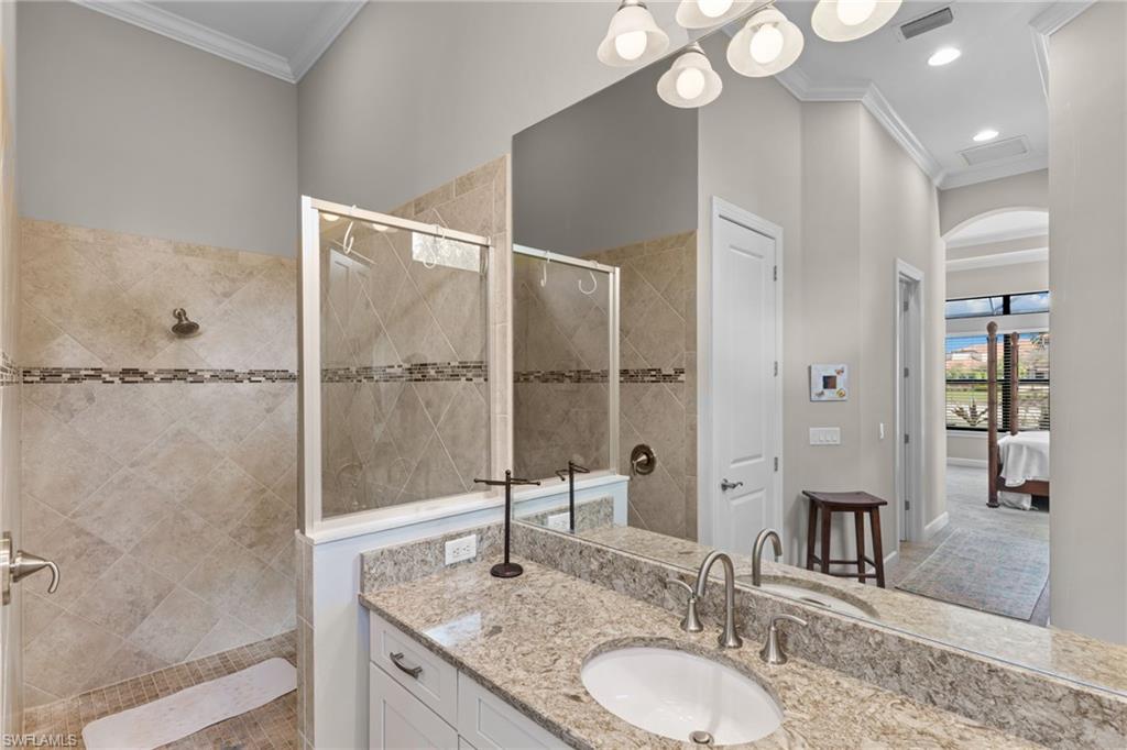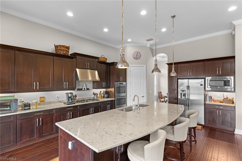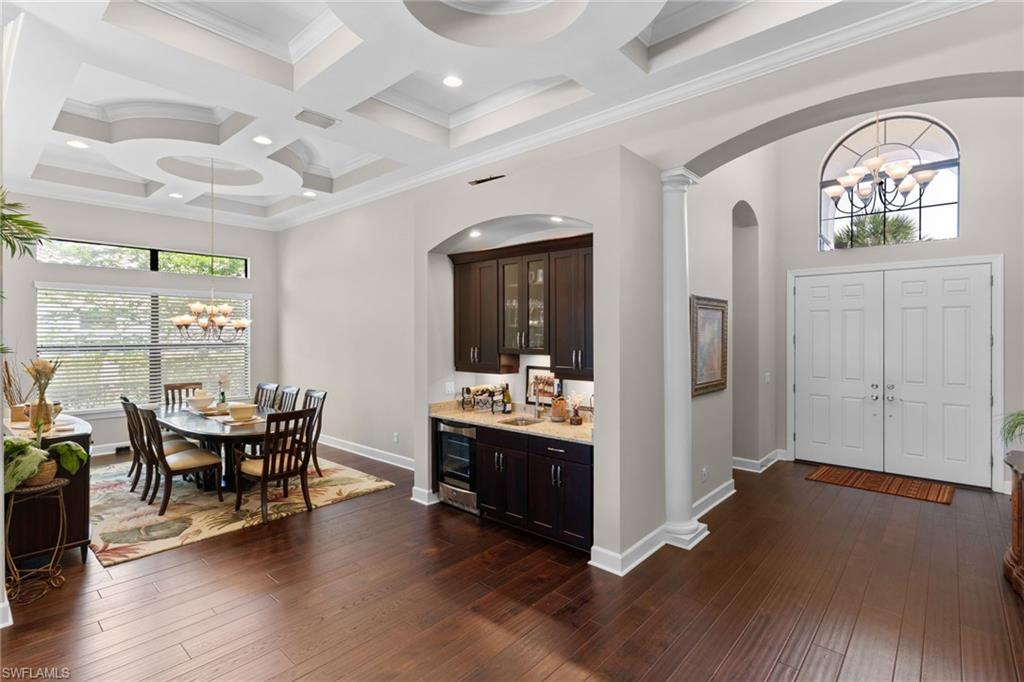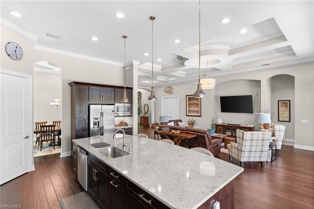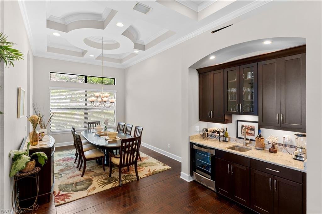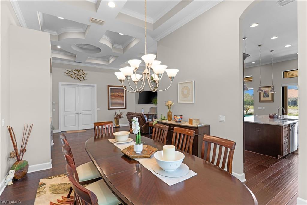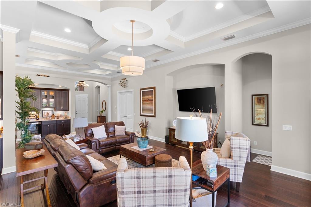 Discover unparalleled luxury and sophistication at 9012 Sorreno Ct, one of a kind home is nestled in the prestigious Esplanade Golf & Country Club of Naples. This Francesco floor plan sits on a premier, oversized lot with long water views, western exposure, and includes a FULL GOLF MEMBERSHIP. Located conveniently next to the club pathway, affording you privacy but quick access to all Esplanade has to offer. Inside the beautiful wood floors give way to a large open floor plan and up to soaring coffered ceilings. Waking up in the master suite is a treat - private, long lake views and warm sun flood the room through the large windows. For maximum privacy, your guest bedrooms are split to provide peace and tranquillity, each with private en-suite baths. The oversized pool and elevated spa sits under a modern, panoramic screen - allowing you to soak in every warm sunset over the lake. Open the pocketing sliding doors and let down your lanai hurricane screens to enjoy the true Florida indoor-outdoor lifestyle. Your 3-car-garage is ideal for car enthusiasts or for shop space - complete with elevated storage and workbench. Esplanade offers the ultimate Florida lifestyle, granting access to world-class amenities including an 18-hole private golf course, resort-style pool with cabanas and Bahama Bar, tennis, pickleball, bocce, Koquina Day Spa, fitness center, dog parks, 14 miles of biking and walking trails, and a 15,000-square-foot clubhouse with fine dining, bar, wine tasting room, wine lockers, and a coffee cafe u2014all covered under low quarterly dues with no additional fees. Don't miss this rare opportunity to own a slice of paradise; schedule your private showing today!