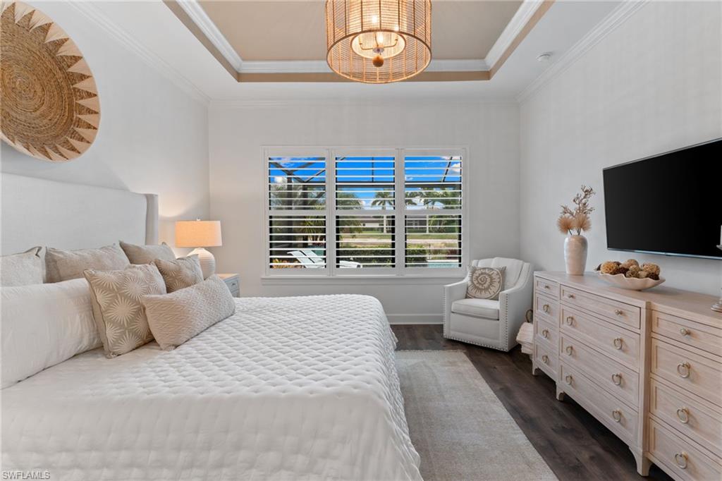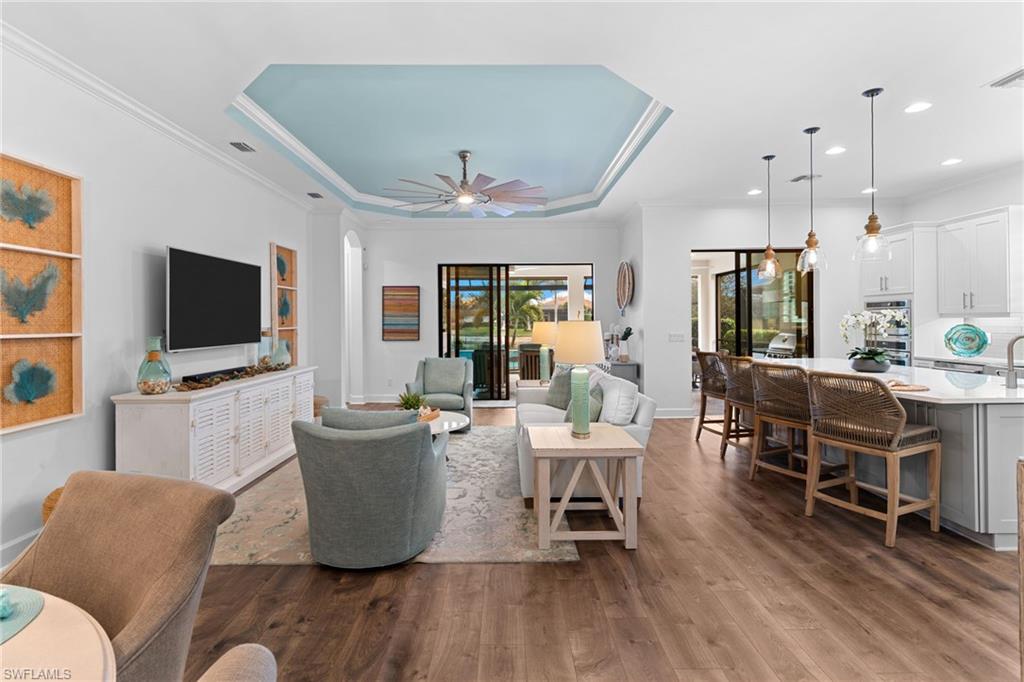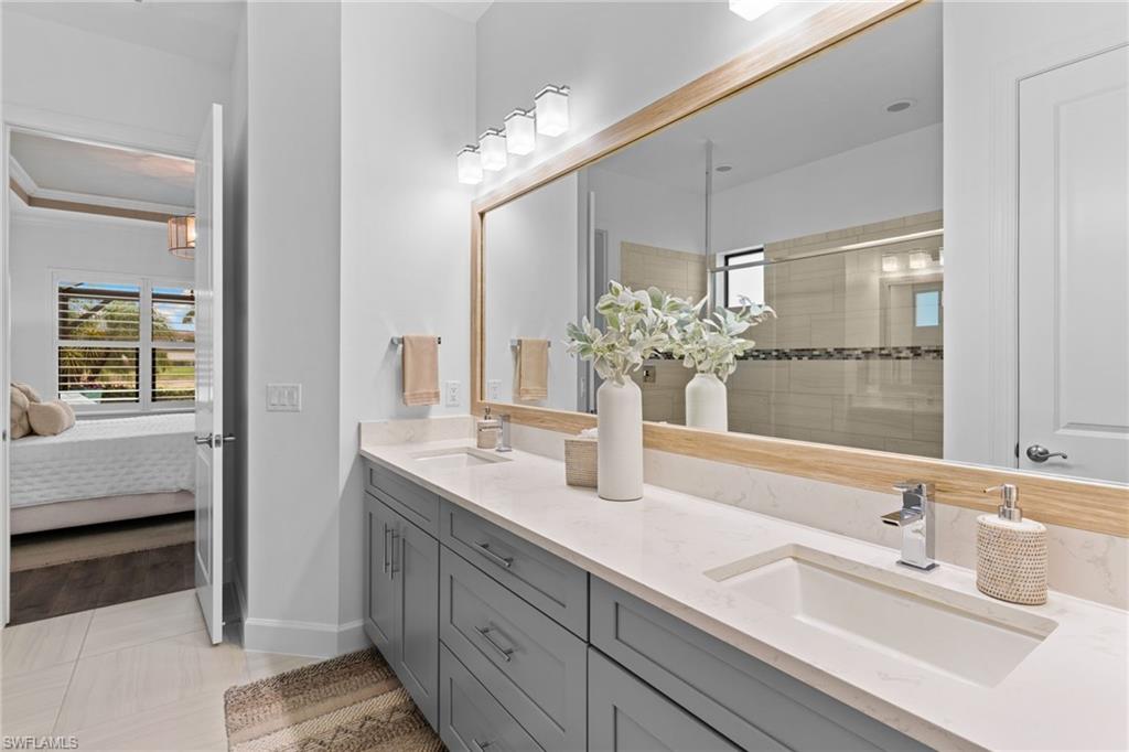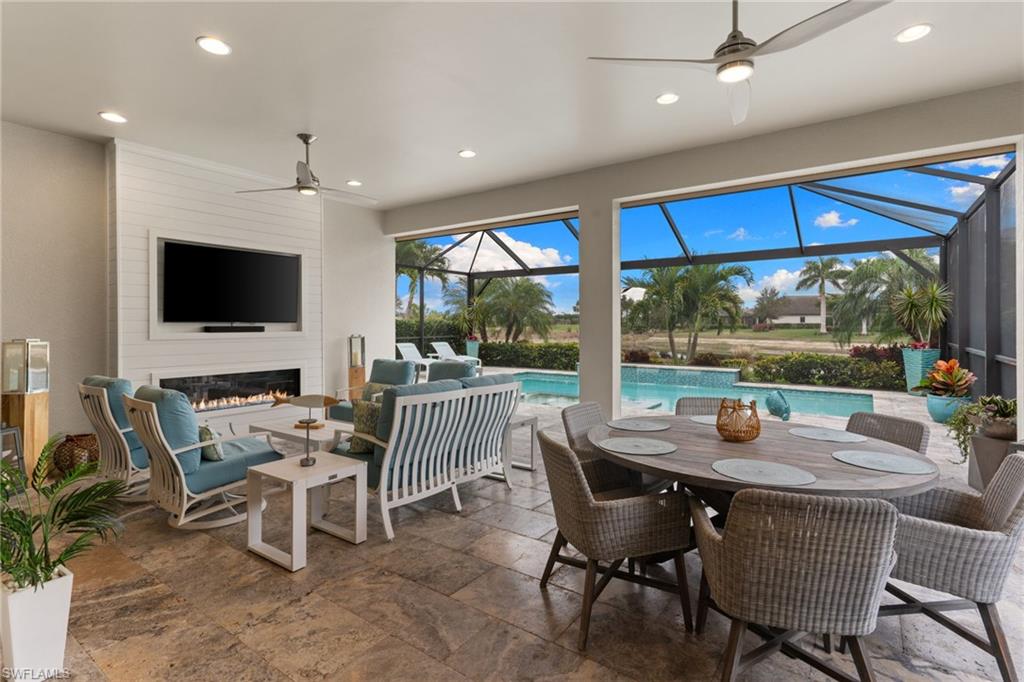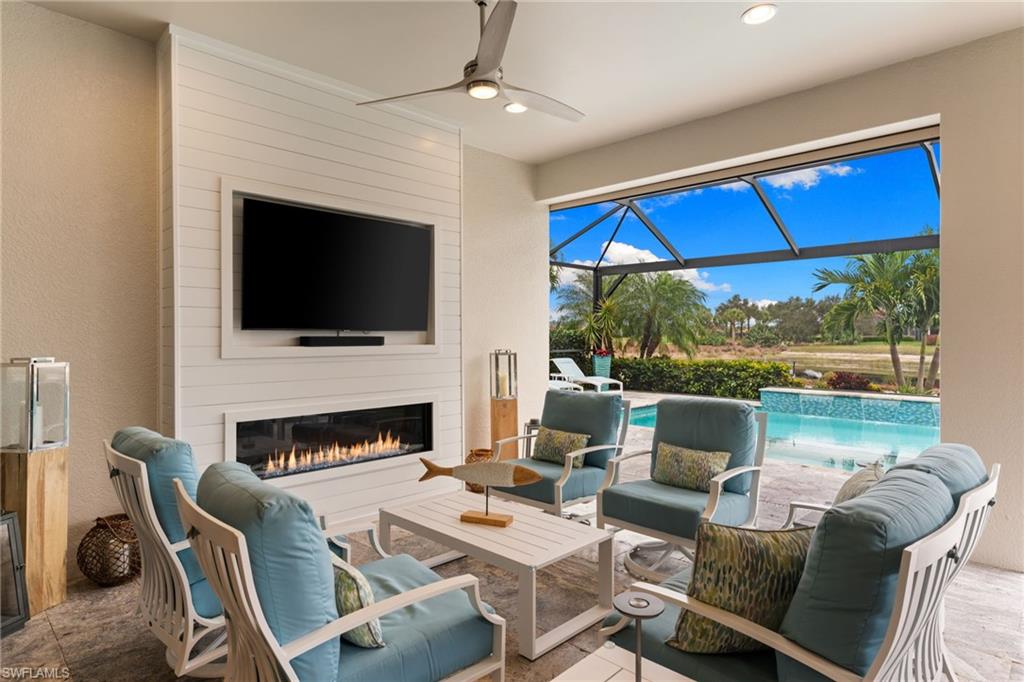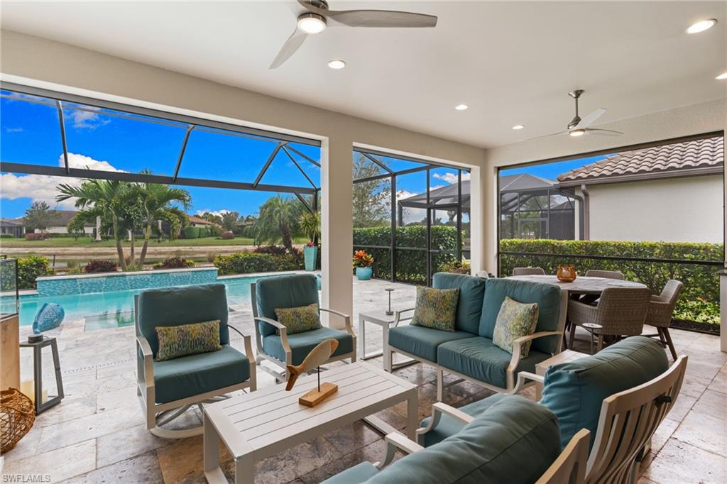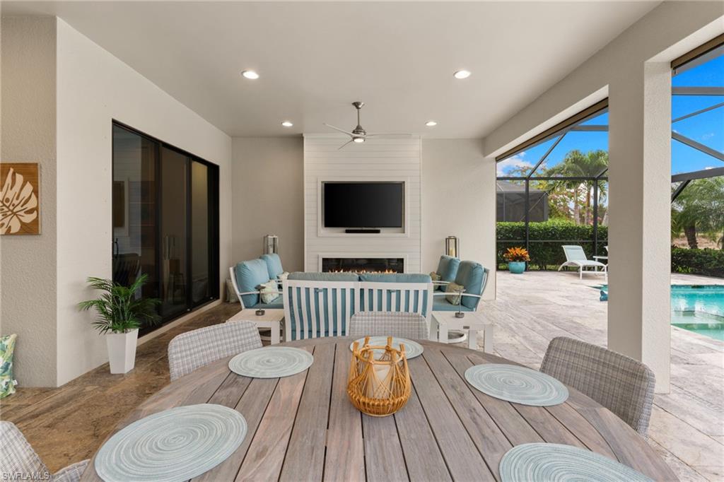 Welcome to 9334 Terresina Drive, your chance to own in the exclusive Esplanade Golf & Country Club of North Naples with a full-golf membership, deeded to your home. Every inch of this Lazio model has been meticulously maintained and upgraded, an exceptional opportunity to live a lifestyle that you have always dreamed of. A perfectly furnished ready-to-live, 3-bedroom, 3-bath residence with just under 2,300 square feet of open-concept living space - complemented by southern exposure, long lake views, and the pristine golf course. Stepping in, you are fully protected from all elements as natural light flows through the hurricane windows and wide open lanai. Unique to only this home the custom designs, accents, and furnishings are all included. The entire home showcases luxury: vinyl plank flooring throughout, crown molding, custom wall details, and elegant tray ceilings that add architectural interest to the main living areas and master suite. The heart of this home is the thoughtfully expansive kitchen, featuring premium shaker-style cabinetry, stunning Cambria quartz countertops, a gas cooktop with double wall oven, and all high-end stainless steel appliances. Each guest rooms includes itu2019s own, beautiful ensuite and the split layout allows for maximum privacy for you and your visitors. The outdoor living space is nothing short of spectacular - updated with beautiful travertine stone, a custom outdoor kitchen, and cozy seating around a built-in fireplace. Embrace the indoor-outdoor lifestyle by lowering the StormSmart electric screens and expanding your living area by opening the sliding doors. All this overlooking your pristine saltwater pool and spa - with all new pool equipment installed over the last three years. Professional landscaping with integrated lighting transforms the backyard into a private oasis, while the extra-wide driveway and epoxy-finished garage floor add both functionality and style. Outfitted with a Generac 24KW whole-house, natural gas generator for peace of mind. Kinetico whole-house water filtration and softening systems, impact windows throughout, plantation shutters grace all windows, a tankless gas hot-water heater, freshly painted inside (2024) and out (2023), ensuring a move-in ready experience that is seamless and worry-free.Best of all, your quarterly fee of just $3,743 covers full golf membership, landscaping maintenance, irrigation, and access to all of Esplanade's world-class amenitiesu2014including the resort pool with Bahama Bar, tennis, pickleball, bocce courts, a 14-mile network of trails, and the impressive 15,000-square-foot clubhouse with restaurant, wine-tasting room, and cafu00e9. With exciting upgrades coming in 2026, including an air-conditioned indoor pickleball complex, this is your chance to secure a meticulously upgraded home in Naples' finest golf community.