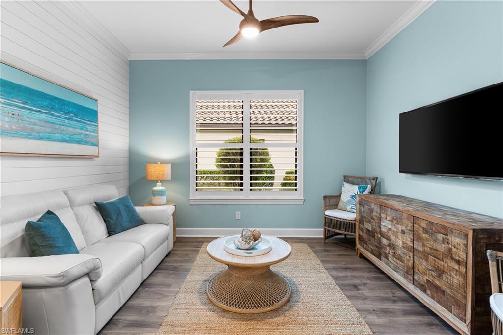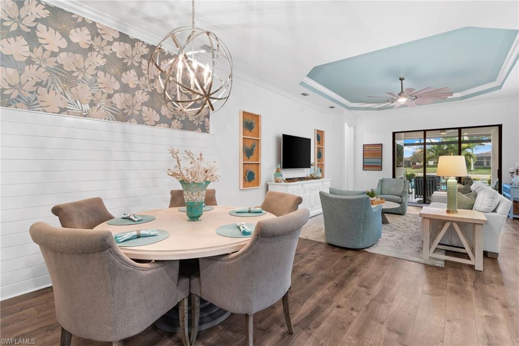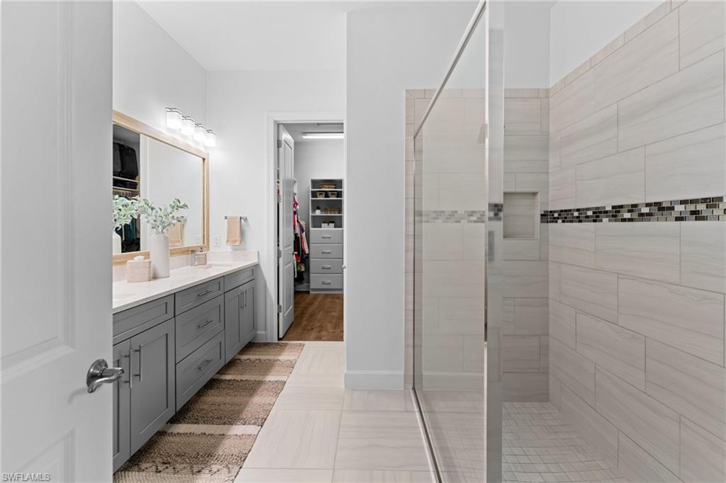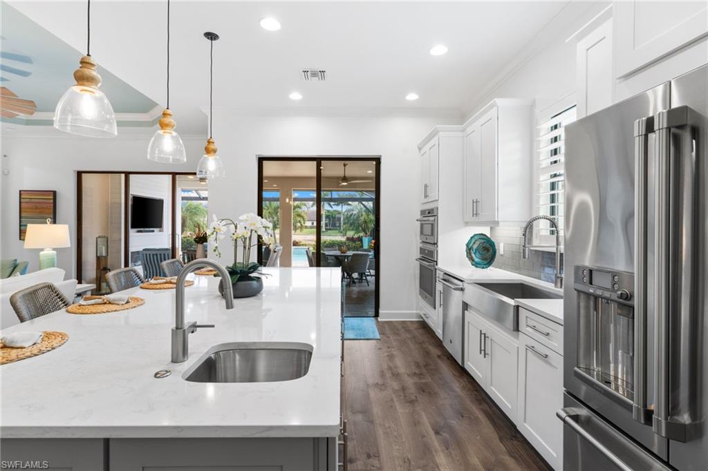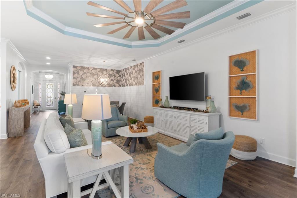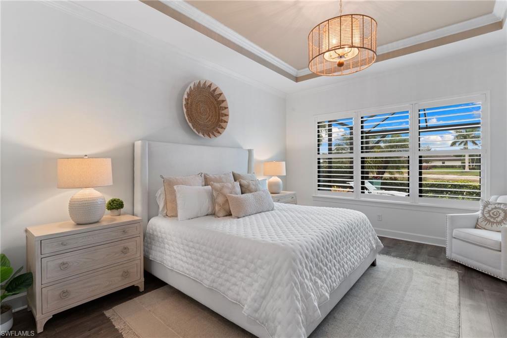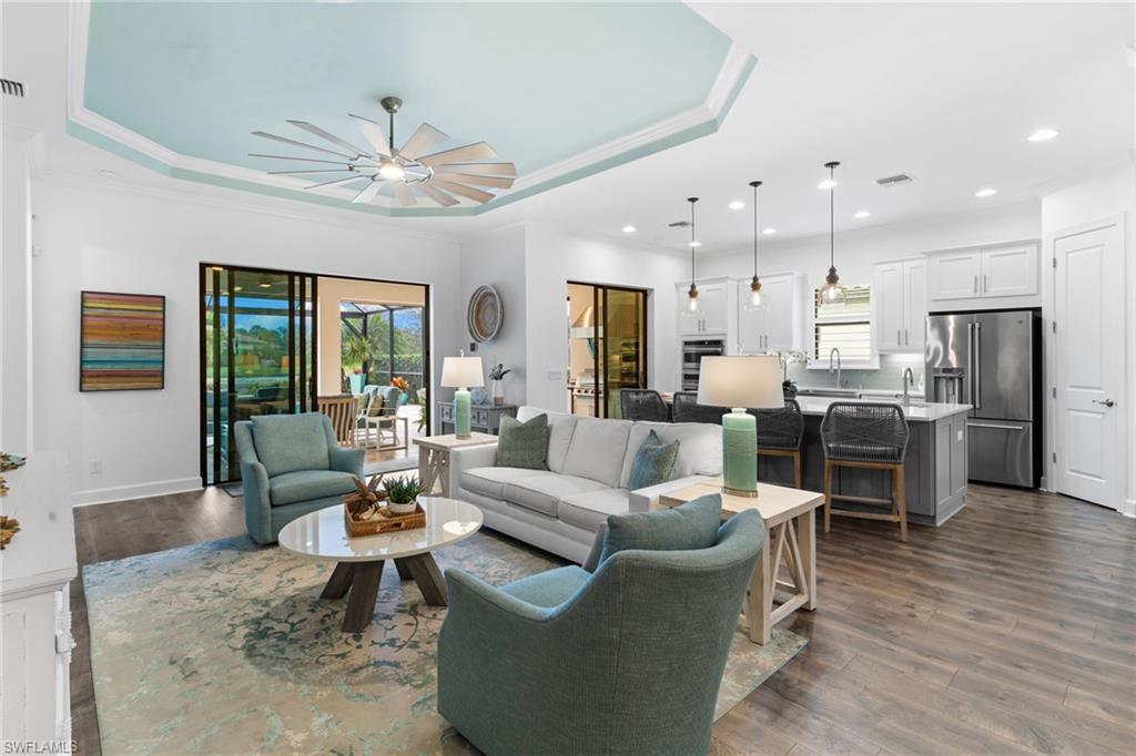 Welcome to 9334 Terresina Drive, your chance to own in the exclusive Esplanade Golf & Country Club of North Naples with a full-golf membership, deeded to your home. Every inch of this Lazio model has been meticulously maintained and upgraded, an exceptional opportunity to live a lifestyle that you have always dreamed of. A perfectly furnished ready-to-live, 3-bedroom, 3-bath residence with just under 2,300 square feet of open-concept living space - complemented by southern exposure, long lake views, and the pristine golf course. Stepping in, you are fully protected from all elements as natural light flows through the hurricane windows and wide open lanai. Unique to only this home the custom designs, accents, and furnishings are all included. The entire home showcases luxury: vinyl plank flooring throughout, crown molding, custom wall details, and elegant tray ceilings that add architectural interest to the main living areas and master suite. The heart of this home is the thoughtfully expansive kitchen, featuring premium shaker-style cabinetry, stunning Cambria quartz countertops, a gas cooktop with double wall oven, and all high-end stainless steel appliances. Each guest rooms includes itu2019s own, beautiful ensuite and the split layout allows for maximum privacy for you and your visitors. The outdoor living space is nothing short of spectacular - updated with beautiful travertine stone, a custom outdoor kitchen, and cozy seating around a built-in fireplace. Embrace the indoor-outdoor lifestyle by lowering the StormSmart electric screens and expanding your living area by opening the sliding doors. All this overlooking your pristine saltwater pool and spa - with all new pool equipment installed over the last three years. Professional landscaping with integrated lighting transforms the backyard into a private oasis, while the extra-wide driveway and epoxy-finished garage floor add both functionality and style. Outfitted with a Generac 24KW whole-house, natural gas generator for peace of mind. Kinetico whole-house water filtration and softening systems, impact windows throughout, plantation shutters grace all windows, a tankless gas hot-water heater, freshly painted inside (2024) and out (2023), ensuring a move-in ready experience that is seamless and worry-free.Best of all, your quarterly fee of just $3,743 covers full golf membership, landscaping maintenance, irrigation, and access to all of Esplanade's world-class amenitiesu2014including the resort pool with Bahama Bar, tennis, pickleball, bocce courts, a 14-mile network of trails, and the impressive 15,000-square-foot clubhouse with restaurant, wine-tasting room, and cafu00e9. With exciting upgrades coming in 2026, including an air-conditioned indoor pickleball complex, this is your chance to secure a meticulously upgraded home in Naples' finest golf community.