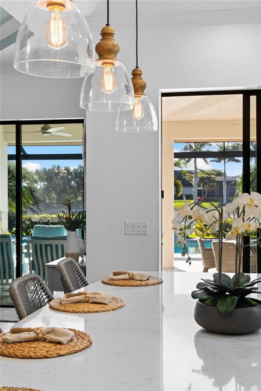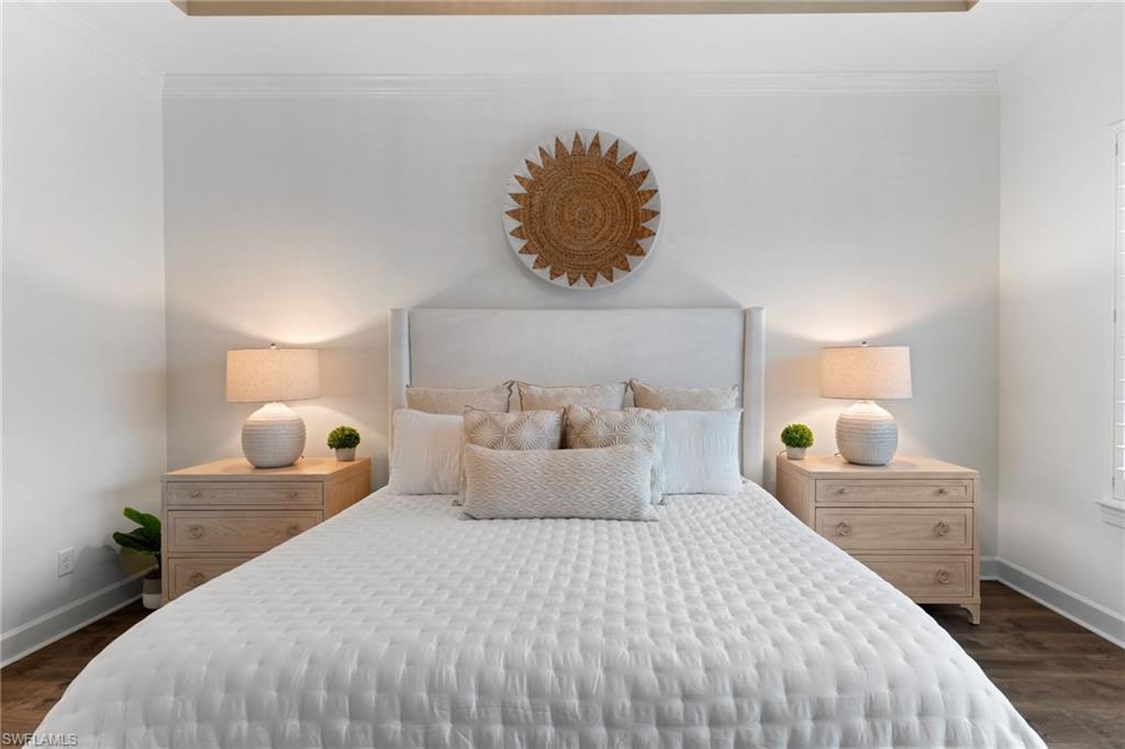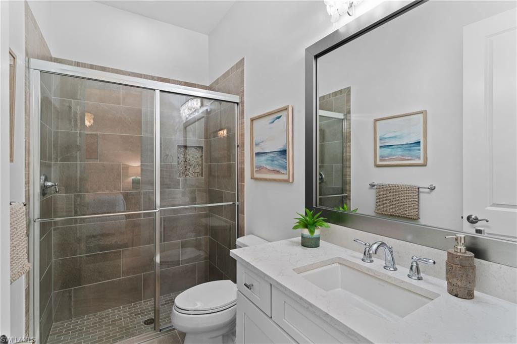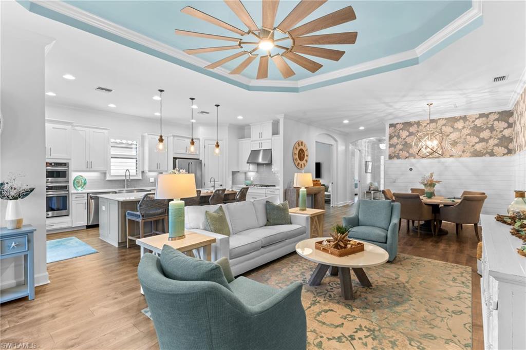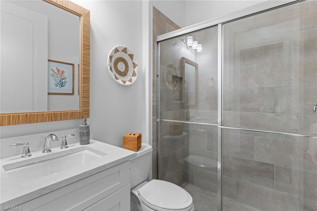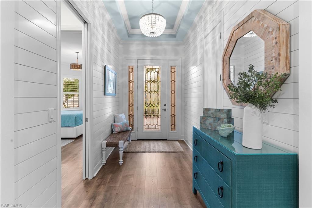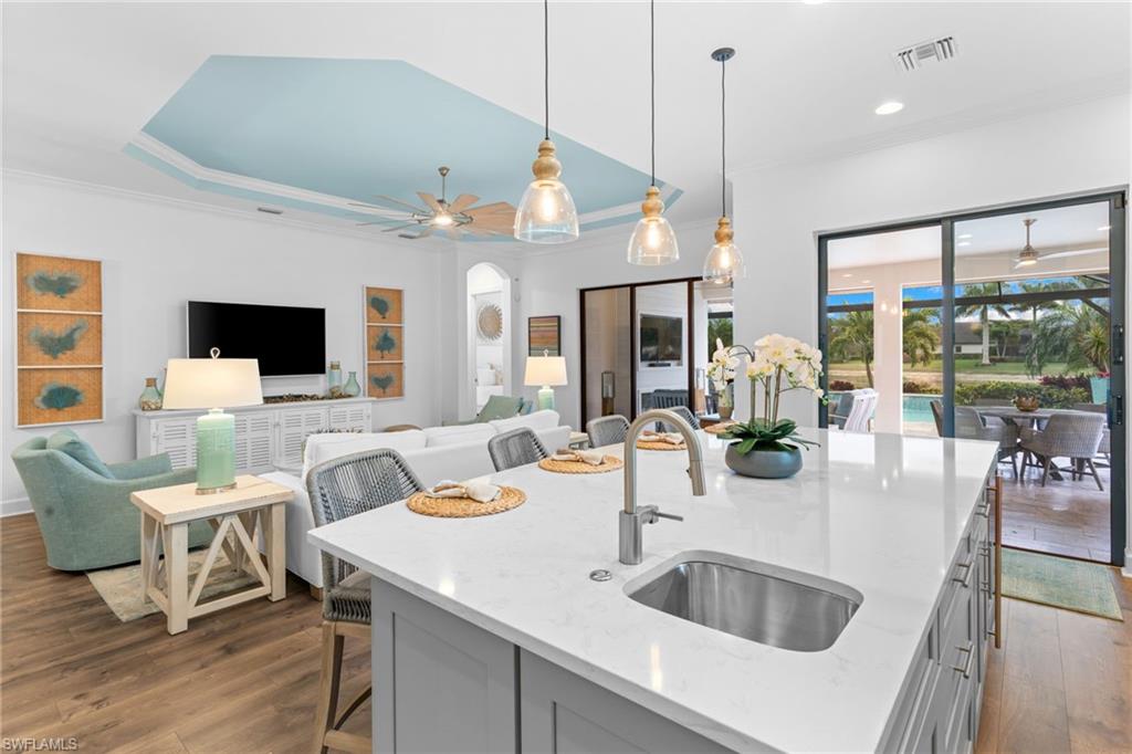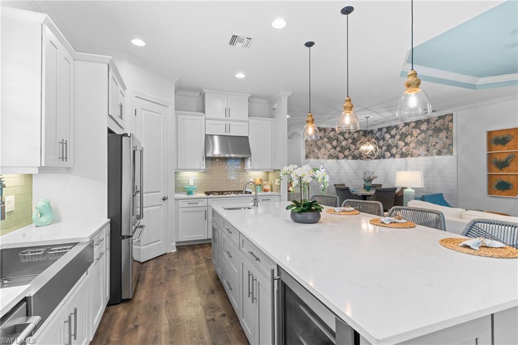Welcome to 9334 Terresina Drive, your chance to own in the exclusive Esplanade Golf & Country Club of North Naples with a full-golf membership, deeded to your home. Every inch of this Lazio model has been meticulously maintained and upgraded, an exceptional opportunity to live a lifestyle that you have always dreamed of. A perfectly furnished ready-to-live, 3-bedroom, 3-bath residence with just under 2,300 square feet of open-concept living space - complemented by southern exposure, long lake views, and the pristine golf course. Stepping in, you are fully protected from all elements as natural light flows through the hurricane windows and wide open lanai. Unique to only this home the custom designs, accents, and furnishings are all included. The entire home showcases luxury: vinyl plank flooring throughout, crown molding, custom wall details, and elegant tray ceilings that add architectural interest to the main living areas and master suite. The heart of this home is the thoughtfully expansive kitchen, featuring premium shaker-style cabinetry, stunning Cambria quartz countertops, a gas cooktop with double wall oven, and all high-end stainless steel appliances. Each guest rooms includes itu2019s own, beautiful ensuite and the split layout allows for maximum privacy for you and your visitors. The outdoor living space is nothing short of spectacular - updated with beautiful travertine stone, a custom outdoor kitchen, and cozy seating around a built-in fireplace. Embrace the indoor-outdoor lifestyle by lowering the StormSmart electric screens and expanding your living area by opening the sliding doors. All this overlooking your pristine saltwater pool and spa - with all new pool equipment installed over the last three years. Professional landscaping with integrated lighting transforms the backyard into a private oasis, while the extra-wide driveway and epoxy-finished garage floor add both functionality and style. Outfitted with a Generac 24KW whole-house, natural gas generator for peace of mind. Kinetico whole-house water filtration and softening systems, impact windows throughout, plantation shutters grace all windows, a tankless gas hot-water heater, freshly painted inside (2024) and out (2023), ensuring a move-in ready experience that is seamless and worry-free.Best of all, your quarterly fee of just $3,743 covers full golf membership, landscaping maintenance, irrigation, and access to all of Esplanade's world-class amenitiesu2014including the resort pool with Bahama Bar, tennis, pickleball, bocce courts, a 14-mile network of trails, and the impressive 15,000-square-foot clubhouse with restaurant, wine-tasting room, and cafu00e9. With exciting upgrades coming in 2026, including an air-conditioned indoor pickleball complex, this is your chance to secure a meticulously upgraded home in Naples' finest golf community.