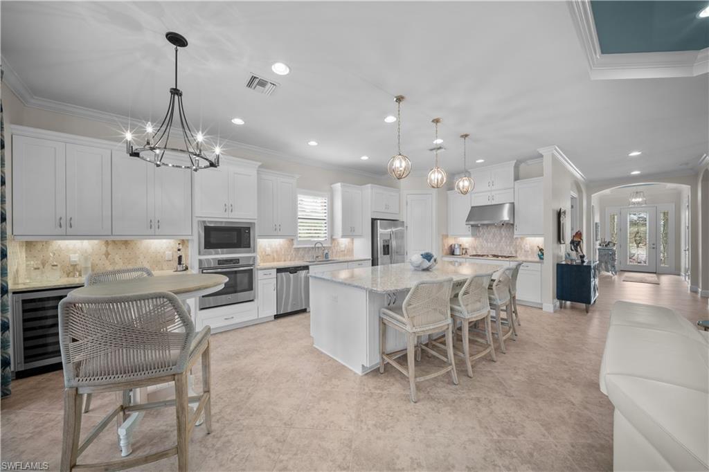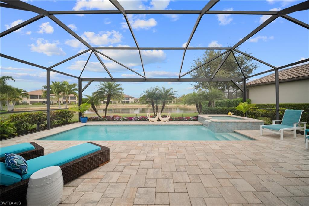 LIVE A VACATION LIFESTYLE IN ESPLANADE! FULL GOLF MEMBERSHIP INCLUDED! This immaculate and well appointed expanded u201cLaziou201d is situated on an oversized lot at the end of a quiet cul-de-sac street and comes partly furnished. Inside, you will find 3 bedrooms, den, 3 full baths, and just over 2300 sq ft of open concept living space. From the moment you walk in the door, you are greeted with diagonal tile floors throughout the common areas and two sets of sliding glass doors to the extended lanai complete with custom outdoor kitchen, GAS heated pool with raised spa, picture window screen, and lush landscaping. The kitchen is the heart of the home and features shaker style cabinetry, Cambria quartz countertops, pantry with custom shelving, and stainless steel appliances including a GAS cooktop & wall oven. Other fine appointments include: luxury laminate wood flooring in the bedrooms & den (no carpet anywhere); expanded kitchen with breakfast nook area and extra cabinetry; plantation shutters on all windows; primary suite walk in closet with custom shelving/drawers; hurricane impact front door with matching sidelights; recently painted interior and exterior; spacious Laundry Room with cabinetry; extensive crown and wall molding details including custom cut mirrors; updated bathroom light fixtures; tankless GAS hot water heater; 8' doors/10' ceilings; extensive professionally enhanced landscaping with professional landscaping lighting; and more! Esplanade Golf & Country Club of North Naples offers a true u201cLifestyle Communityu201d with world-class amenities, including a resort pool with cabanas and the popular u201cBahama Bar,u201d tennis, pickleball, bocce, a 14-mile network of bike/walking trails, and an 18-hole private golf course. The impressive 15,000 Sq Ft clubhouse features a restaurant, bar, wine-tasting room, wine lockers, and a Starbucks-style cafu00e9. Best of all, the propertyu2019s landscaping, irrigation, golf membership, and all community amenities are covered under a quarterly fee of just $3,743u2014no additional fees or memberships required! Don't miss your opportunity to own this exceptional home in one of Naplesu2019 most sought-after communities. Schedule your tour of this stunning home and Esplanade Golf & Country Club today! COMING SOON TO ESPLANADE (2026): Fully renovated and expanded poolside Bahama Bar; expanded outdoor bar at the Barrel House; expanded golf practice range; and an AIR CONDITIONED INDOOR PICKLEBALL COMPLEX with four indoor courts.