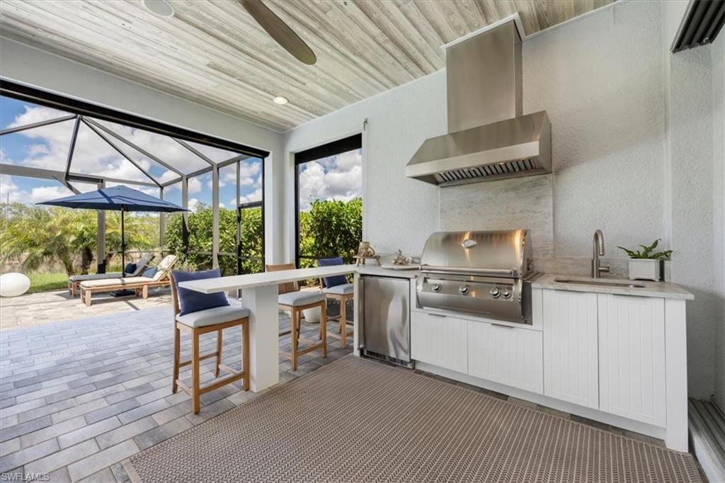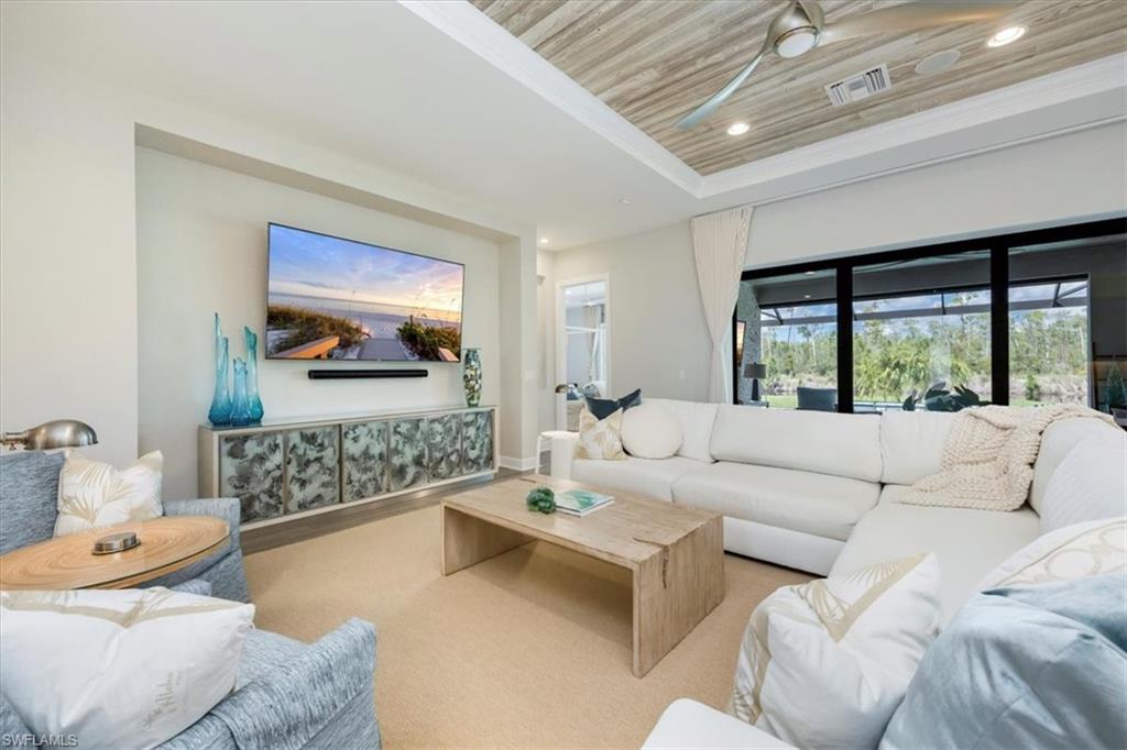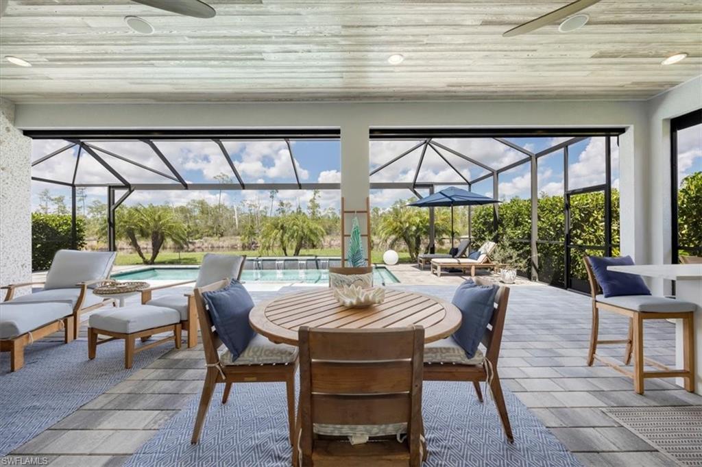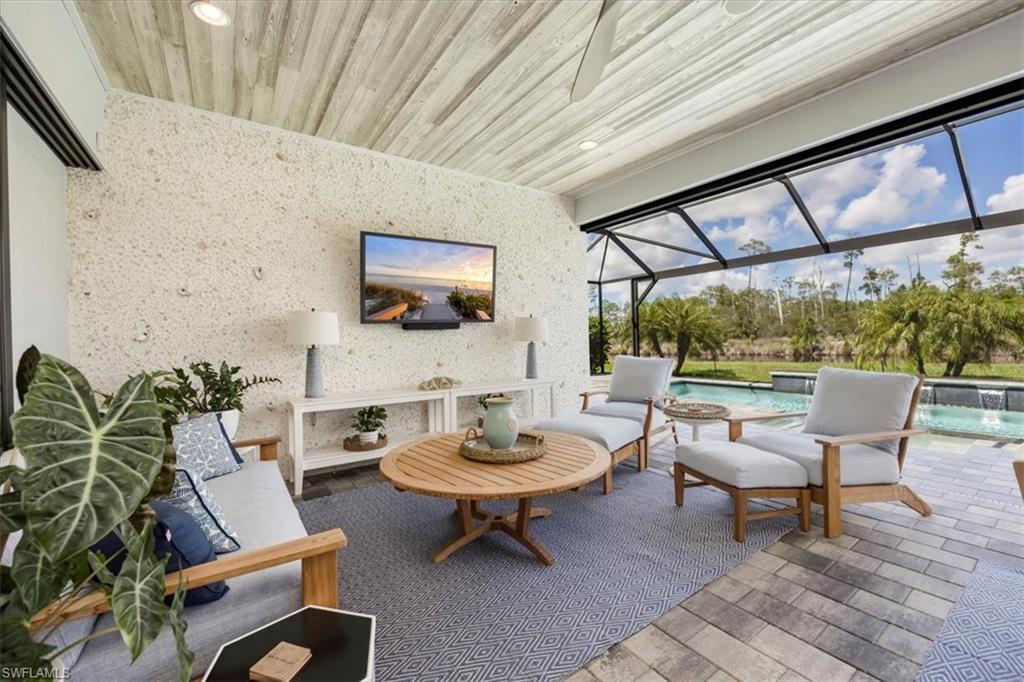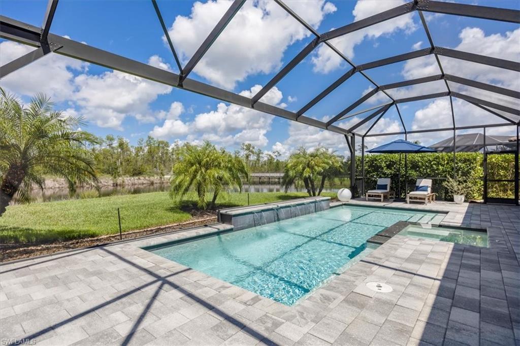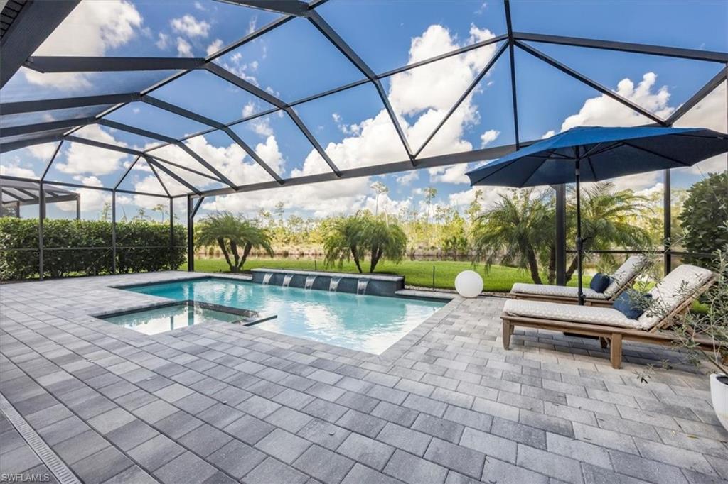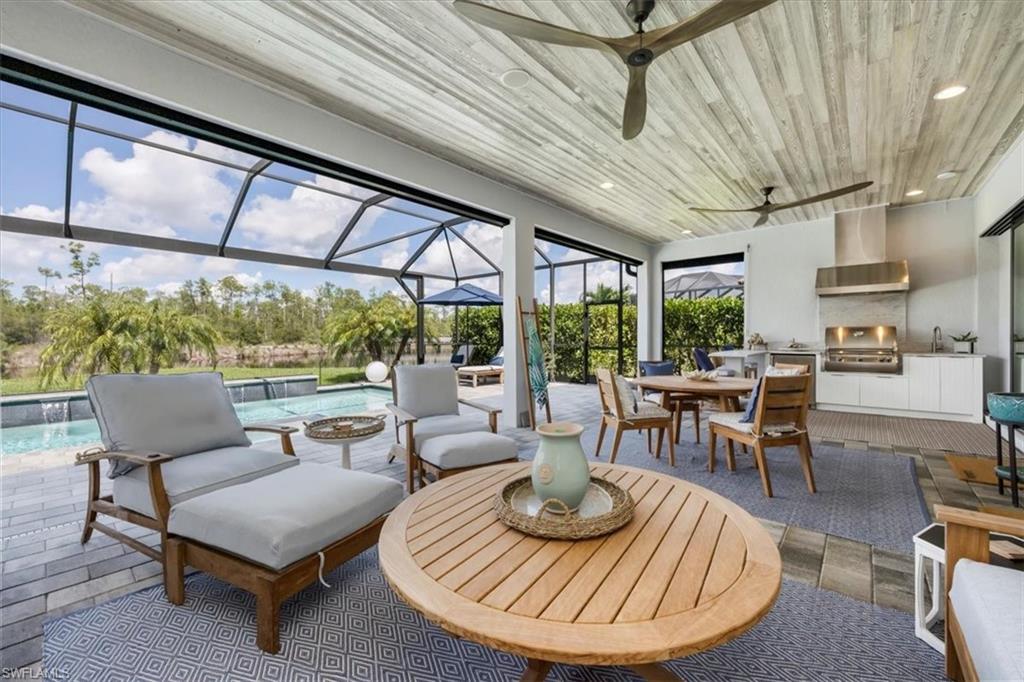 This stunning Pallazzio floor plan offers over 3,000 square feet of elegant living space, complete with three bedrooms, a den, and three full baths. Designed for both comfort and sophistication, the home includes an immediate full golf membership, making it an ideal choice for those seeking a vibrant lifestyle with world-class amenities at their fingertips. Thoughtful upgrades are found throughout the residence, starting with hurricane-rated windows, sliders, and doors, a new hurricane impact front door with matching side panels, and Storm Smart motorized shutters for peace of mind. A whole-house gas generator, tankless hot water heater, and a full water filtration and reverse osmosis system ensure modern convenience and efficiency. Inside, 10-foot ceilings, 8-foot doors, and Synergy cypress wood accents in the entryway, lanai, foyer, great room, primary suite, powder room, and laundry add warmth and architectural character. The extended gourmet kitchen is a true centerpiece, featuring GE Monogram appliances, a natural gas cooktop with wall oven, wine and beverage coolers, glass display cabinetry, and under-cabinet lighting. A SONOS sound system with in-ceiling speakers, custom designer lighting, and professionally designed draperies and blinds elevate the homeu2019s interior design. The spacious primary suite offers a walk-in closet with custom shelving, a luxurious bath with double sinks, makeup area, and a frameless glass shower, while guest suites feature their own stylishly appointed bathrooms. Step outside to a private retreat on the oversized lanai, enhanced by a feature shell wall, bar seating, and a fully equipped outdoor kitchen. The gas-heated saltwater pool and spa with waterfall features are surrounded by picture window screens, mature native landscaping, and front and rear landscape lighting, creating a serene backdrop of preserve views and glowing sunsets. Additional highlights include an extended two-car garage with epoxy flooring, built-in storage, insulation, air conditioning, and a refrigerator, as well as ceiling fans in every bedroom, the den, great room, and lanai. High-end furniture is negotiable, allowing for a seamless move-in experience. Every detail of this property has been carefully curated for luxury, comfort, and peace of mindu2014ideal for both entertaining and quiet enjoyment.