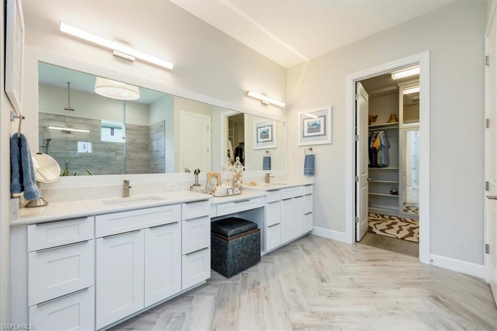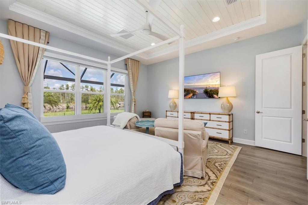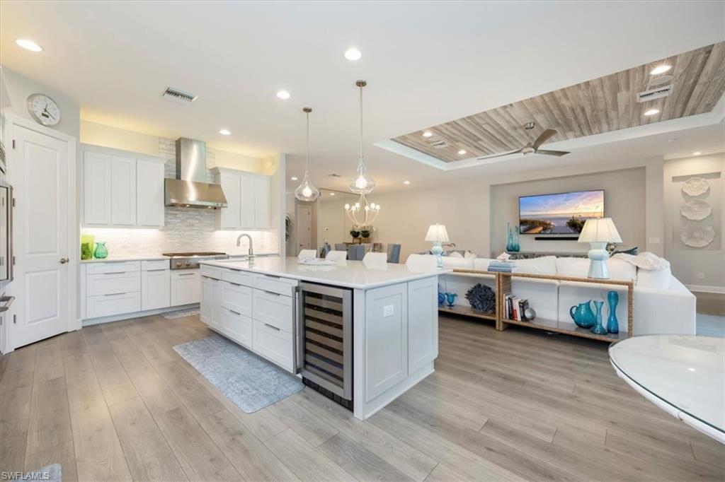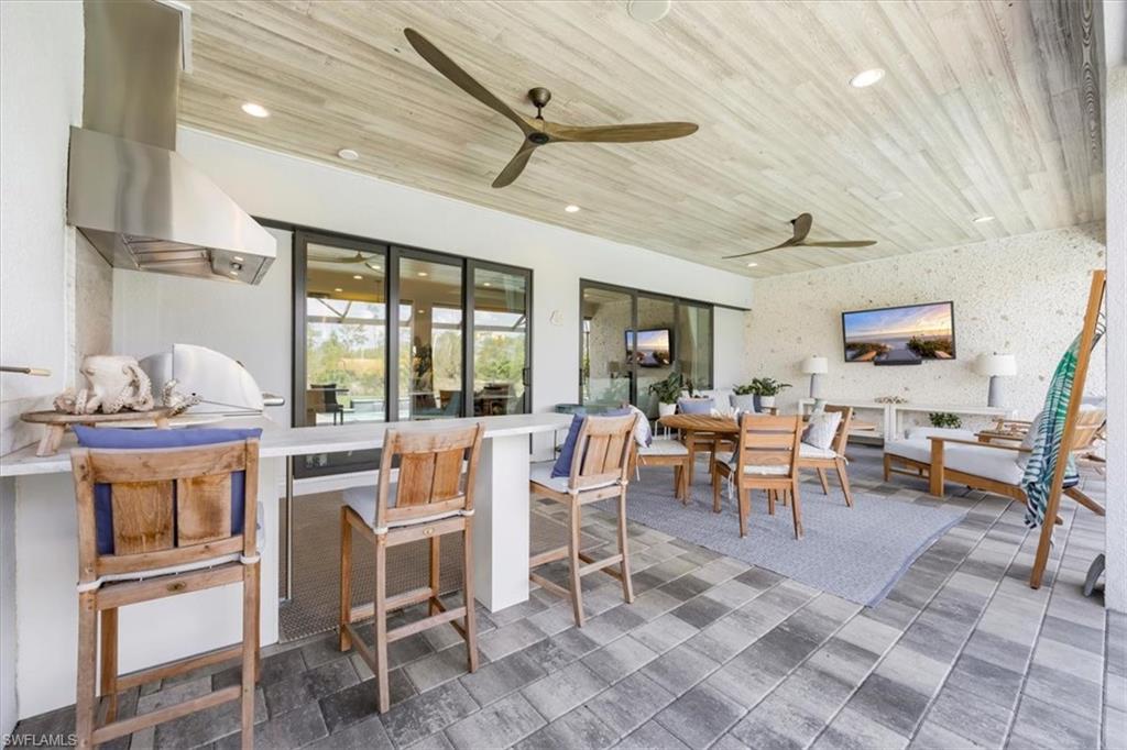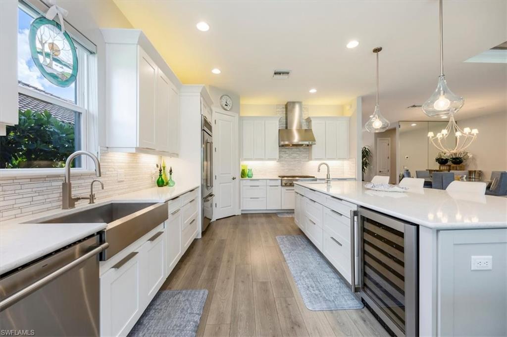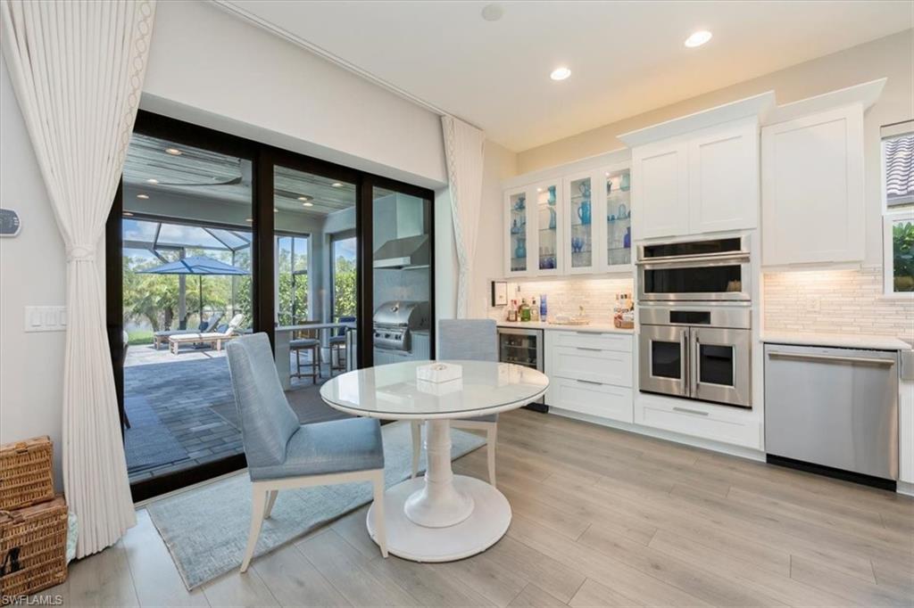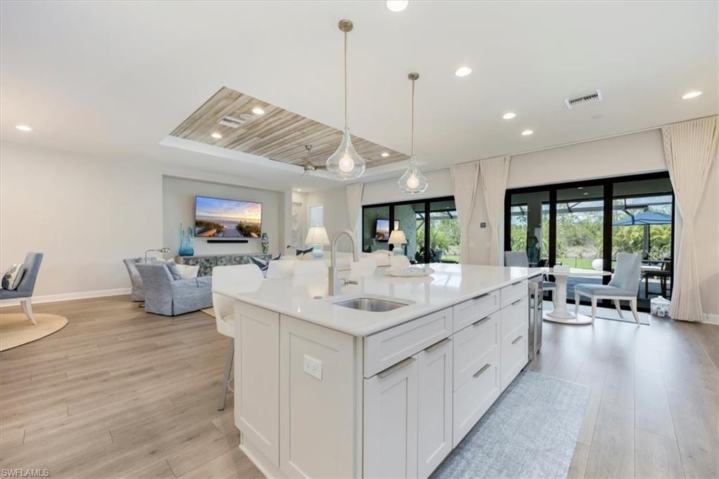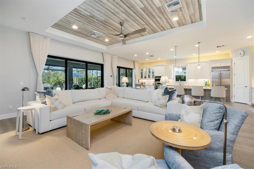 This stunning Pallazzio floor plan offers over 3,000 square feet of elegant living space, complete with three bedrooms, a den, and three full baths. Designed for both comfort and sophistication, the home includes an immediate full golf membership, making it an ideal choice for those seeking a vibrant lifestyle with world-class amenities at their fingertips. Thoughtful upgrades are found throughout the residence, starting with hurricane-rated windows, sliders, and doors, a new hurricane impact front door with matching side panels, and Storm Smart motorized shutters for peace of mind. A whole-house gas generator, tankless hot water heater, and a full water filtration and reverse osmosis system ensure modern convenience and efficiency. Inside, 10-foot ceilings, 8-foot doors, and Synergy cypress wood accents in the entryway, lanai, foyer, great room, primary suite, powder room, and laundry add warmth and architectural character. The extended gourmet kitchen is a true centerpiece, featuring GE Monogram appliances, a natural gas cooktop with wall oven, wine and beverage coolers, glass display cabinetry, and under-cabinet lighting. A SONOS sound system with in-ceiling speakers, custom designer lighting, and professionally designed draperies and blinds elevate the homeu2019s interior design. The spacious primary suite offers a walk-in closet with custom shelving, a luxurious bath with double sinks, makeup area, and a frameless glass shower, while guest suites feature their own stylishly appointed bathrooms. Step outside to a private retreat on the oversized lanai, enhanced by a feature shell wall, bar seating, and a fully equipped outdoor kitchen. The gas-heated saltwater pool and spa with waterfall features are surrounded by picture window screens, mature native landscaping, and front and rear landscape lighting, creating a serene backdrop of preserve views and glowing sunsets. Additional highlights include an extended two-car garage with epoxy flooring, built-in storage, insulation, air conditioning, and a refrigerator, as well as ceiling fans in every bedroom, the den, great room, and lanai. High-end furniture is negotiable, allowing for a seamless move-in experience. Every detail of this property has been carefully curated for luxury, comfort, and peace of mindu2014ideal for both entertaining and quiet enjoyment.
