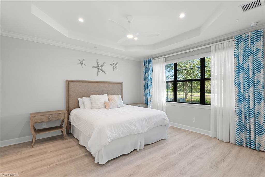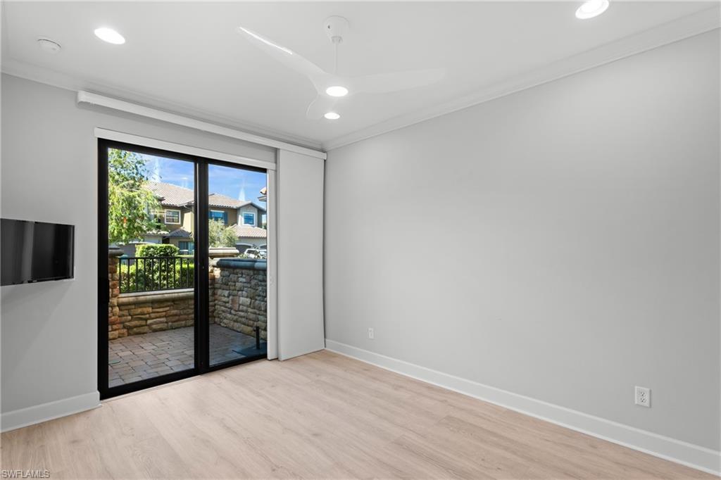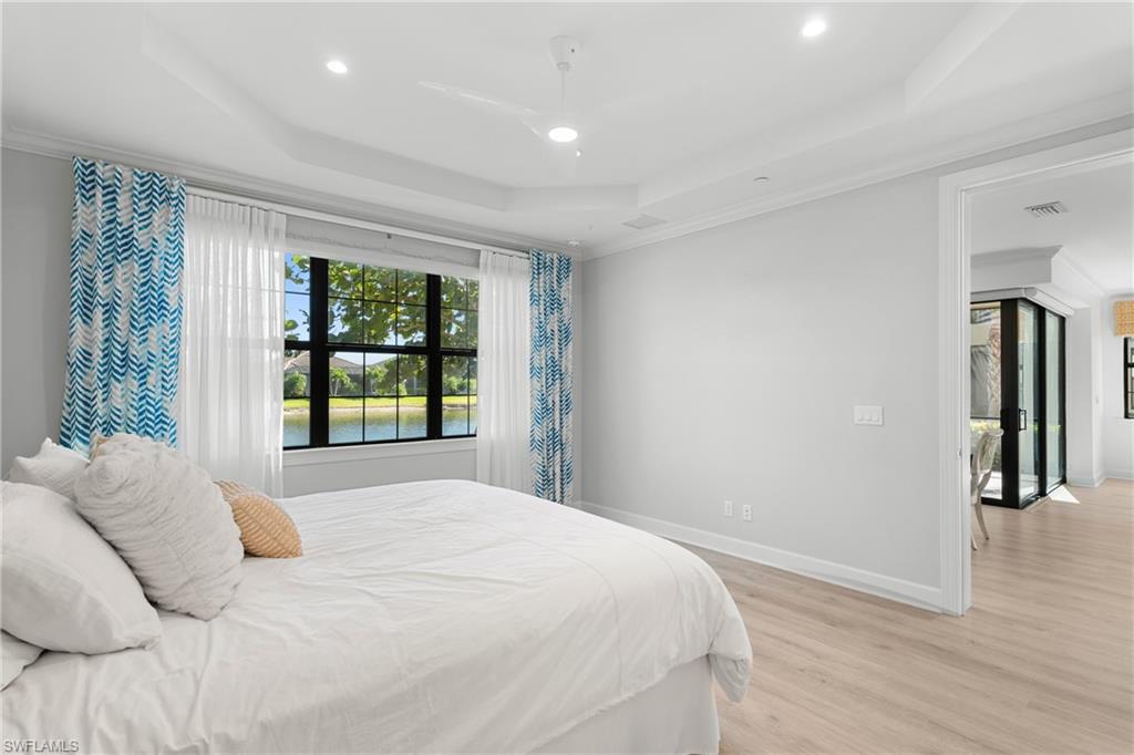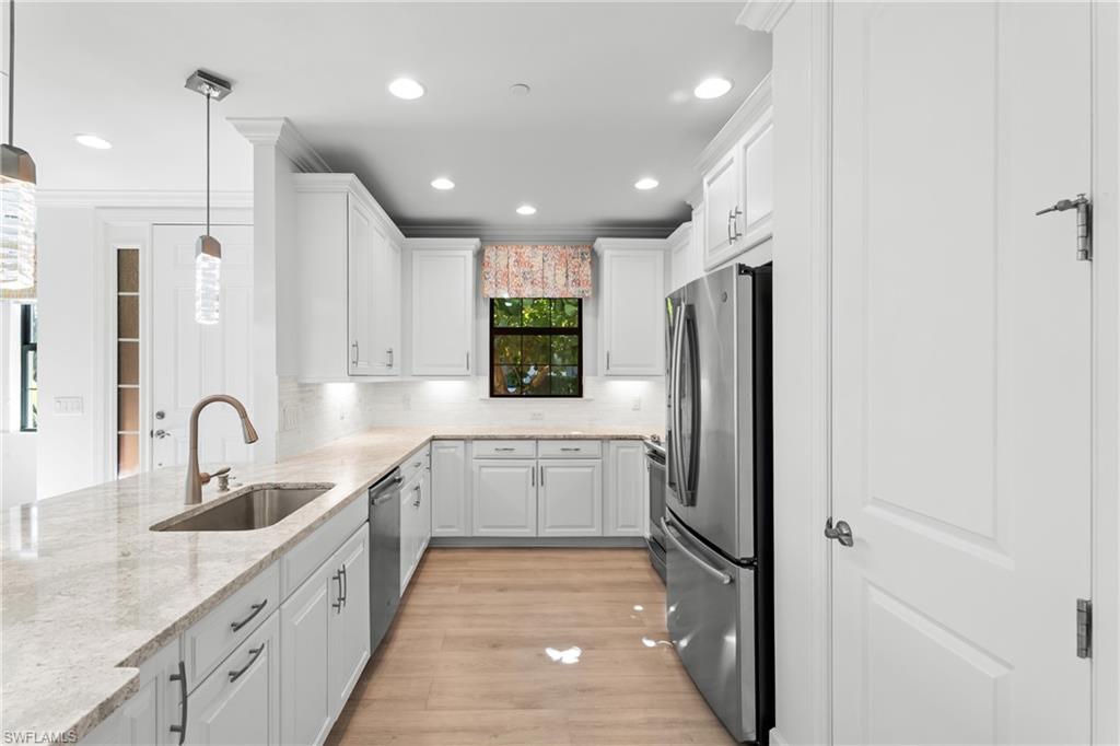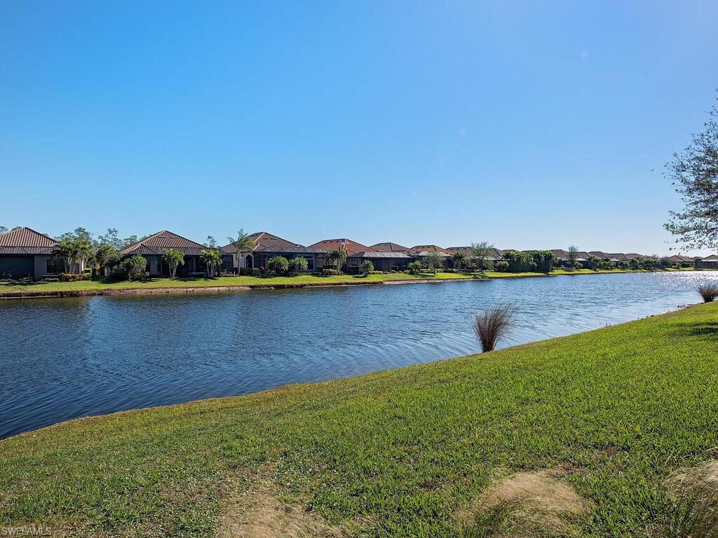 Beautiful 2 Bedroom Plus Den/Office Coach Home in Esplanade Golf & Country Club!This exceptional first-floor coach home offers an inviting open layout with 1,994 square feet of beautifully designed living space, ideal for everyday comfort and effortless entertaining. The highly sought-after, meticulously maintained end unit is being sold partially furnished and is nestled within a pristine golf, tennis, and pickleball community. Esplanade is also planning to add four new indoor pickleball courts within the next one to two years, further enhancing the communityu2019s impressive array of amenities.Begin your mornings on the private screened lanai, coffee in hand, as you take in serene water views and stunning sunrises. The thoughtful floor plan flows effortlessly from room to room and lives even larger than its square footage suggests. Peaceful lake views can be enjoyed from the living room, dining area, and primary suite, while the lanai offers a tranquil retreat overlooking the water. The home features upgraded Mohawk Wood Plus laminate flooring throughout the main living areas and bedrooms, complemented by 24-inch ceramic tile in all bathrooms and the laundry room. Additional upgrades include crown molding, hurricane-impact windows and doors, quartz countertops, stainless steel GE appliances, white cabinetry, a wine fridge, fireplace, pantry, APCO UV light system in the HVAC, Everpure EF6000 kitchen water filtration system, and upgraded lighting throughout, including elegant shelf lighting flanking the feature wall in the main living area.The spacious primary suite includes dual sinks, a walk-in shower, and a large walk-in closet. The guest bedroom offers its own private bathroom with a dual-showerhead system and direct access to a charming outdoor courtyard perfect for enjoying sunsets. Both bedrooms are equipped with quality shade systems for comfort and privacy. The den/office is partially enclosed and can easily be converted into a third bedroom by adding double doors or reinstalling a previously used barn door. A sports/social membership is included with the home and provides limited golf opportunities throughout the year.