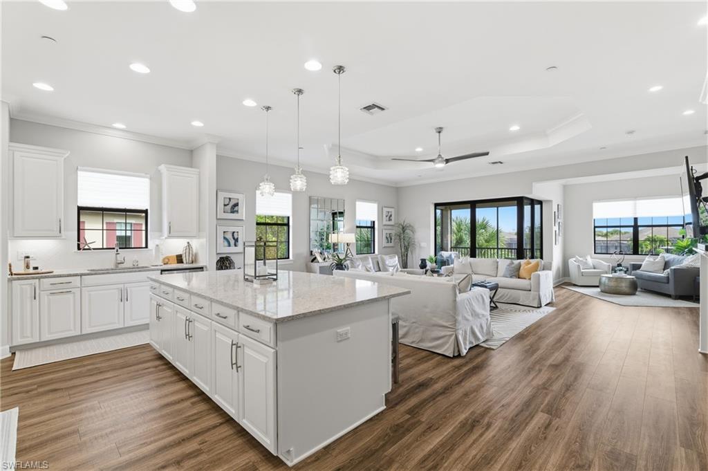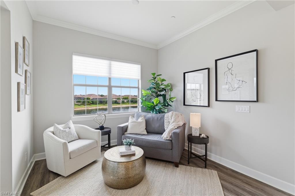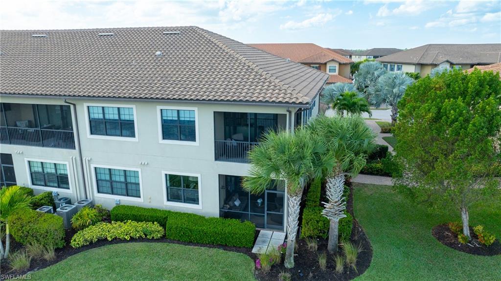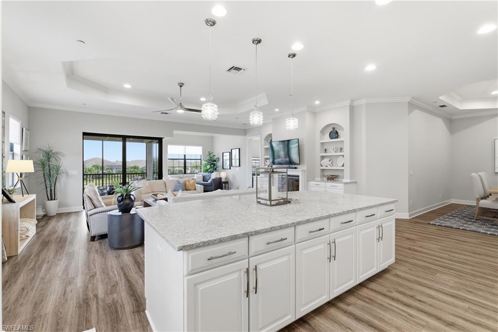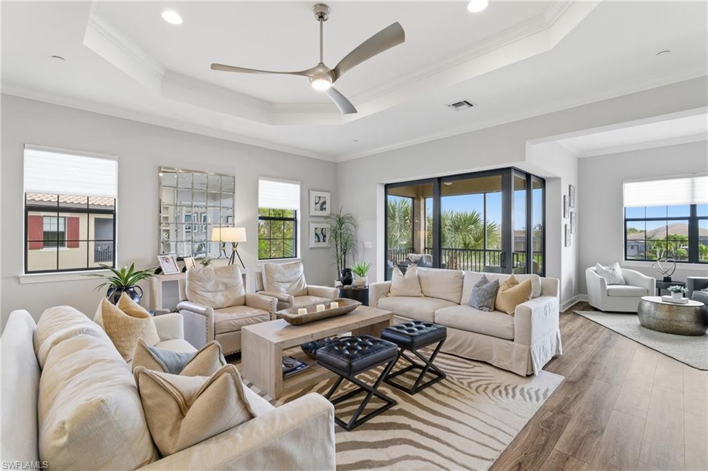 FULL GOLF MEMBERSHIP is included with this meticulous and beautifully appointed Romano second-floor coach home located on an exceptional street in Esplanade Golf & Country Club. This desirable end-unit offers 2,393 square feet of elegant living space offering three bedrooms, three bathrooms, and a spacious den that can serve as an office or formal dining area. Many upgrades in this the home that features a neutral color palette which seamlessly blends elegance, comfort, and scenic charm, highlighted by peaceful sunrise views from the inviting lanai.Inside, the open-concept great room is bright and inviting, with additional windows that allow significantly more natural light than interior units. Beautiful wood-style flooring runs throughout the space, complemented by built-in cabinetry and modern shelving that create a warm yet sophisticated ambiance. Crown molding and tray ceilings add refined architectural detail, while a lovely feature wall with custom built-in bookshelves and fireplace enhances both style and atmosphere. At the heart of the home, the kitchen is as functional as it is beautiful, showcasing a large quartz-topped center island, stainless steel appliances, and abundant white cabinetry, making it ideal for everyday living and entertaining. The spacious primary suite offers serene views, wood-style flooring, generous closet space, and a well-appointed modern bathroom. Both guest bedrooms are nicely sized and feature their own private bathrooms, providing comfort and privacy for family and visitors alike.High-impact hurricane windows and doors offer added safety and peace of mind, while elegant lighting fixtures, premium finishes, and meticulous attention to detail throughout further elevate this exceptional residence. Esplanade Golf & Country Club continues to enhance its already outstanding lifestyle offerings, as the membership has recently approved a Capital Improvement Project that will introduce four new indoor pickleball courts, renovations to the Bahama Bar, an expanded golf driving range, and an enlarged outdoor bar and kitchen at the clubhouse restaurant. The Capital Improvement Project assessment is $450 per quarter over 5 years and will be assumed by the buyer after closing.Entering Esplanade, you will notice why Esplanade Golf & CC was awarded this year's Outstanding Landscaping Award for the front entrance by the National Association of Landscape Professionals. As a resident of Esplanade, you'll enjoy an unmatched lifestyle with access to world-class amenities, including a championship golf course, state-of-the-art clubhouse, resort-style pool with food and beverage service, private cabanas, tennis and pickleball courts, walking/biking trails, a dog park, fitness center, full-service salon and spa, wellness center, tiki bar, and more. Ideally located in North Naples, Esplanade is close to the airport & wonderful shopping & restaurants. Don't miss this opportunity to live in one of the best communities in Naples!