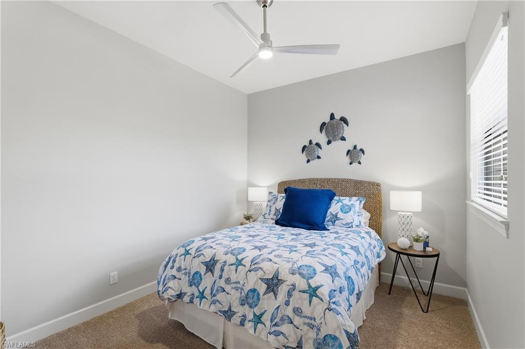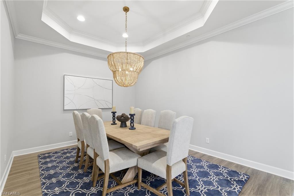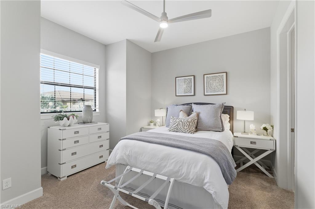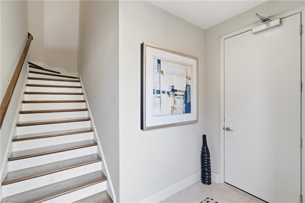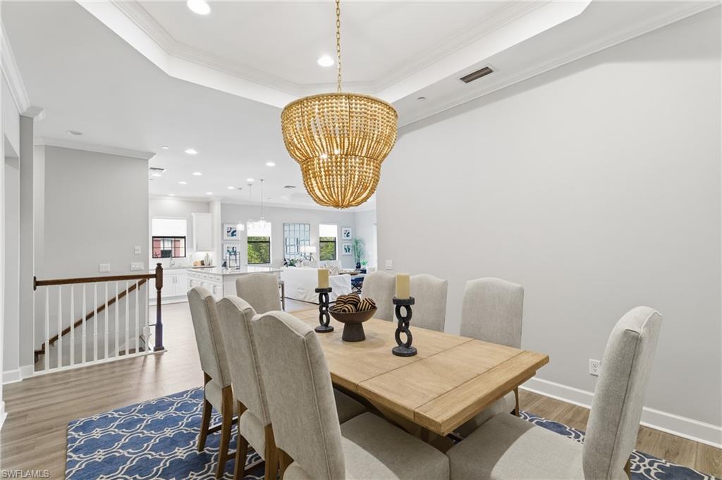 FULL GOLF MEMBERSHIP is included with this meticulous and beautifully appointed Romano second-floor coach home located on an exceptional street in Esplanade Golf & Country Club. This desirable end-unit offers 2,393 square feet of elegant living space offering three bedrooms, three bathrooms, and a spacious den that can serve as an office or formal dining area. Many upgrades in this the home that features a neutral color palette which seamlessly blends elegance, comfort, and scenic charm, highlighted by peaceful sunrise views from the inviting lanai.Inside, the open-concept great room is bright and inviting, with additional windows that allow significantly more natural light than interior units. Beautiful wood-style flooring runs throughout the space, complemented by built-in cabinetry and modern shelving that create a warm yet sophisticated ambiance. Crown molding and tray ceilings add refined architectural detail, while a lovely feature wall with custom built-in bookshelves and fireplace enhances both style and atmosphere. At the heart of the home, the kitchen is as functional as it is beautiful, showcasing a large quartz-topped center island, stainless steel appliances, and abundant white cabinetry, making it ideal for everyday living and entertaining. The spacious primary suite offers serene views, wood-style flooring, generous closet space, and a well-appointed modern bathroom. Both guest bedrooms are nicely sized and feature their own private bathrooms, providing comfort and privacy for family and visitors alike.High-impact hurricane windows and doors offer added safety and peace of mind, while elegant lighting fixtures, premium finishes, and meticulous attention to detail throughout further elevate this exceptional residence. Esplanade Golf & Country Club continues to enhance its already outstanding lifestyle offerings, as the membership has recently approved a Capital Improvement Project that will introduce four new indoor pickleball courts, renovations to the Bahama Bar, an expanded golf driving range, and an enlarged outdoor bar and kitchen at the clubhouse restaurant. The Capital Improvement Project assessment is $450 per quarter over 5 years and will be assumed by the buyer after closing.Entering Esplanade, you will notice why Esplanade Golf & CC was awarded this year's Outstanding Landscaping Award for the front entrance by the National Association of Landscape Professionals. As a resident of Esplanade, you'll enjoy an unmatched lifestyle with access to world-class amenities, including a championship golf course, state-of-the-art clubhouse, resort-style pool with food and beverage service, private cabanas, tennis and pickleball courts, walking/biking trails, a dog park, fitness center, full-service salon and spa, wellness center, tiki bar, and more. Ideally located in North Naples, Esplanade is close to the airport & wonderful shopping & restaurants. Don't miss this opportunity to live in one of the best communities in Naples!