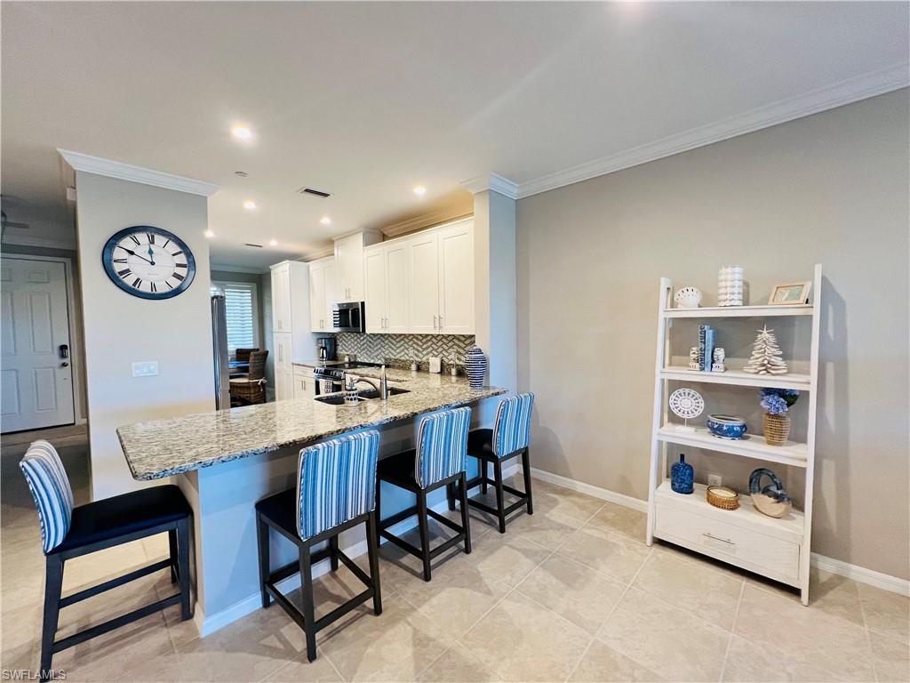 BOOK YOUR VACATION RENTAL AT THE ESPLANADE! Enjoy beautiful sunsets from this first floor 2 bedroom/2 bath condo with 1 car garage overlooking a lake and the 16th fairway. Condo offers many upgrades with include granite countertops , shaker style cabinets, tile floors throughout with laminate flooring in bedrooms, crown molding throughout, extra built-in cabinets located in the kitchen, bath and laundry room making for extra storage. Spacious laundry room, upgraded kitchen backsplash, plantation shutters, upgraded lights and fans. This homes comes with a CLUB/SPORTS MEMBERSHIP which gives you access to all amenities including golf. Amenities in the community include a Sports Court, Resort-style Pool with cabanas, 6 tennis courts, Koquina Sand Spa and Salon, 4 bocce ball courts, 4 pickle ball courts, gym and aerobics room, poolside Bahama bar, 14 miles of bike/walking trails, restaurant, bars and wine tasting room. Greens fees apply. ***Information contained herein deemed reliable***
