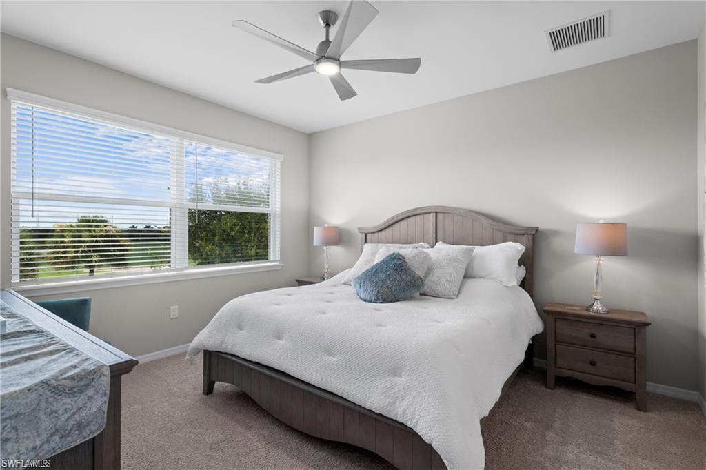 This exceptionally well-kept two bedroom plus den, two full bathroom second floor end unit garden home is NOW AVAILABLE for short or long term rental. Located in one of Naples' most highly sought after resort style communities, Esplanade Golf and Country Club, this like new condo is tucked away on a private cul-de-sac and boasts panoramic golf course and lake views, fabulous sunrises from the Southeast facing lanai, a detached one car garage with Epoxy floors, 14 foot vaulted ceilings and a new home feel you won't want to leave! Uniquely featuring an extra window in the den, this condo gives the feel of single family living, offering ample space, a split floor plan ideal for family or guests, large Primary Bedroom with King bed, two walk-in closets and large Primary Bath featuring dual sinks and finished shower. Guest bedroom features a Queen bed, closet and full size hall bathroom. Pocket doors to close off for privacy if needed. Large open concept living area with eat in kitchen finished with granite countertops and island bar for morning coffee, a quick meal or entertaining. Large open den with pull out couch allows for additional room for family and guests. Laundry room with washer/dryer and ample storage space. There is not a detail spared in this spectacular home! Esplanade Golf & Country Club is an amenity-rich community with a modern clubhouse offering a resort style pool with private cabanas and Bahama Bar for dining and drinks by the pool, state of the art fitness/wellness center, golf course *with limited availability to tenants, pickleball, tennis, bocce, 4+ miles of nature walking trails, dog park, cafe, wine room, Culinary Center, full service restaurant and full service salon/spa. Just outside the gates you are just a short drive to shopping, dining and Southwest Florida's world class beaches. Do not miss this opportunity to partake in the laid back living that the Esplanade lifestyle has to offer - book your stay today!