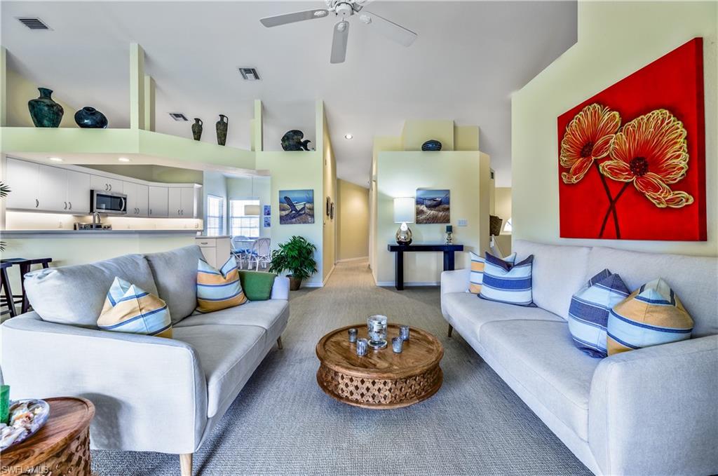 Exceptional golf course views over the 3rd fairway of Imperial's West course from the second-floor offering the largest floor plan in Bermuda Greens featuring three bedrooms and two baths, along with an attached garage! Vaulted ceilings and an open-concept design create a bright, airy interior filled with natural light. The updated eat-in kitchen features a convenient breakfast bar and flows seamlessly into the main living area, making it ideal for everyday living and entertaining. The spacious living area opens to an oversized balcony with beautiful golf course views. The third bedroom provides flexible space, well suited for a home office or den. Located within the gated Imperial Golf Estates, Bermuda Greens is a well-established condominium community set on approximately 27 acres of lush, beautifully landscaped grounds and surrounded by one of the communityu2019s two private 18-hole golf courses. No mandatory memberships! Designed to support an active and social lifestyle, residents enjoy amenities including a pool, spa, bocce court, and a community clubhouse available for gatherings and functions, along with scheduled community events. Ideally situated in a highly desirable North Naples location, this property offers convenient access to the Gulf of Mexicou2019s renowned beaches, premier shopping and dining at Mercato and Waterside Shops, and Southwest Florida International Airport, approximately 30 minutes awayu2014making it well suited for seasonal or year-round living.**