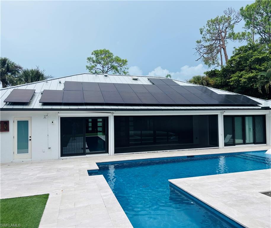 This beautifully redesigned home is nestled on an oversized lot in the highly sought-after Imperial Golf Estates, offering approximately 2600 sq. ft. of living space with 3 bedrooms and 2u00bd bathrooms. Originally built in 1988, the residence has been fully renovated between 2022u20132025 with premium upgrades for modern living and peace of mind. From the moment you step inside, soaring vaulted ceilings and a wall of French doors fill the interior with natural light, creating a bright and airy ambiance. Neutral tones and clean architectural lines provide a timeless backdrop that complements any style of du00e9cor. The well-appointed kitchen boasts custom cabinetry, double oven, propane cooktop, serving counter, and solid-surface countertops, seamlessly connecting to a casual dining area. A convenient powder bath serves guests with ease.The master suite is a true retreat, featuring dual walk-in closets, a tray ceiling, and a beautifully updated en-suite bath. One guest suite is oversized and offers a private en-suite bath with direct pool accessu2014perfect for family or visitors seeking privacy.Outdoor living is at its finest with a brand-new oversized pool (lap and regular) with a sun deck, expansive paver lanai, covered patio for shaded entertaining, and lush tropical landscaping that enhances privacy. The spacious lot provides room for children and pets to play, complemented by a recently installed fence and maintenance free artificial turf. Additional highlights include an elegant circular drive, putting green, side-load garage with utility/storage space, and a lanai storage closet.This home is equipped with exceptional upgrades: all new hurricane-rated windows and doors, roll-down shutters for the front and rear, roll-down lanai screen, standing seam metal roof, solar system, new insulation, new A/C with ductwork, dual tankless water heaters (one propane, one electric), new Pex plumbing and fixtures, upgraded cabinetry and lighting, and a 24kW Generac standby generator with a 750-gallon buried propane tank powering the entire home, including the pool. Modern security is in place with a Ring camera system, ensuring peace of mind. Truly move-in ready, this home blends timeless design with todayu2019s most sought-after featuresu2014an exceptional opportunity in one of Naplesu2019 most desirable communities.Images feature digital staging for visualization purposes only; property is unfurnished.