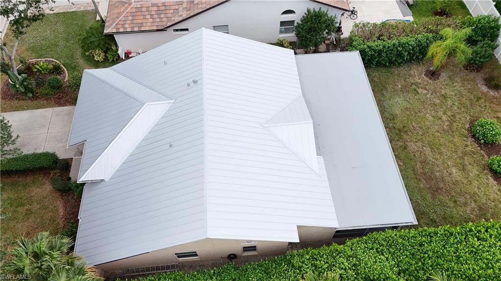 Welcome to this beautifully maintained 3-bedroom, 2-bathroom home located in the highly sought-after Longshore Lakes community in Naples, Florida. This property is not located in a flood zone, offering extra peace of mind. This spacious residence offers an ideal blend of comfort, style, and functionality u2013 perfect for year-round living or a seasonal retreat. Step inside to find a bright and open floor plan with vaulted ceilings (ceiling fans throughout the home), split bedrooms, and plenty of natural light. The home features a new metal roof (2025) for added peace of mind and long-term durability. The expansive lanai is truly a standout feature, offering a serene outdoor living space perfect for relaxing, entertaining, or enjoying the Florida lifestyle year-round. The kitchen includes ample cabinet space, including a pantry for additional storage, and opens to both a cozy dining area showcasing French doors out to the lanai, and the main living space, making it ideal for hosting. The primary suite boasts 2 walk-in closets and an en-suite bathroom with a walk-in shower. Two additional bedrooms, each with a walk-in closet, provide plenty of space for guests, a home office, or hobbies. Additional highlights include a 2-car garage with attic, laundry room w/utility sink, and beautifully landscaped yard. Residents of Longshore Lakes enjoy low HOA fees and resort-style amenities, including a clubhouse/restaurant, community saltwater pool, tennis courts, fitness center, playground, and scenic lakes for kayaking or fishing. Centrally located in North Naples, you're just minutes from white-sand beaches, shopping, dining, and top-rated schools, with the option to attend the STEM school. Don't miss this opportunity to own a move-in-ready home in one of Naples' most desirable gated communities! Please note some pictures are virtually modified, please see photo captions for details.