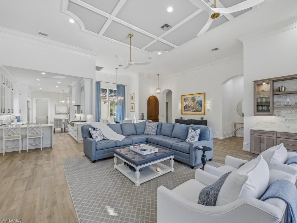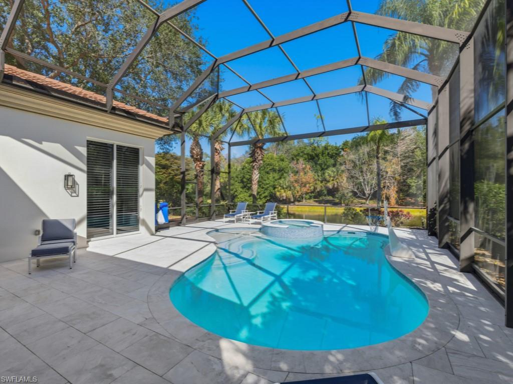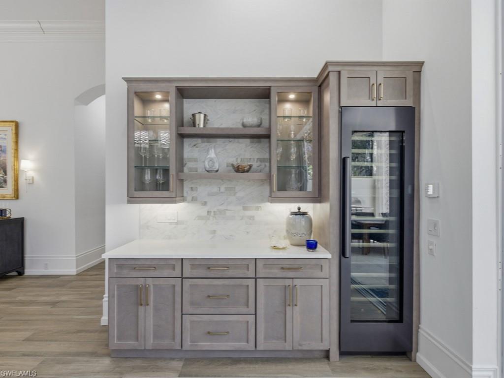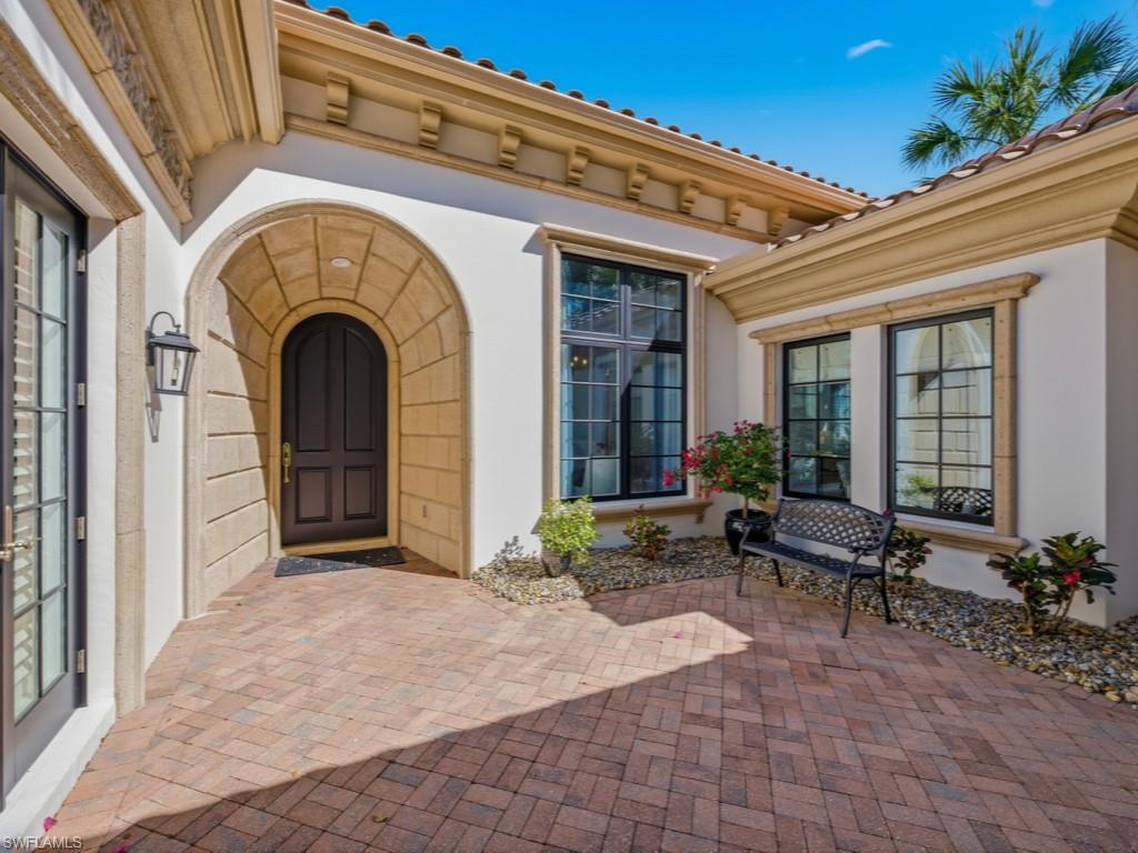 Located in the Mediterra Golf & Beach Club of Naples, on a secluded lakefront homesite within the Villoresi neighborhood, this extensively renovated single-story residence offers refined luxury, thoughtful upgrades, and timeless architectural details throughout. A private front courtyard entry sets an elegant tone, leading into light-filled interiors enhanced by soaring ceilings, arched passageways, crown moldings, and custom millwork. The expansive living room showcases dramatic 14-foot ceilings, transom windows, and pocketing sliding glass doors that seamlessly connect indoor living to the screened lanai and pool areau2014ideal for entertaining. A custom dry bar with quartz countertops, marble backsplash, display cabinetry, and a Dacor 100-bottle wine refrigerator adds both function and style. The chefu2019s kitchen is beautifully appointed with quartz countertops, a glass-tile backsplash, custom cabinetry, a GE Monogram six-burner gas cooktop with a Zephyr hood, double-wall ovens, an LG dishwasher, and a premium Dacor refrigerator and freezer. Neutral wood-inspired plank tile flooring flows throughout the home. The primary suite is a private retreat featuring a sitting area or workspace, dual custom walk-in closets with extensive built-ins, and a spa-inspired bath with dual vanities, a walk-in shower, and a Victoria & Albert freestanding soaking tub. Outdoor living is equally impressive, featuring a newly resurfaced pool and glass-tiled spa, an updated stone pool deck with leathered marble finishes, a panoramic picture-frame pool cage, and an outdoor bar with a beverage refrigerator. Additional highlights include a whole-house generator, newly installed AC systems and ductwork, an air-conditioned garage with epoxy flooring, updated landscaping and lighting, a freshly painted exterior, and a new garage door system. Mediterra is one of Naplesu2019 most prestigious luxury golf & beach club communities, offering 2 Tom Fazio championship golf courses, a private beach club w/ restaurant & bar, tennis, pickleball, bocce, a state-of-the-art fitness center, scenic biking & jogging trails, and dining at the private country club. The Mediterra beach club provides an exclusive Gulf-front escape with a 2-story, 10,000-sq-ft facility featuring indoor & outdoor dining, a heated pool, a sundeck, and full cabana beach service. THIS VILLA FURNISHED WITH EXCLUSIONS