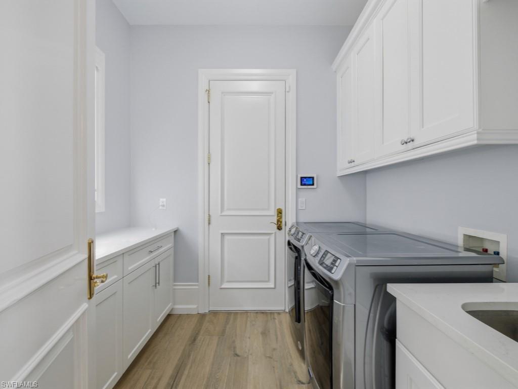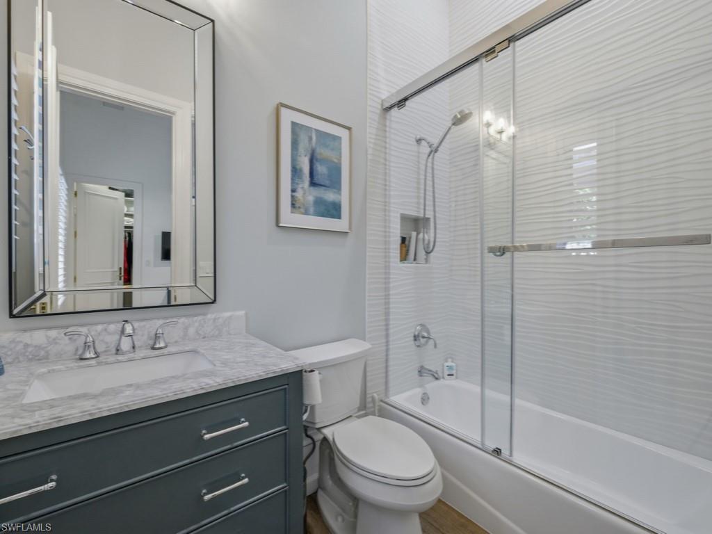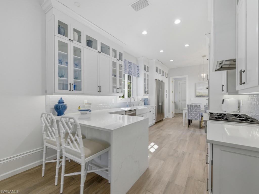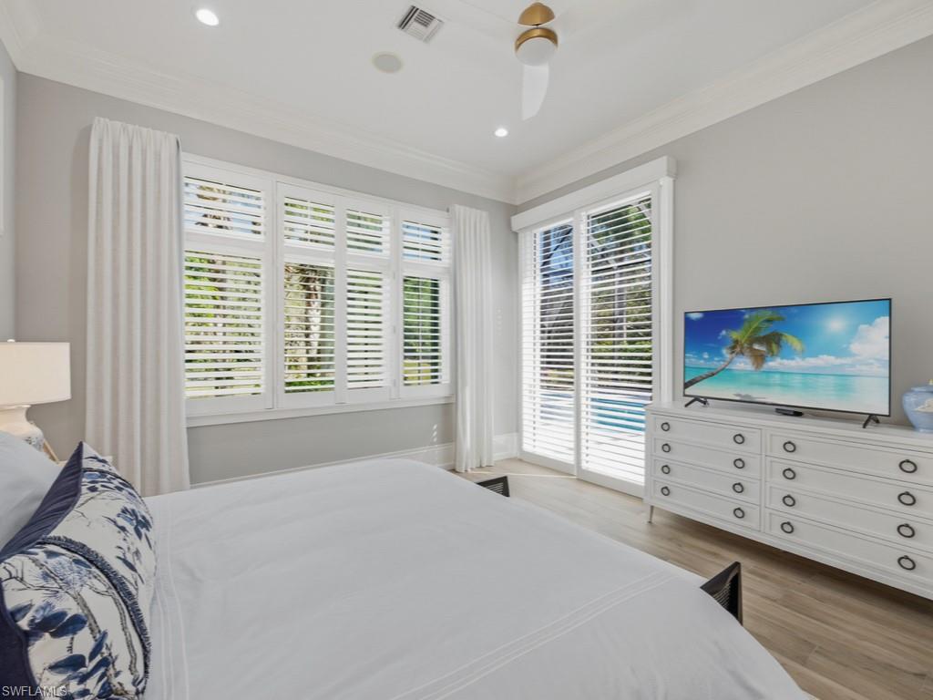 Located in the Mediterra Golf & Beach Club of Naples, on a secluded lakefront homesite within the Villoresi neighborhood, this extensively renovated single-story residence offers refined luxury, thoughtful upgrades, and timeless architectural details throughout. A private front courtyard entry sets an elegant tone, leading into light-filled interiors enhanced by soaring ceilings, arched passageways, crown moldings, and custom millwork. The expansive living room showcases dramatic 14-foot ceilings, transom windows, and pocketing sliding glass doors that seamlessly connect indoor living to the screened lanai and pool areau2014ideal for entertaining. A custom dry bar with quartz countertops, marble backsplash, display cabinetry, and a Dacor 100-bottle wine refrigerator adds both function and style. The chefu2019s kitchen is beautifully appointed with quartz countertops, a glass-tile backsplash, custom cabinetry, a GE Monogram six-burner gas cooktop with a Zephyr hood, double-wall ovens, an LG dishwasher, and a premium Dacor refrigerator and freezer. Neutral wood-inspired plank tile flooring flows throughout the home. The primary suite is a private retreat featuring a sitting area or workspace, dual custom walk-in closets with extensive built-ins, and a spa-inspired bath with dual vanities, a walk-in shower, and a Victoria & Albert freestanding soaking tub. Outdoor living is equally impressive, featuring a newly resurfaced pool and glass-tiled spa, an updated stone pool deck with leathered marble finishes, a panoramic picture-frame pool cage, and an outdoor bar with a beverage refrigerator. Additional highlights include a whole-house generator, newly installed AC systems and ductwork, an air-conditioned garage with epoxy flooring, updated landscaping and lighting, a freshly painted exterior, and a new garage door system. Mediterra is one of Naplesu2019 most prestigious luxury golf & beach club communities, offering 2 Tom Fazio championship golf courses, a private beach club w/ restaurant & bar, tennis, pickleball, bocce, a state-of-the-art fitness center, scenic biking & jogging trails, and dining at the private country club. The Mediterra beach club provides an exclusive Gulf-front escape with a 2-story, 10,000-sq-ft facility featuring indoor & outdoor dining, a heated pool, a sundeck, and full cabana beach service. THIS VILLA FURNISHED WITH EXCLUSIONS