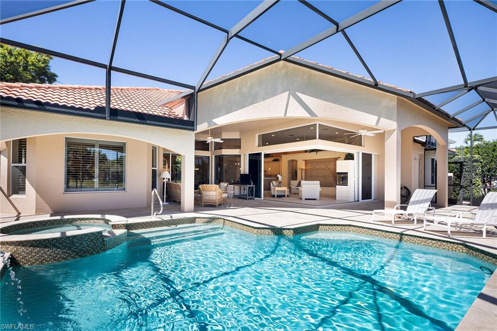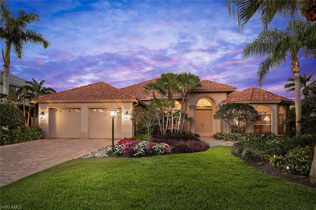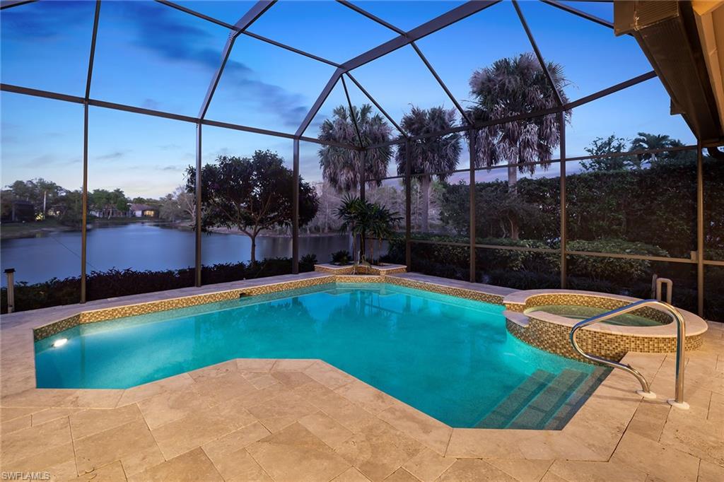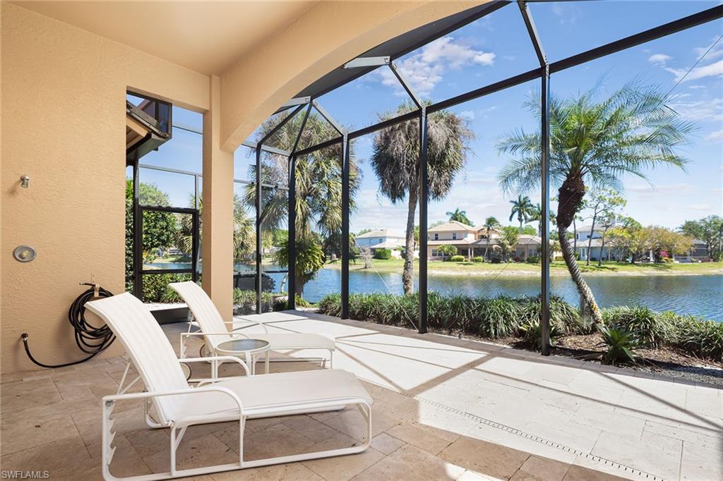 Absolutely stunning long lake views define this immaculate residence, ideally situated on a quiet, non-through street in the heart of Monterey. Widely considered one of the premier lots in the community, this home enjoys sun-drenched eastern exposure, perfect for peaceful mornings overlooking the water. The expansive outdoor living area is truly exceptional, featuring elegant stone flooring, a generous covered lanai and a beautifully refurbished pool and spa enclosed by a newer screen cage. This private retreat is ideal for both relaxing and entertaining. Inside, the home offers spacious, thoughtfully designed interiors. The guest suites provide exceptional privacy, connected by a large, enclosed hallway and featuring an ensuite bedroom. The inviting gathering room flows seamlessly from the renovated kitchen, complete with a gas cooktop, and opens to the outdoor space through a dramatic negative-edge sliding glass wall. A fireplace and a striking mitered window in the dining area add warmth and architectural interest. With 12-foot flat ceilings and 8-foot doors throughout, the home feels open, airy and contemporary. The meticulously maintained landscaping creates a welcoming first impression, while practical upgrades, including a newer roof, newer cage, immaculate garage and a 500-gallon buried propane tank, enhance both comfort and value. This is a rare opportunity to own a special home on one of Montereyu2019s finest lots. Monterey is an active, sought-after community less than three miles to the beach, Mercato and Waterside. Amenities include a 24-hour guarded gatehouse, renovated clubhouse, newer fitness center, billiards, heated lap pool, basketball and pickleball court, new play area, active tennis with a pro and three lighted Har-Tru tennis courts. A-rated public schools and three excellent private schools within three miles.